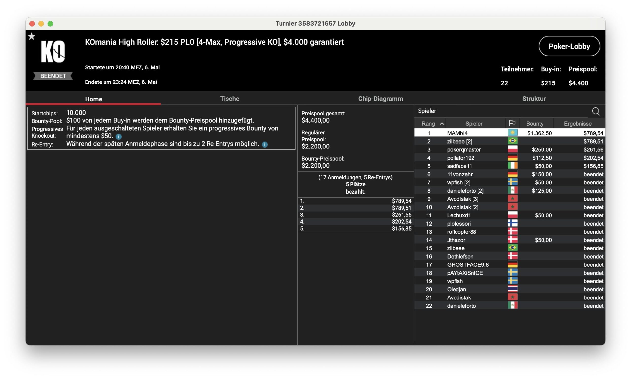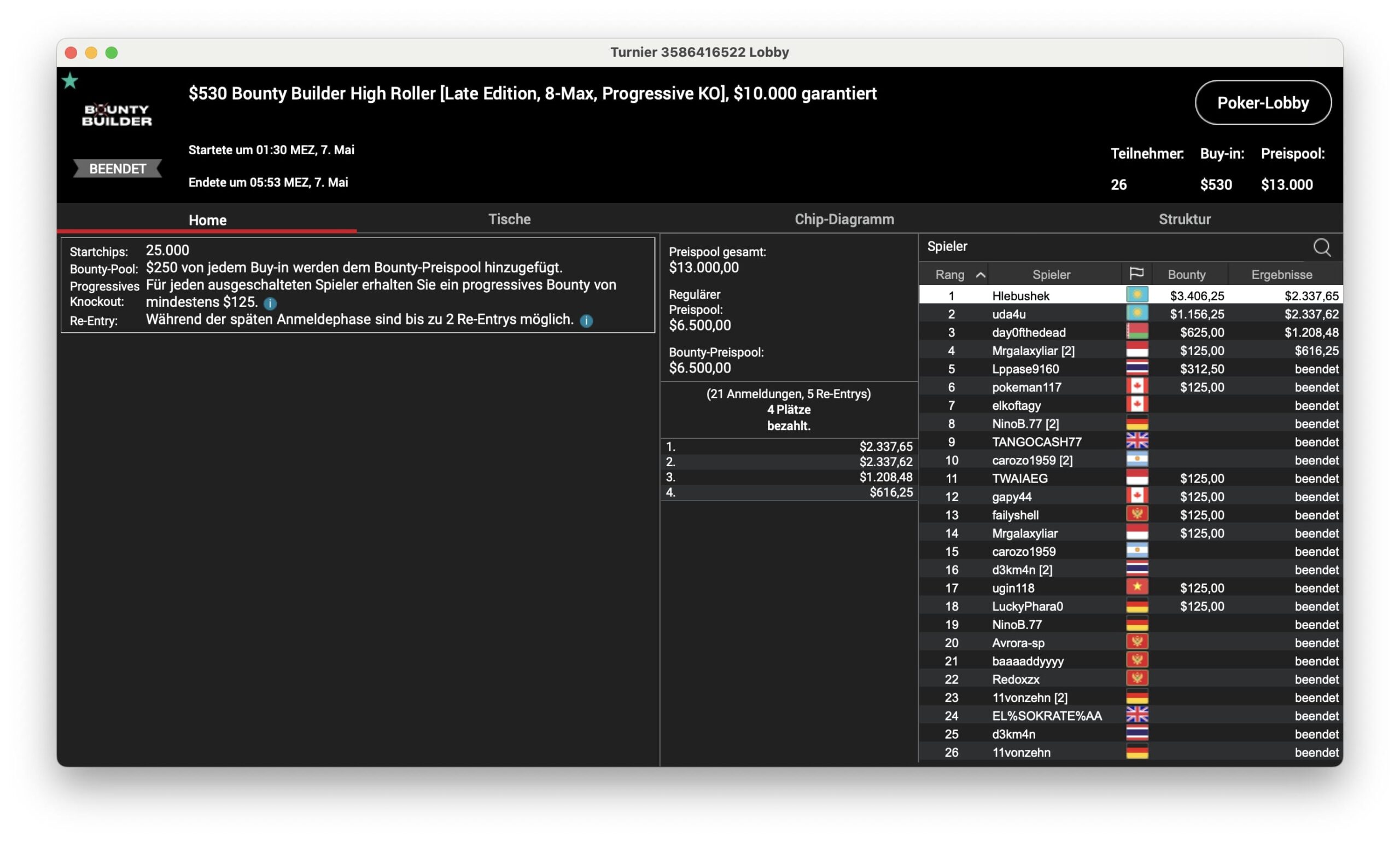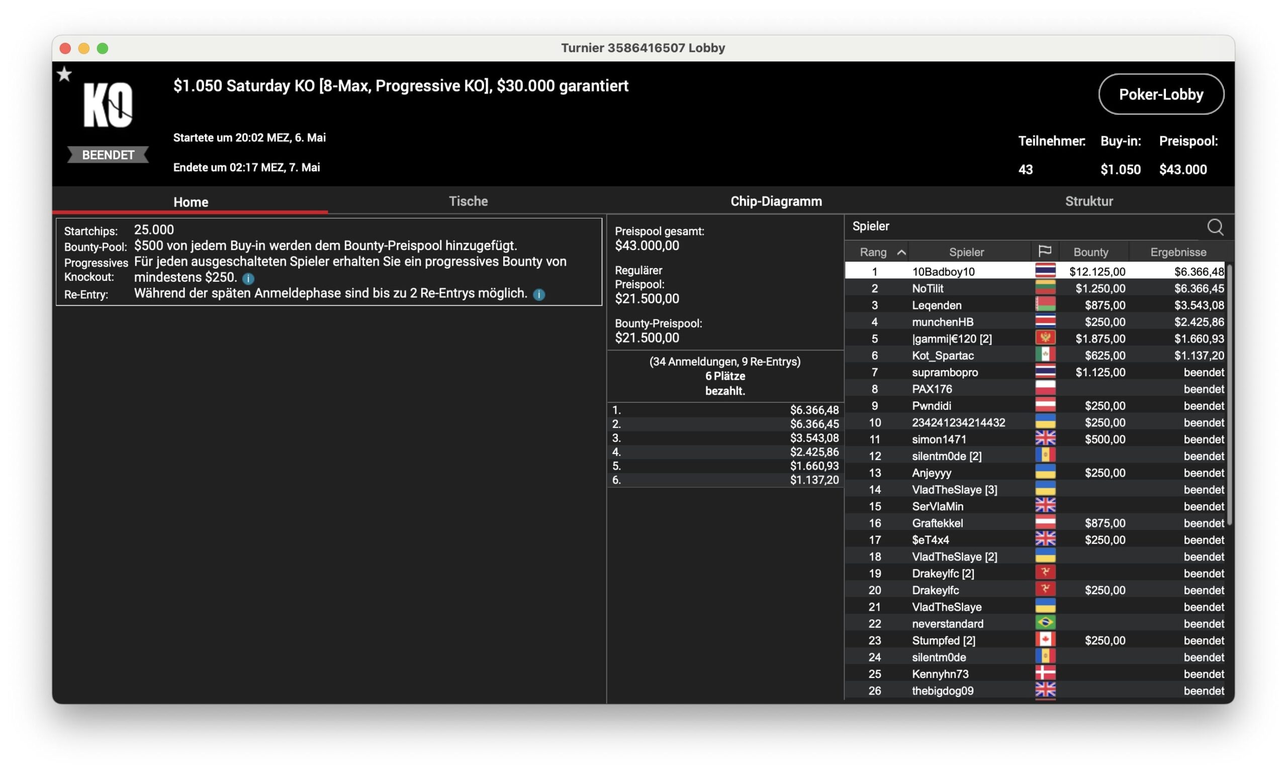 Das $1.050 Saturday KO hatte am Samstag 43 Entries und damit einen $43.000 Preispool. „10Badboy10“ gewann und sammelte einige Bounties ein: Alleine $12.125 gewann er mit KOs, für die Siegplatzierung gab es nochmal $6.366 on top.