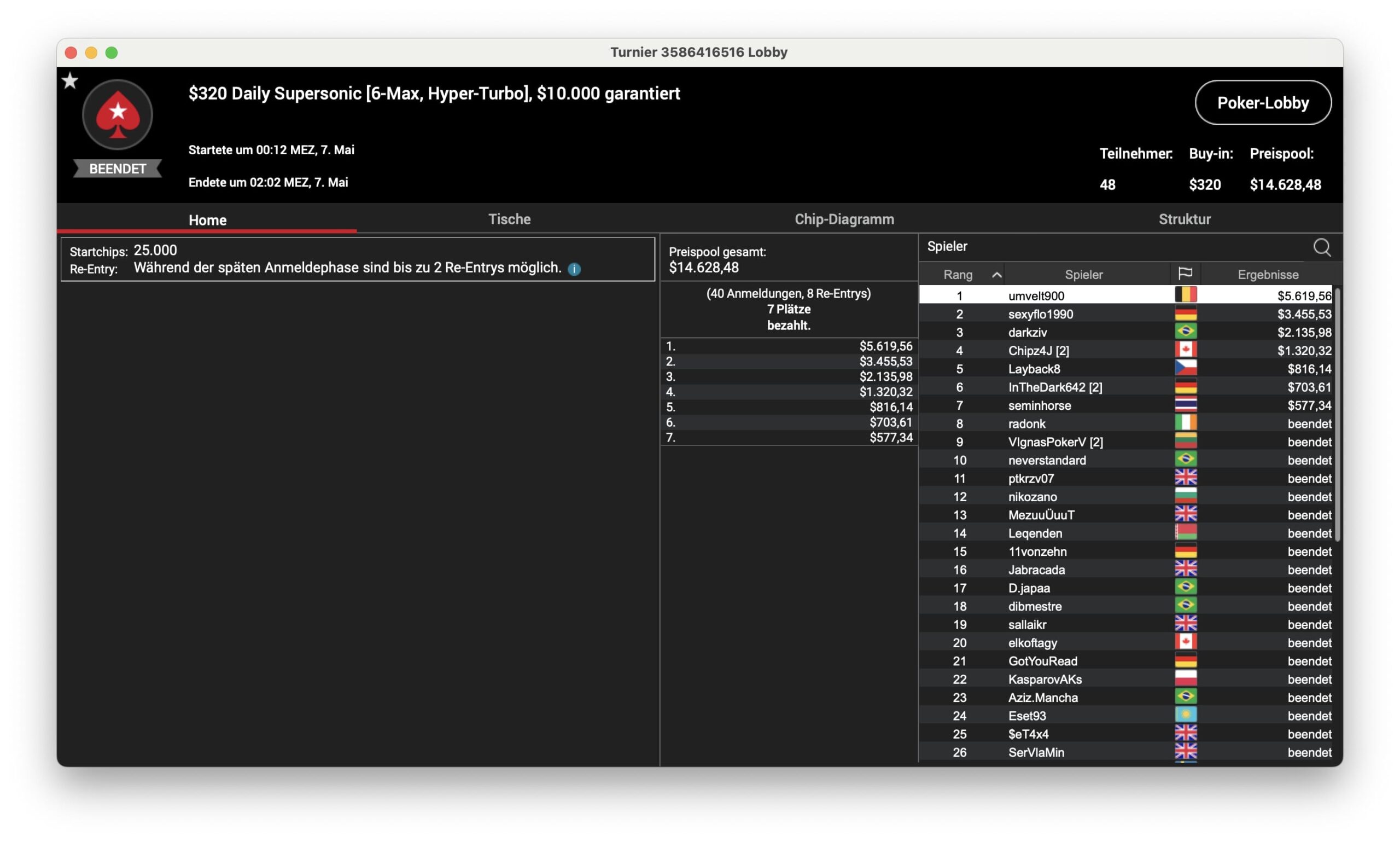 Beim Daily Supersonic traten 48 Spieler an, $14.628 lagen im Preispool. „umvelt900“ Sieg brachte $5.619 ein. Runner-Up wurde der deutsche Spieler „sexyflo1990“ für $3.455.