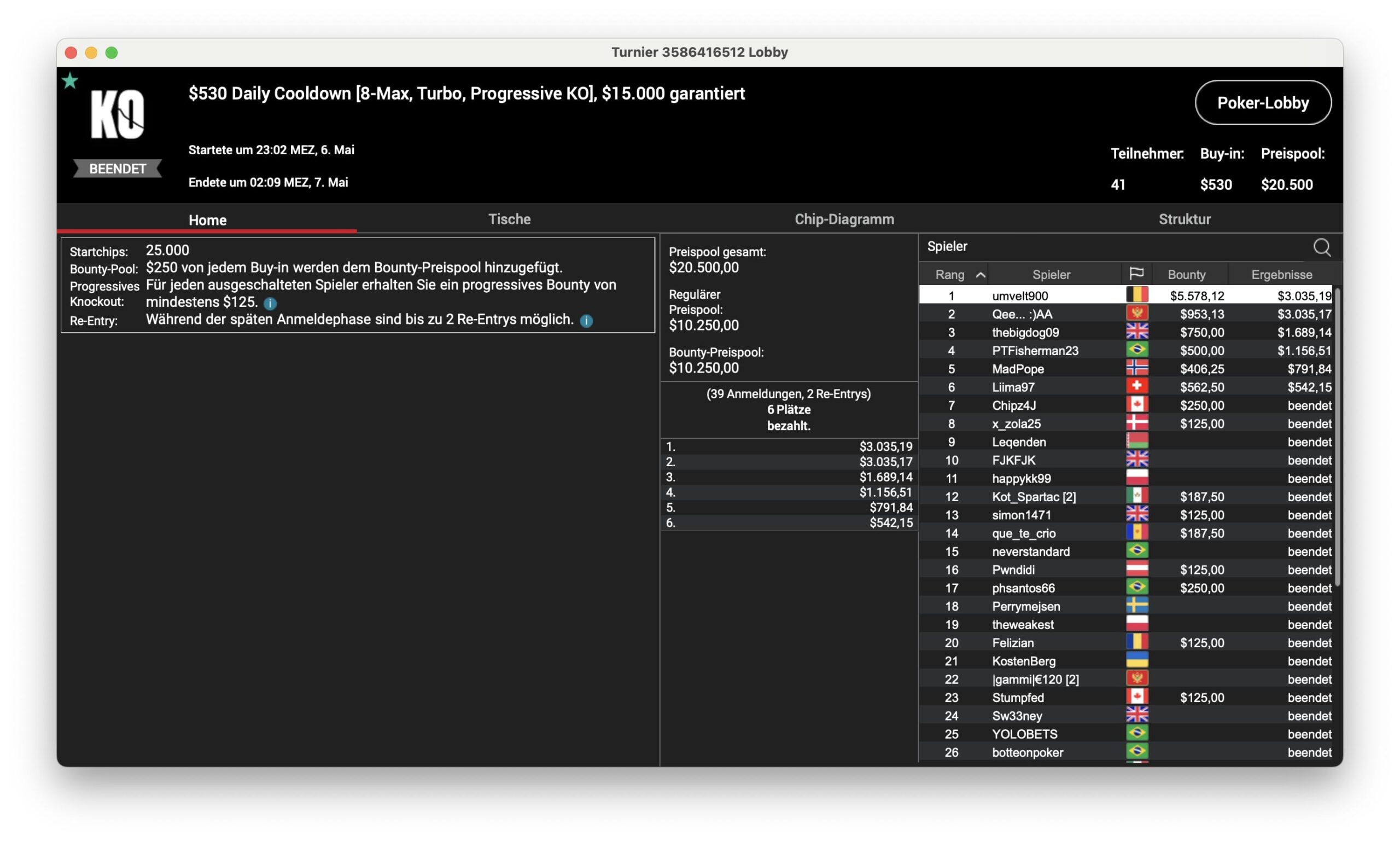 Das Daily Cooldown empfing 41 Entries und häufte so $20.500 Preispool an. Hier wurde der Sieg des Belgiers mit $5.578 + $3.035 belohnt.