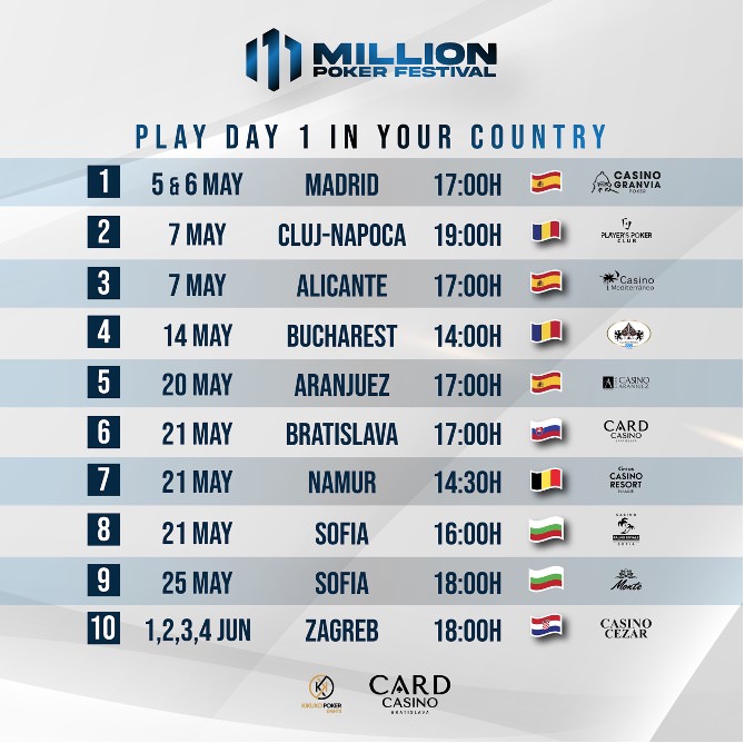 Für das Main Event kann man sich natürlich auch während des Festivals im Juni im CC Bratislava qualifizieren, aber auch über ganz Europa verteilt – vielleicht auch direkt vor der Haustür. In mindestens 10 Städten, und 5 Ländern wird man einen Tag 1 zum Main Event mit einem Buy-In von €350 spielen können, verteilt über Belgien, Spanien, Rumänien, Bulgarien, Kroatien und die Slowakei. – Diese Locations und Daten für Day 1 vom Million Poker Festival M.E. sind bereits bestätigt, und es sollen noch mehr werden: