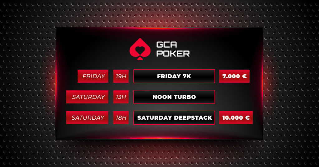 Am Samstag geht es im GCA Pokerroom um 13:00 Uhr mit dem €44+€6 Noon Turbo los. Hier startet man mit 15.000 in Chips und jeder Level dauert 15 Minuten. Zwei Re-Entries sind möglich und die Late-Registration ist bis 14:15 Uhr geöffnet.