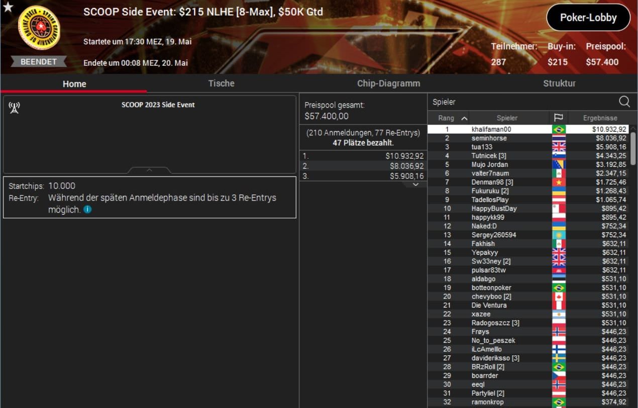 | SO | 21.05.23 | 14:15 | SCOOP 76 M: $215 NLO8 [6-Max,][Progressive][KO], $80K Gtd |