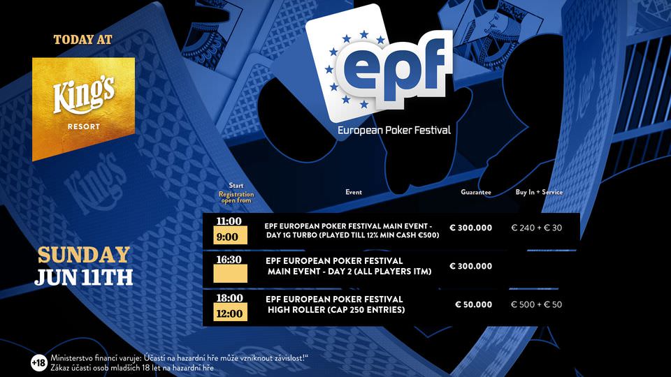 Im King’s Resort Rozvadov gibt es am Sonntagvormittag ab 11:00 Uhr die letzte Möglichkeit in den €240+€30 European Poker Festival (EPF) Main Event beim Turbo Flight 1g einzusteigen und um die garantierten €300.000 (inklusive vier €10.350 WSOP Europe Main Event Tag 1a Tickets) mitzuspielen. Man startet mit 50.000 in Chips und die Blinds werden alle 12 Minuten erhöht. Zwei Re-Entries sind möglich und die Late-Registration ist bis zum Start von Level 10 geöffnet. Es wird solange gespielt bis noch 12 % der Entries im Turnier sind. Jeder der sich für Tag 2 qualifiziert, bekommt automatisch den Min-Cash von €500 gutgeschrieben.