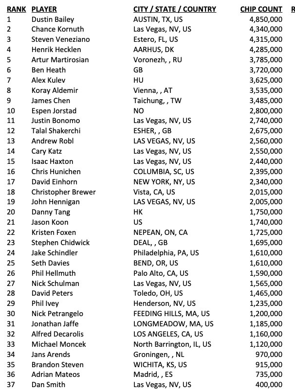 Definitiv wiedersehen werden wir die 37 Spieler, die am Ende des Spieltages Chips eintüten konnten. Dazu gehören der niederländische Wahl-Österreicher und frischgebackene Bracelet-Gewinner Jans Arends (970.000), Phil Ivey (1.235.000), Nick Schulman (1.565.000), Stephen Chidwick (1.695.000), Kristen Foxen (1.725.000) oder Jason Koon (1.740.000). Auch Isaac Haxton (2.440.000), Cary Katz (2.550.000) oder Talal Shakerchi (2.675.000) sind weiter mit dabei. Ganz vorne im Chipcount liegt überraschenderweise der US-Amerikaner Dustin Bailey, der neben Phil Ivey Platz nahm und sich den ganzen Tag über konstant mit ihm anlegte – ein Wunder, dass beide den Tag überstanden, mit dem besseren Ende für Bailey (4.850.000).