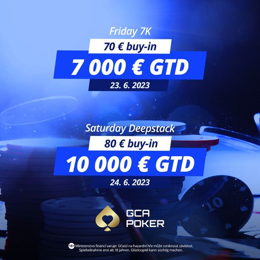 Am Freitag steht im GCA Pokerroom ab 19:00 Uhr das €61+€9 Friday 7k Event auf dem Programm, bei dem €7.000 garantiert werden. Es geht los mit 20.000 in Chips und jeder Level dauert 20 Minuten. Zwei Re-Entries sind möglich und die Late-Registration ist bis 22:30 Uhr geöffnet. Ab 21:00 Uhr gibt es auch einen Livestream vom Turnier.