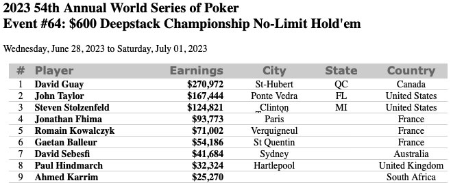 gecallt wurde. Die Herz-6 war eine der Karten im Board, das sonst keinem mehr weiterhalf. Damit wurde John Taylor für $167.483 Runner-Up, während der Kanadier David Guay am kanadischen Nationalfeiertag unter frenetischem Jubel der zahlreichen kanadischen Railbirds $271.032 und sein 1. Gold Bracelet gegen 4.302 Mitstreiter gewann.