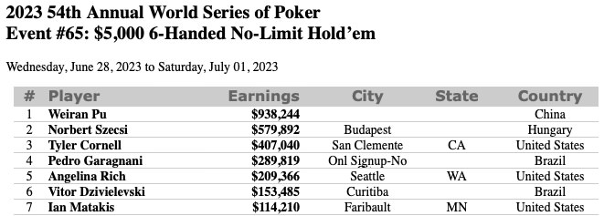 6 Spieler kamen am Samstag zurück an den Final Table im $5k 6-max NLH Event #65. Aus dem Preispool von $5.515.400 war allen ein Payout von $153.485 bereits sicher. Für den Sieg gab es mit $928.244 jedoch ein Vielfaches davon. Als Chipleader waren der letzte Europäer, Norbert Szecsi (93 BBs), und die US-Amerikanerin Angelina Rich (70 BBs) ins Rennen gegangen, Weiran Pu aus China folgte mit 52 BBs.