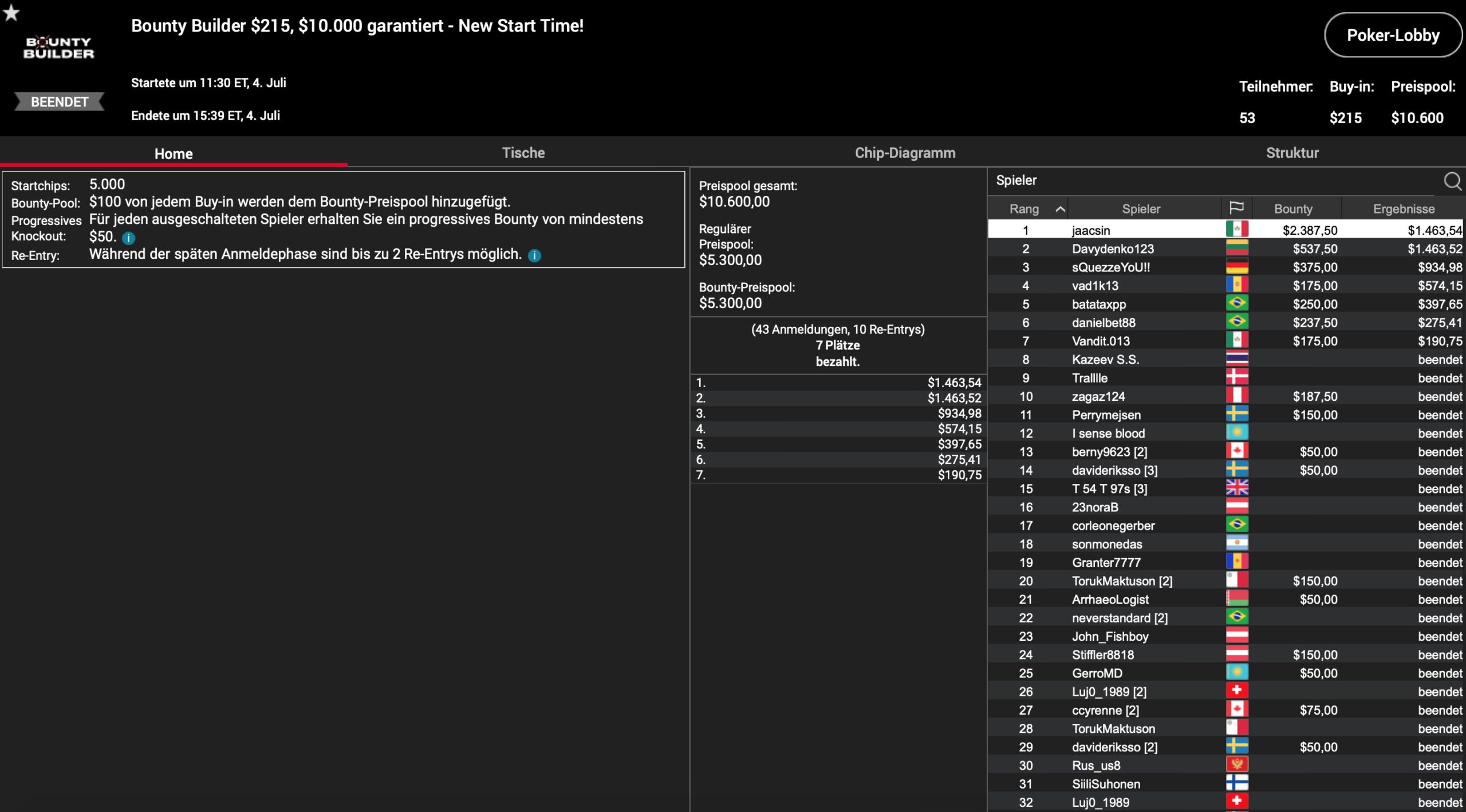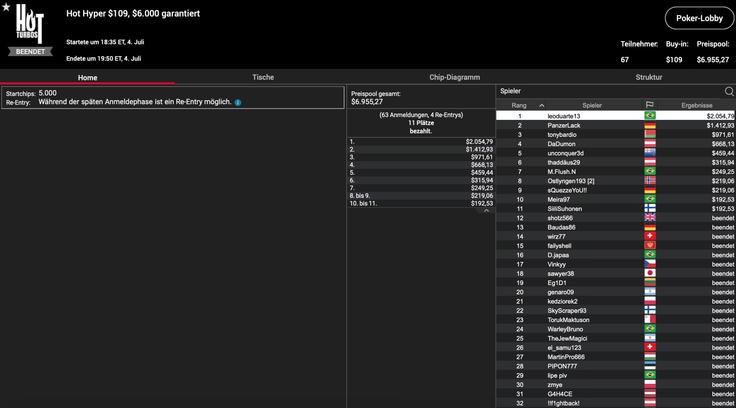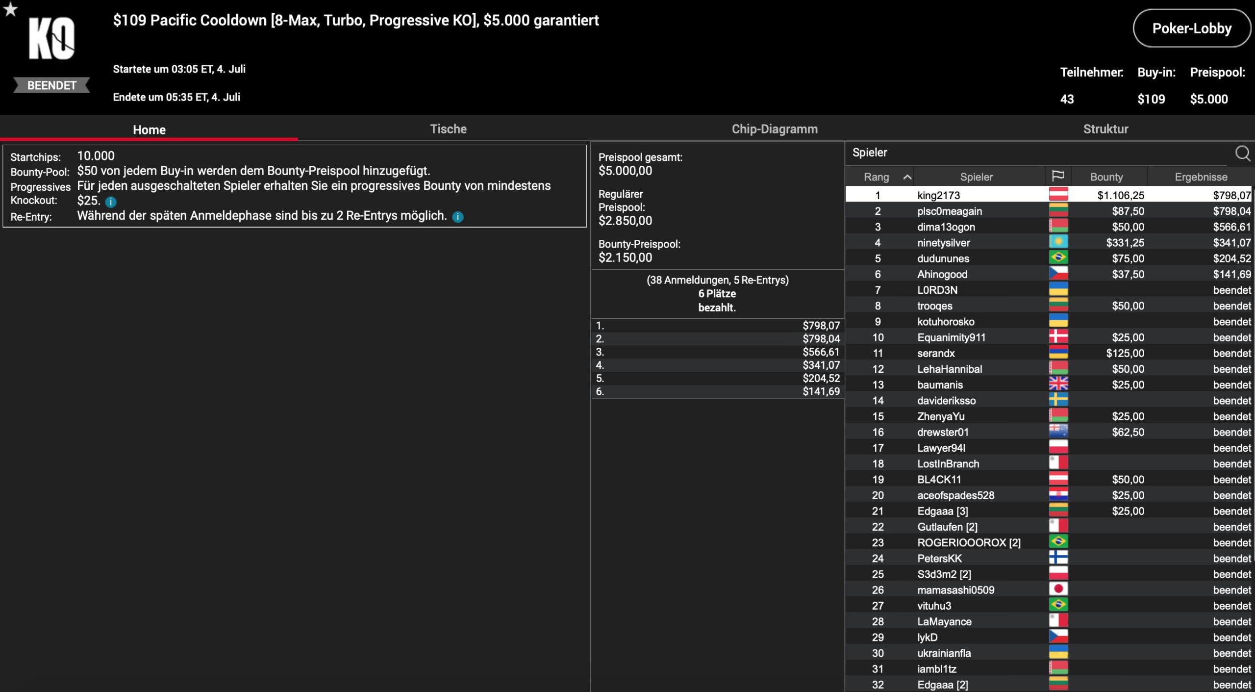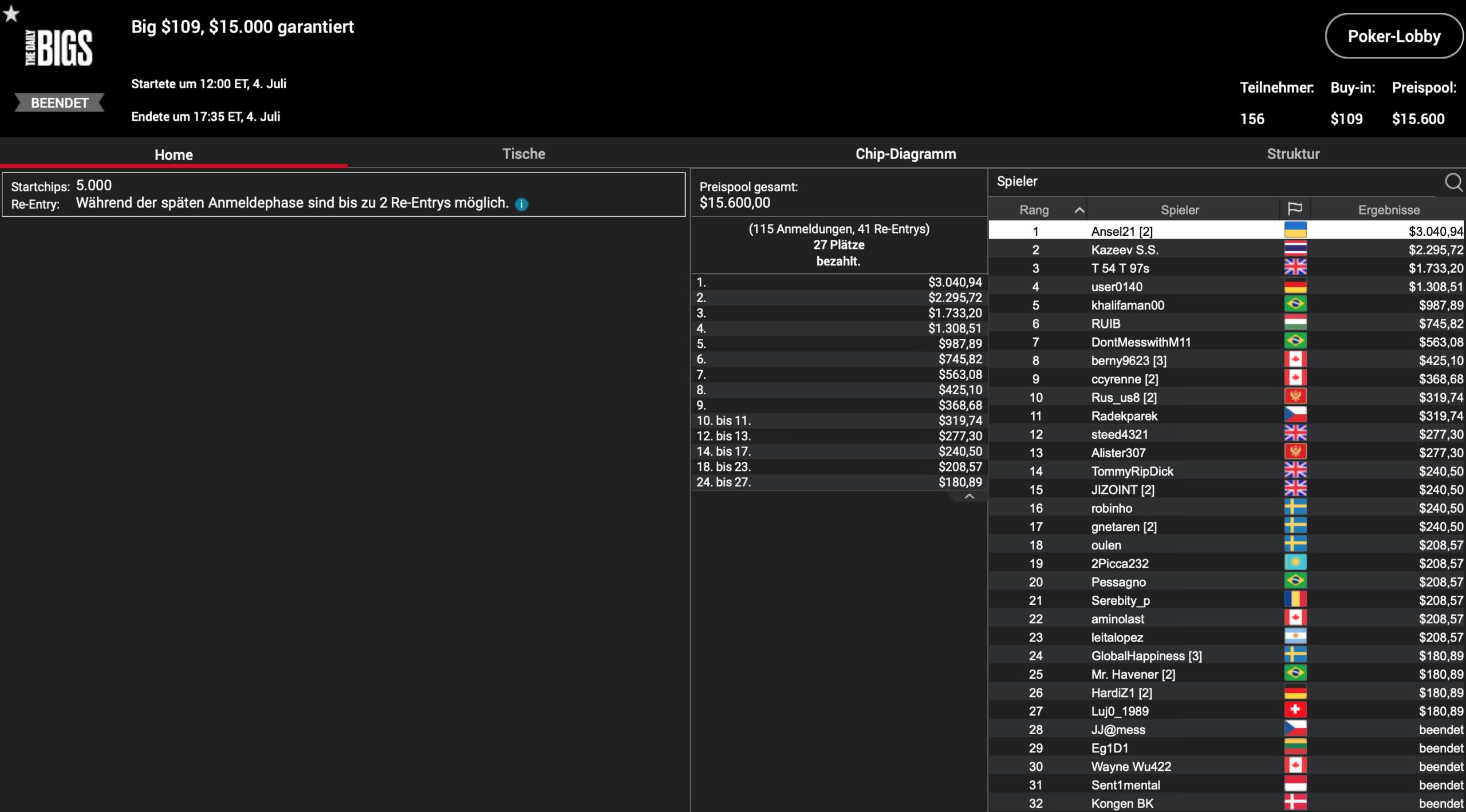 Auch die Runner-Up-Plätze oder Deep Runs mit essentiellen Cashes aus der D-A-CH-Community konnten sich im Dienstag Grind sehen lassen: „sQuezzeYoU!!“ (GER) wurde 3. im Bounty Builder $215 ($1.310), „user0140“ (GER) landete auf Platz 4 im Big $109 ($1.308), „dfawm“ (AUT) wurde 4. beim Sieg seiner Landsfrau im $109 Mini Super Tuesday ($3.121), „UT23HS“ (GER) landete ebenfalls auf Platz 4 im $109 Fenomeno ($2.012), „ginolatino“ (GER) machte den D-A-CH-Doppelsieg als Runner-Up im $109 Daily Cooldown perfekt ($3.047), „PanzerLack“ (GER) wurde in einem Turnier mit weiteren Top-D-A-CH-Resultaten 2. im Hot Hyper $109 ($1.412), und „rene1984tsv“ (AUT) beendete den erfolgreichen High Roller Turniertag für die deutschsprachige Pokercommunity als 3. im Bounty Builder $162 ($1.362).