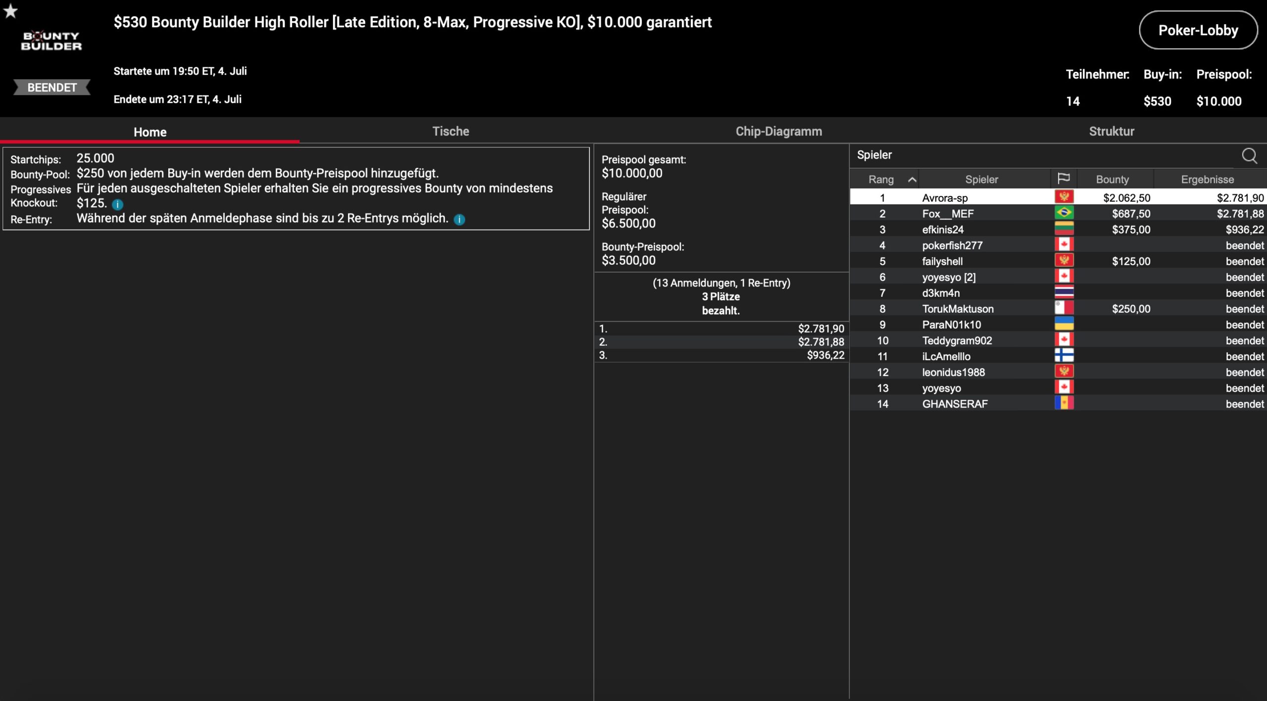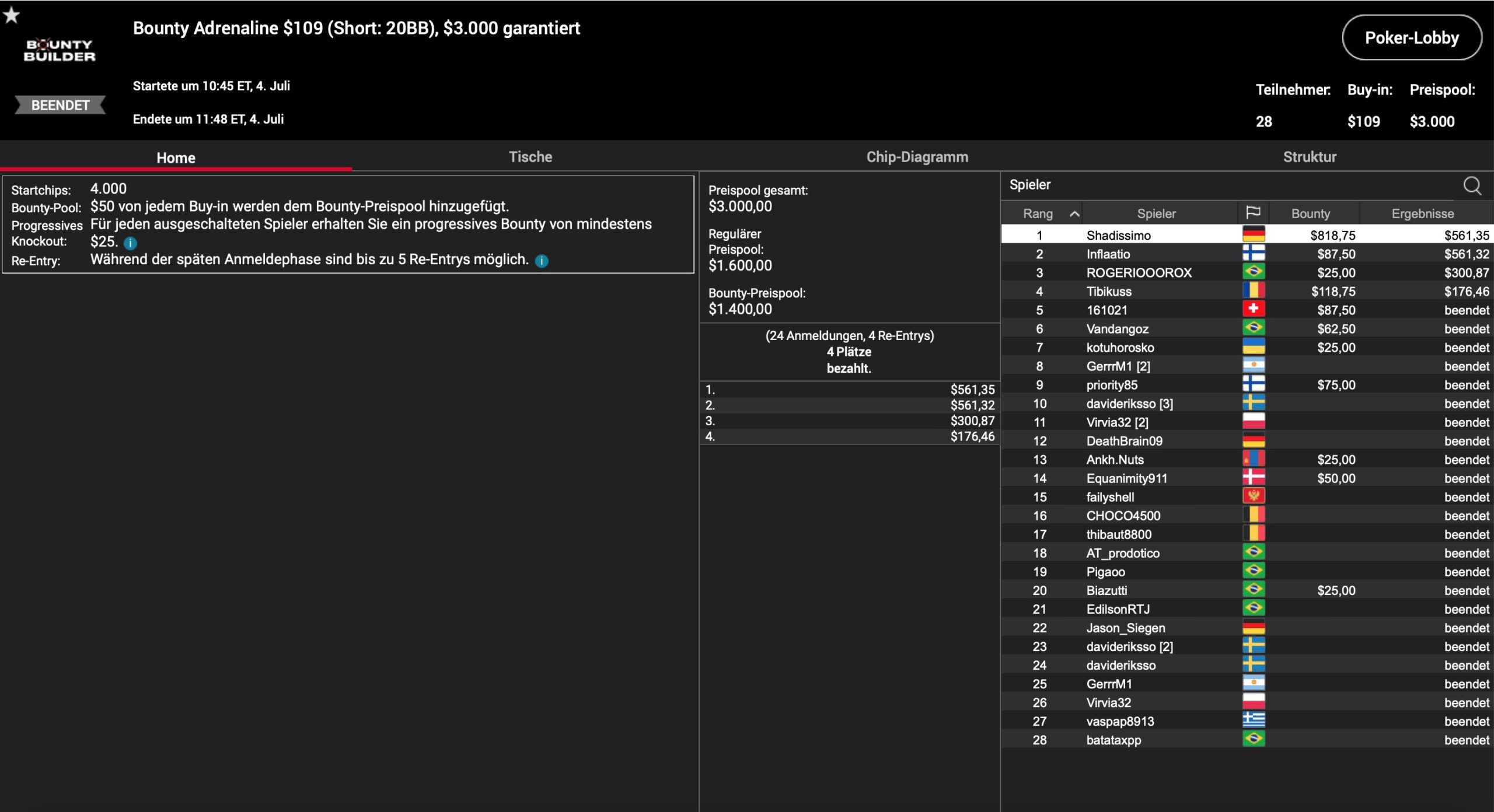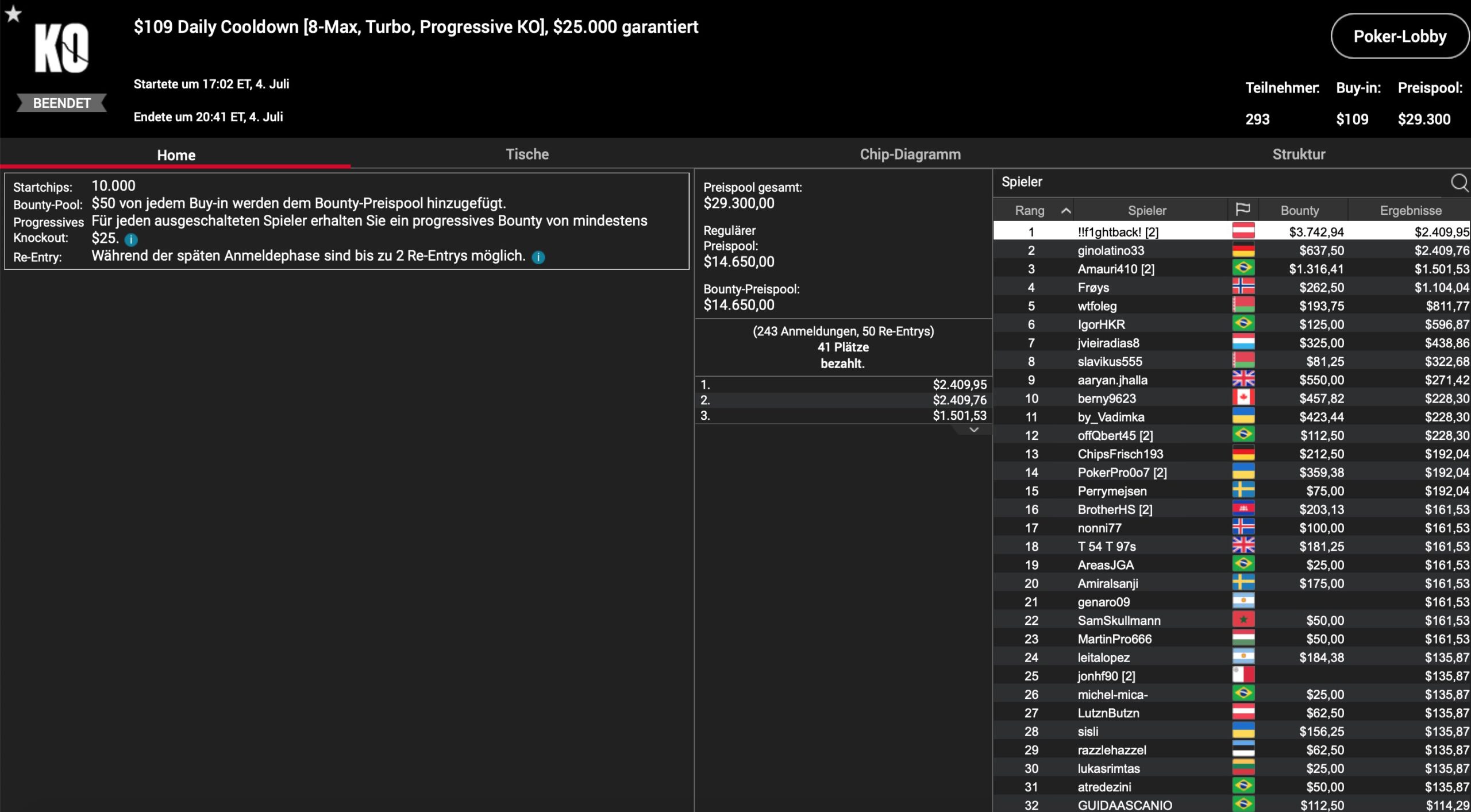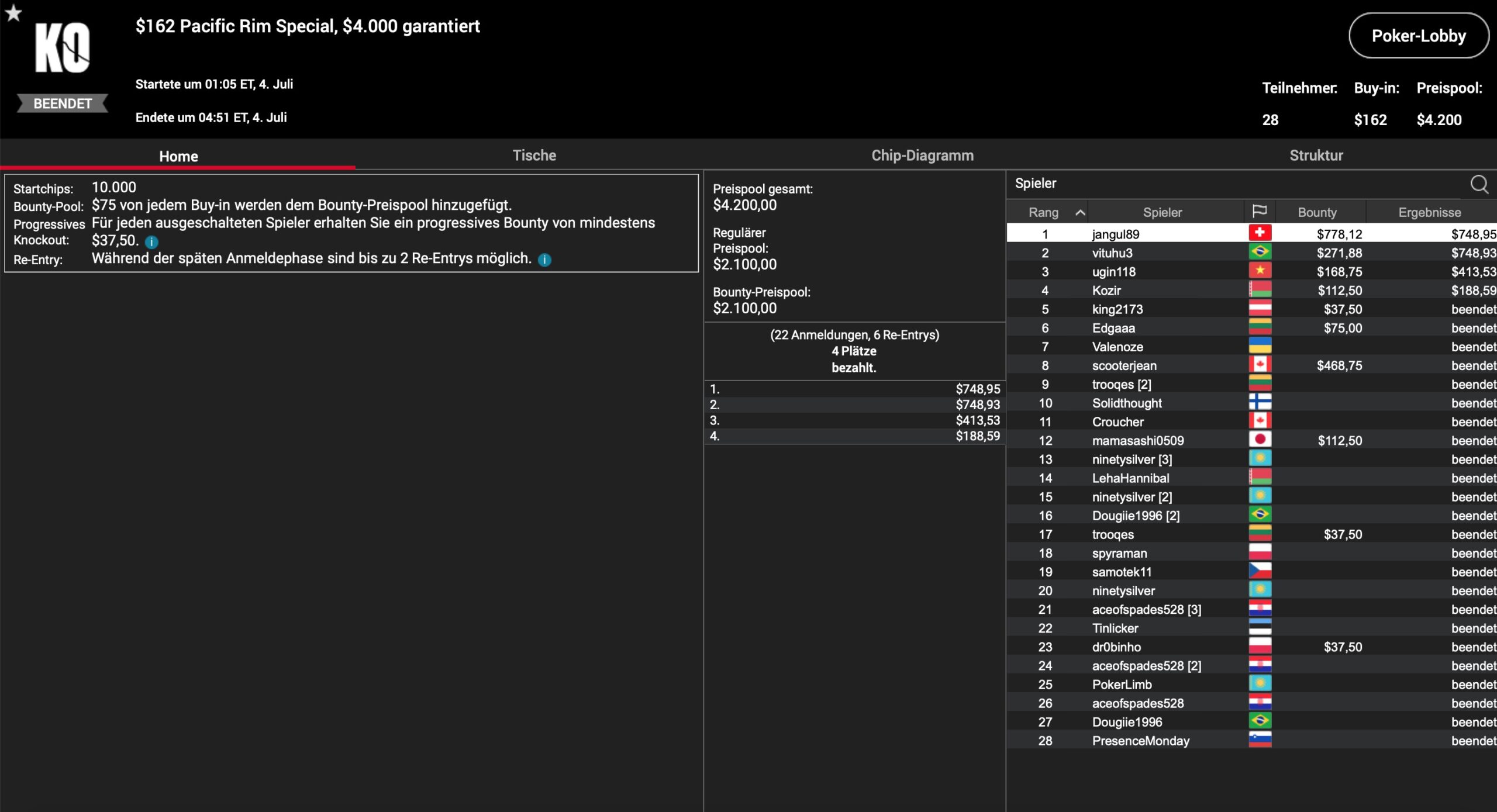 Auch die Runner-Up-Plätze oder Deep Runs mit essentiellen Cashes aus der D-A-CH-Community konnten sich im Dienstag Grind sehen lassen: „sQuezzeYoU!!“ (GER) wurde 3. im Bounty Builder $215 ($1.310), „user0140“ (GER) landete auf Platz 4 im Big $109 ($1.308), „dfawm“ (AUT) wurde 4. beim Sieg seiner Landsfrau im $109 Mini Super Tuesday ($3.121), „UT23HS“ (GER) landete ebenfalls auf Platz 4 im $109 Fenomeno ($2.012), „ginolatino“ (GER) machte den D-A-CH-Doppelsieg als Runner-Up im $109 Daily Cooldown perfekt ($3.047), „PanzerLack“ (GER) wurde in einem Turnier mit weiteren Top-D-A-CH-Resultaten 2. im Hot Hyper $109 ($1.412), und „rene1984tsv“ (AUT) beendete den erfolgreichen High Roller Turniertag für die deutschsprachige Pokercommunity als 3. im Bounty Builder $162 ($1.362).