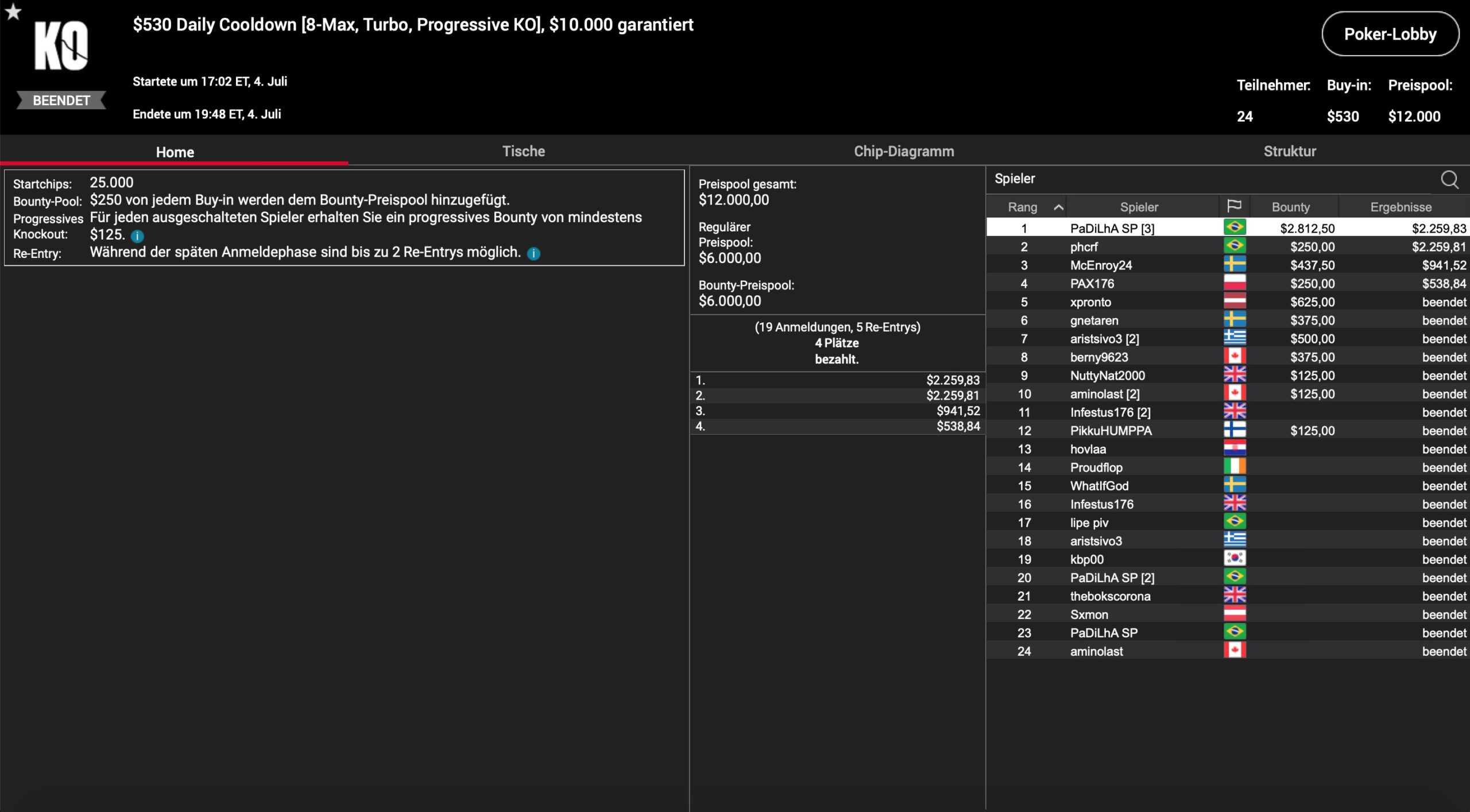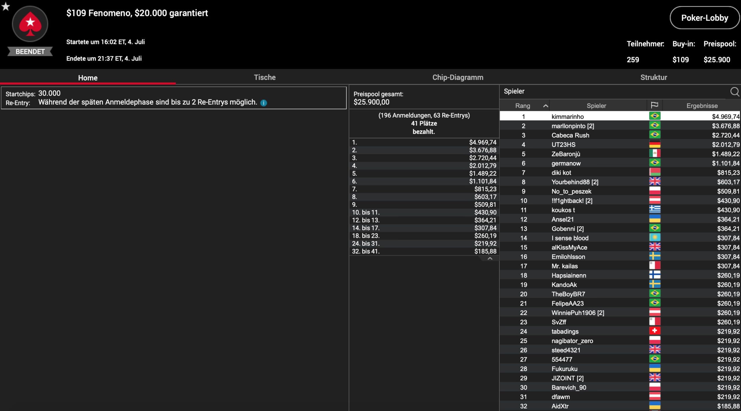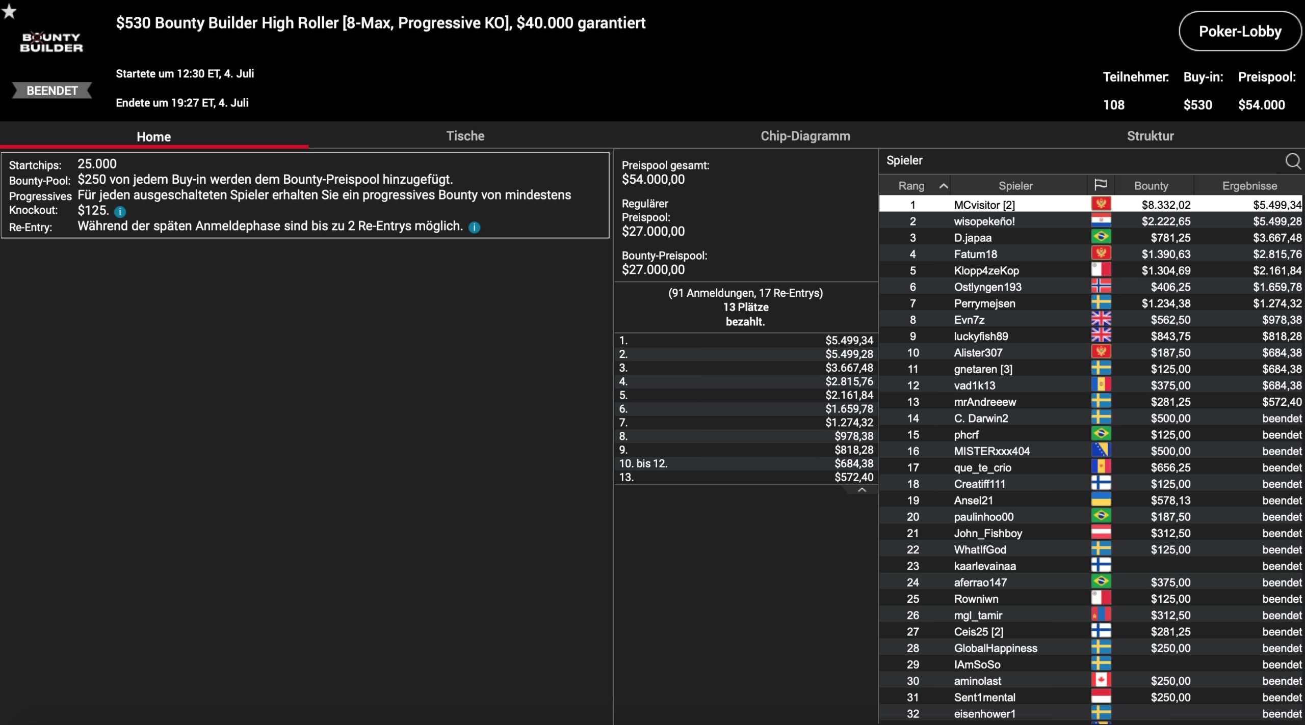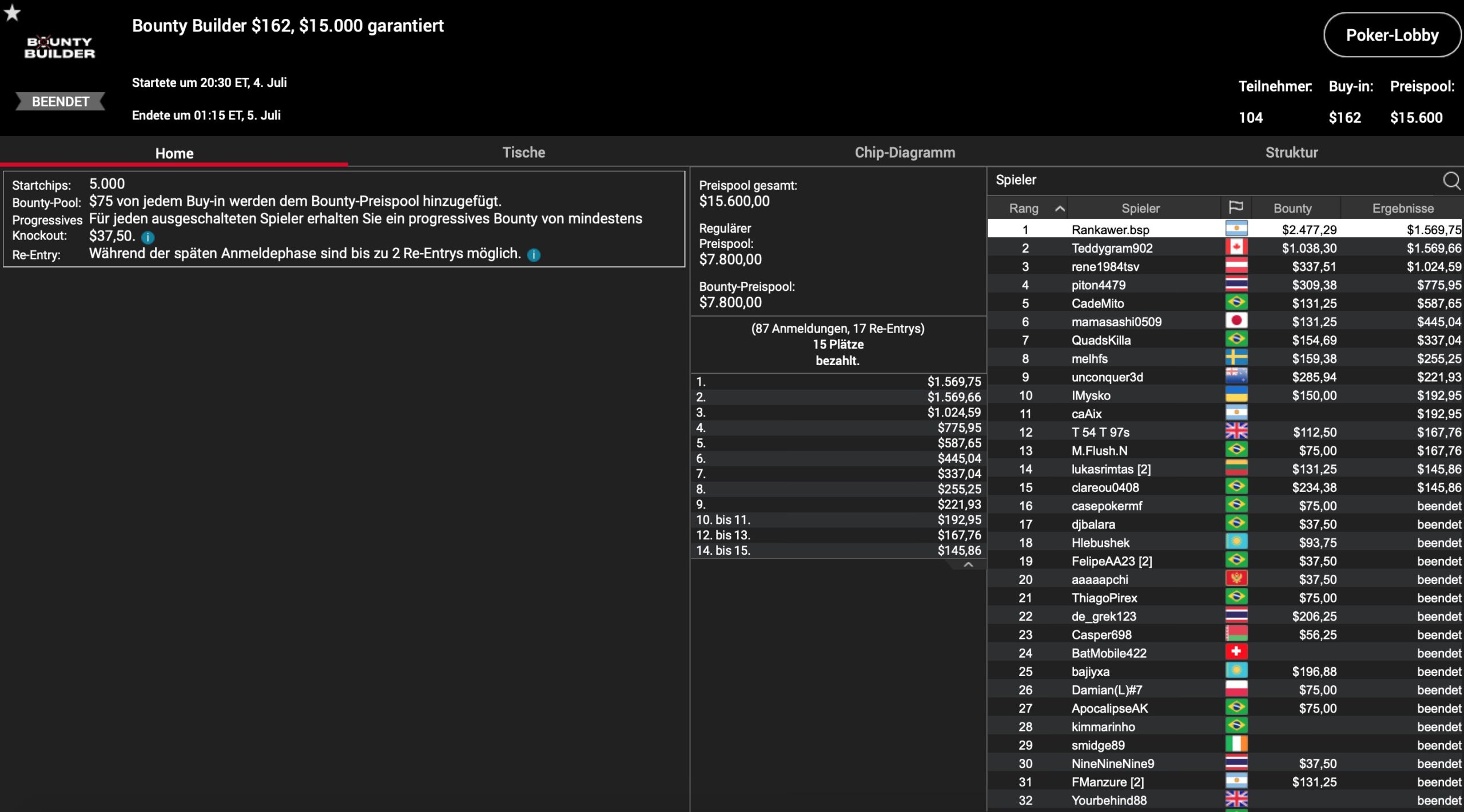 Auch die Runner-Up-Plätze oder Deep Runs mit essentiellen Cashes aus der D-A-CH-Community konnten sich im Dienstag Grind sehen lassen: „sQuezzeYoU!!“ (GER) wurde 3. im Bounty Builder $215 ($1.310), „user0140“ (GER) landete auf Platz 4 im Big $109 ($1.308), „dfawm“ (AUT) wurde 4. beim Sieg seiner Landsfrau im $109 Mini Super Tuesday ($3.121), „UT23HS“ (GER) landete ebenfalls auf Platz 4 im $109 Fenomeno ($2.012), „ginolatino“ (GER) machte den D-A-CH-Doppelsieg als Runner-Up im $109 Daily Cooldown perfekt ($3.047), „PanzerLack“ (GER) wurde in einem Turnier mit weiteren Top-D-A-CH-Resultaten 2. im Hot Hyper $109 ($1.412), und „rene1984tsv“ (AUT) beendete den erfolgreichen High Roller Turniertag für die deutschsprachige Pokercommunity als 3. im Bounty Builder $162 ($1.362).