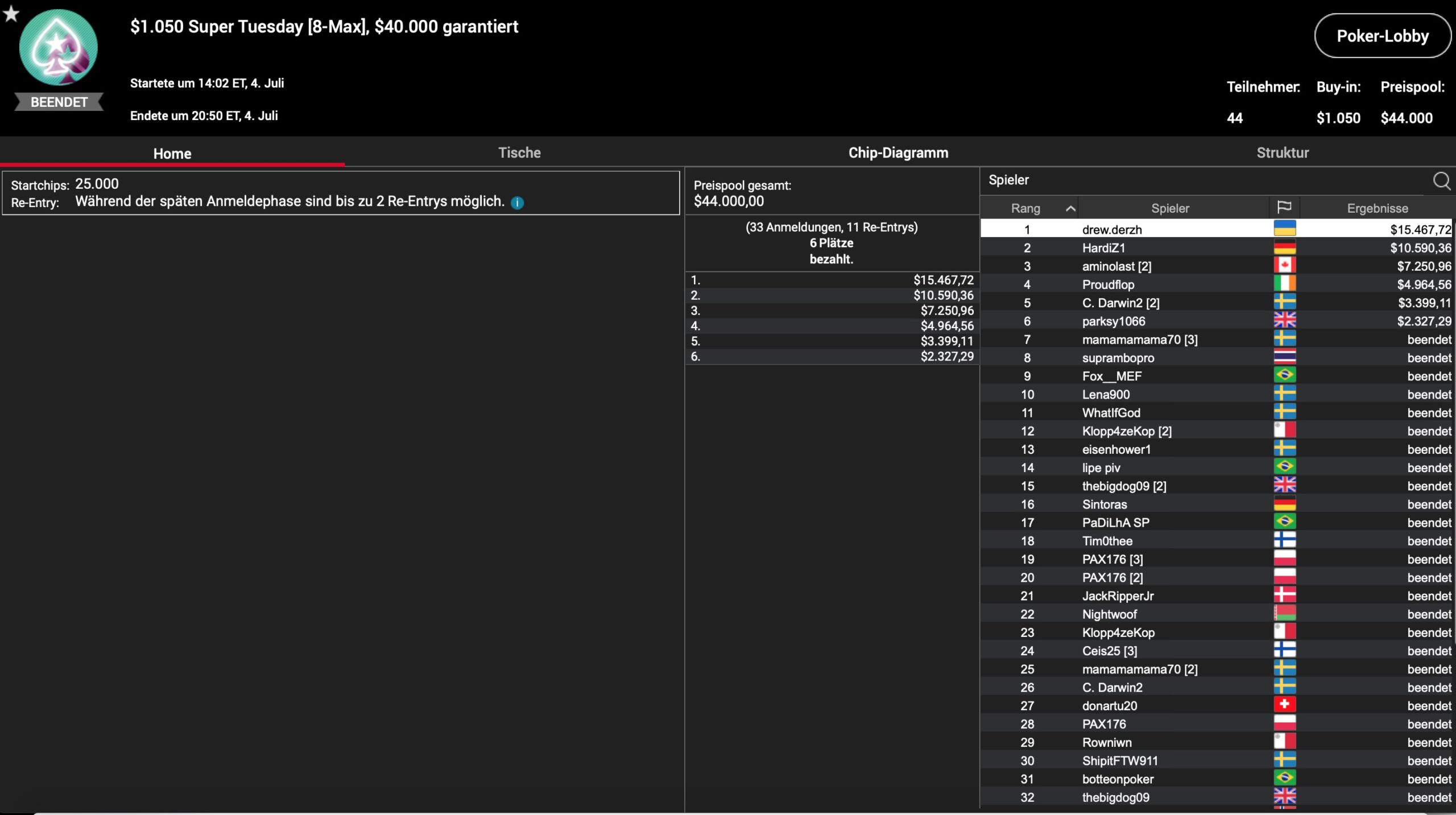 Hier punktete „HardiZ1“ für die deutschsprachige Pokercommunity als Runner-Up im teuersten PokerStars Turnier des Tages, dem $1.050 Super Tuesday. In dem Teilnehmerfeld mit 44 Total Entries beendete er das 8-Max Turnier nach fast 7 Stunden Spielzeit auf Platz 2 für $10.590. Der Sieg ging an „drew.derzh“ aus der Ukraine zusammen mit einer Siegprämie von $15.467.