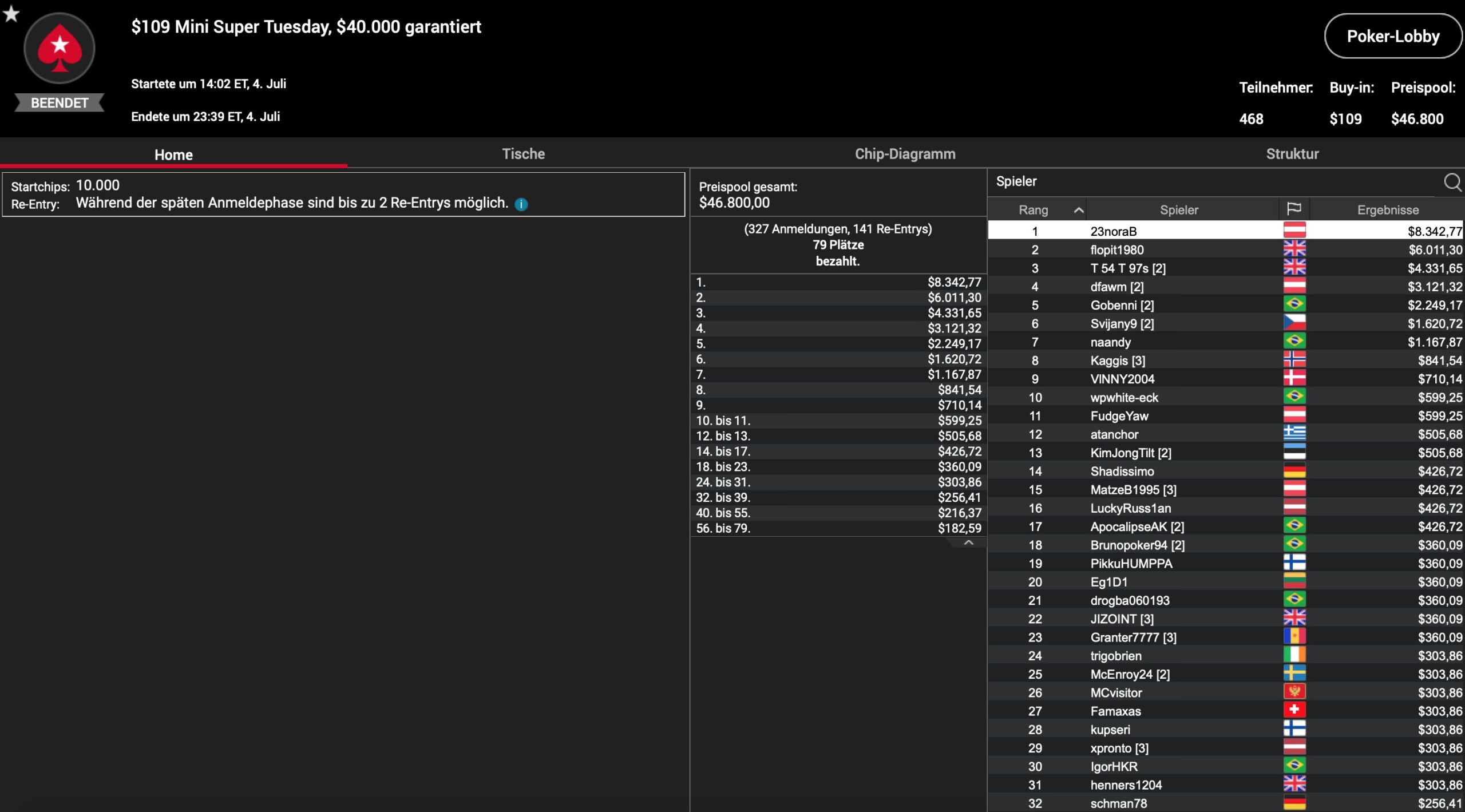 Auf den höchsten Buy-In Leveln auf PokerStars konnte die D-A-CH-Community in den Online Poker Turnieren am Dienstag einen 2. Platz durch „HardiZ1“ im $1.050 Super Tuesday erzielen. Unter 44 (33+11) Total Entries landete der deutsche High Roller Regular für ein Preisgeld von $10.590 auf Platz 2. – Auf den Buy-In Levels zwischen $100 und $500 gab es viele deutschsprachige Turniererfolge. Unter anderem durch „23noraB“, die für $8.342 die kleinere Version des Super Tuesday, das $109 Mini Super Tuesday, unter 468 Teilnehmern für $8.342 gewann.