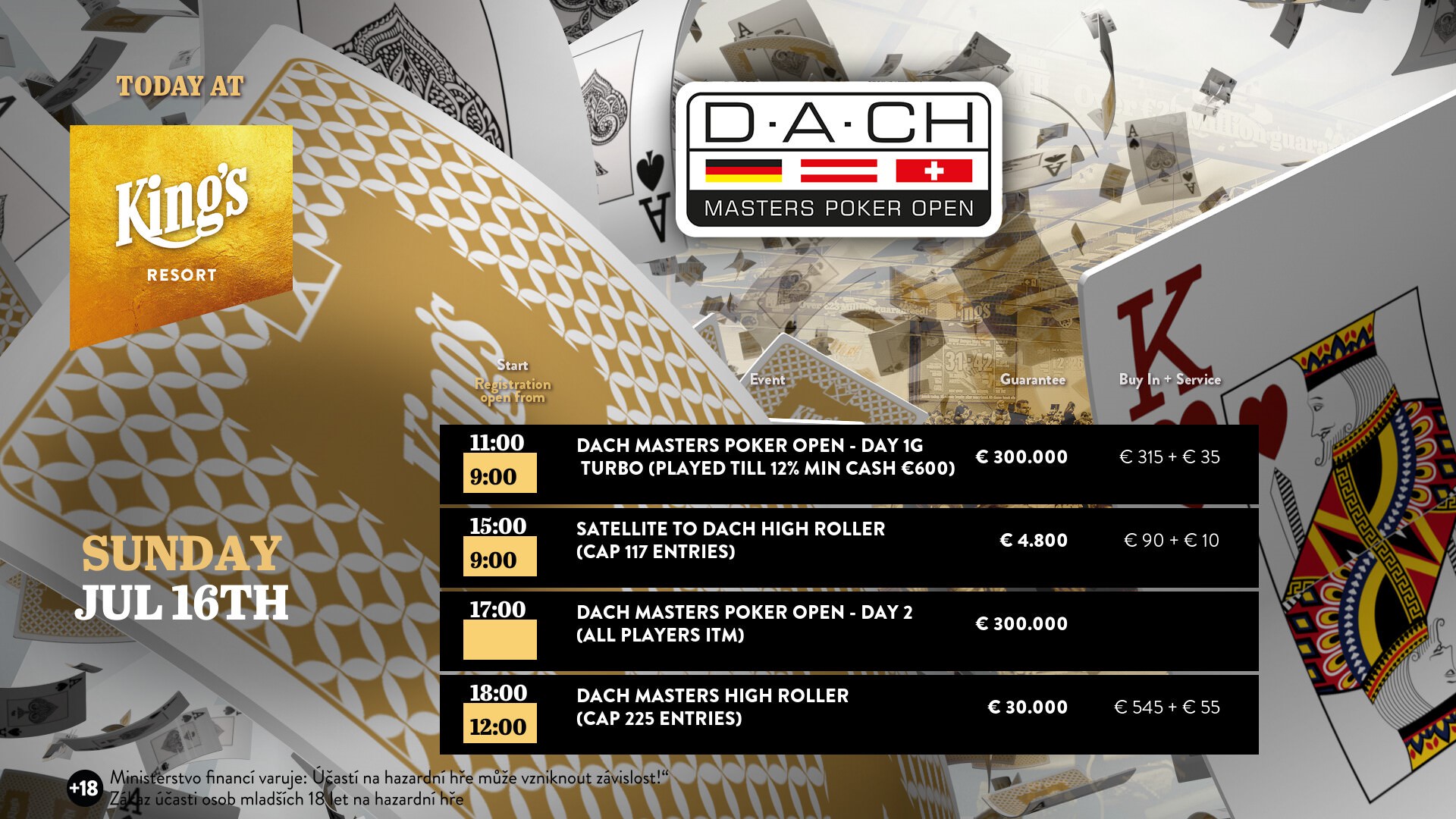 Neben Tag 1G und Tag 2 des D.A.CH Masters Main Event wird im King’s Rozvadov heute auch noch das €545+55 D.A.CH Masters High Roller ausgetragen. Bevor um 18 Uhr der Startschuss fällt, findet um 15 Uhr ein €90+10 Satellite mit maximal 117 Entrys statt.