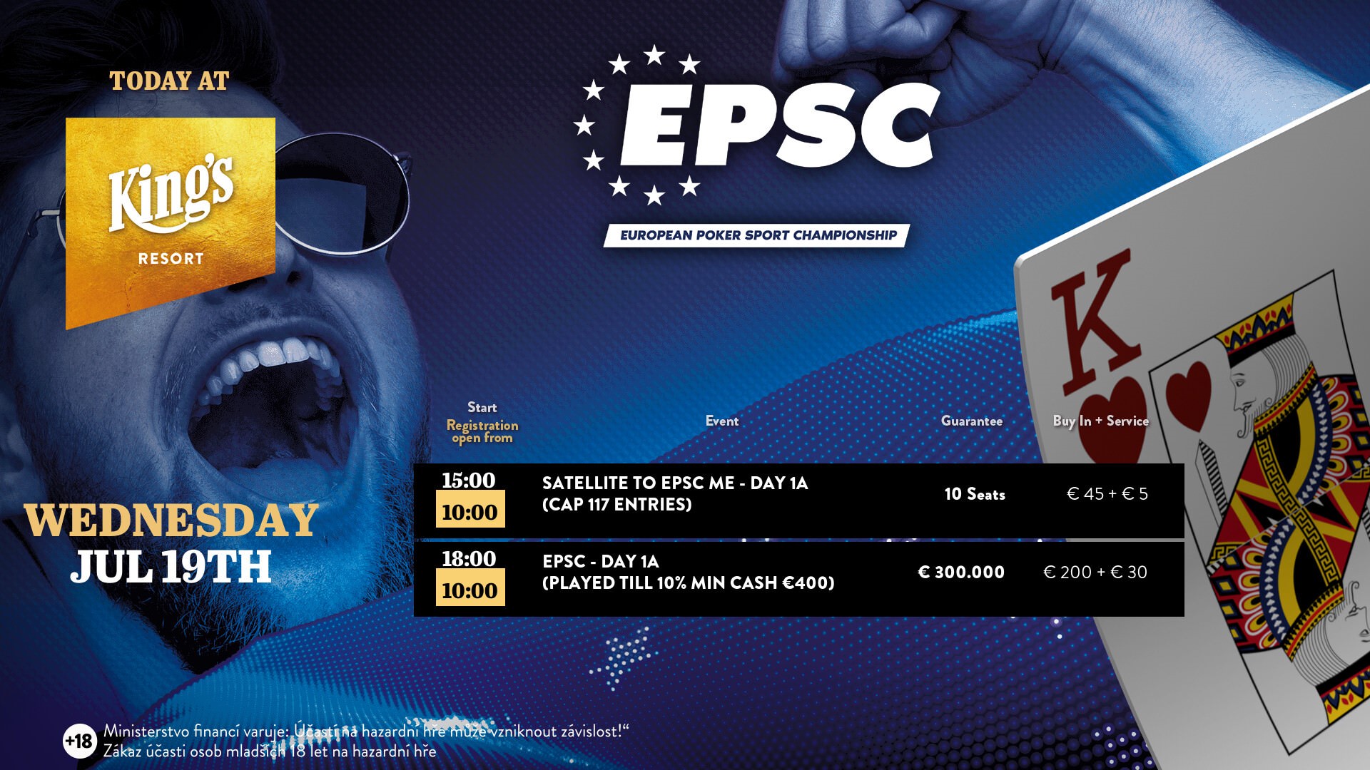 Um 18:00 Uhr beginnt dann der erste von sieben Starttagen Eins des €200+€30 European Poker Sport Championship (EPSC) Main Events, bei dem ein Preisgeld von €300.000 (inklusive vier €10.350 WSOP Europe Main Event Tag 1a Tickets) garantiert wird. Man startet mit 50.000 in Chips und die Blinds werden alle 30 Minuten erhöht. Zwei Re-Entries sind erlaubt und die Late-Registration ist bis zum Start von Level 11 geöffnet. Es wird solange gespielt bis noch 10 % der Entries im Turnier sind. Jeder der sich in Tag 2 spielen kann, bekommt sofort den Min-Cash von €400 gutgeschrieben.