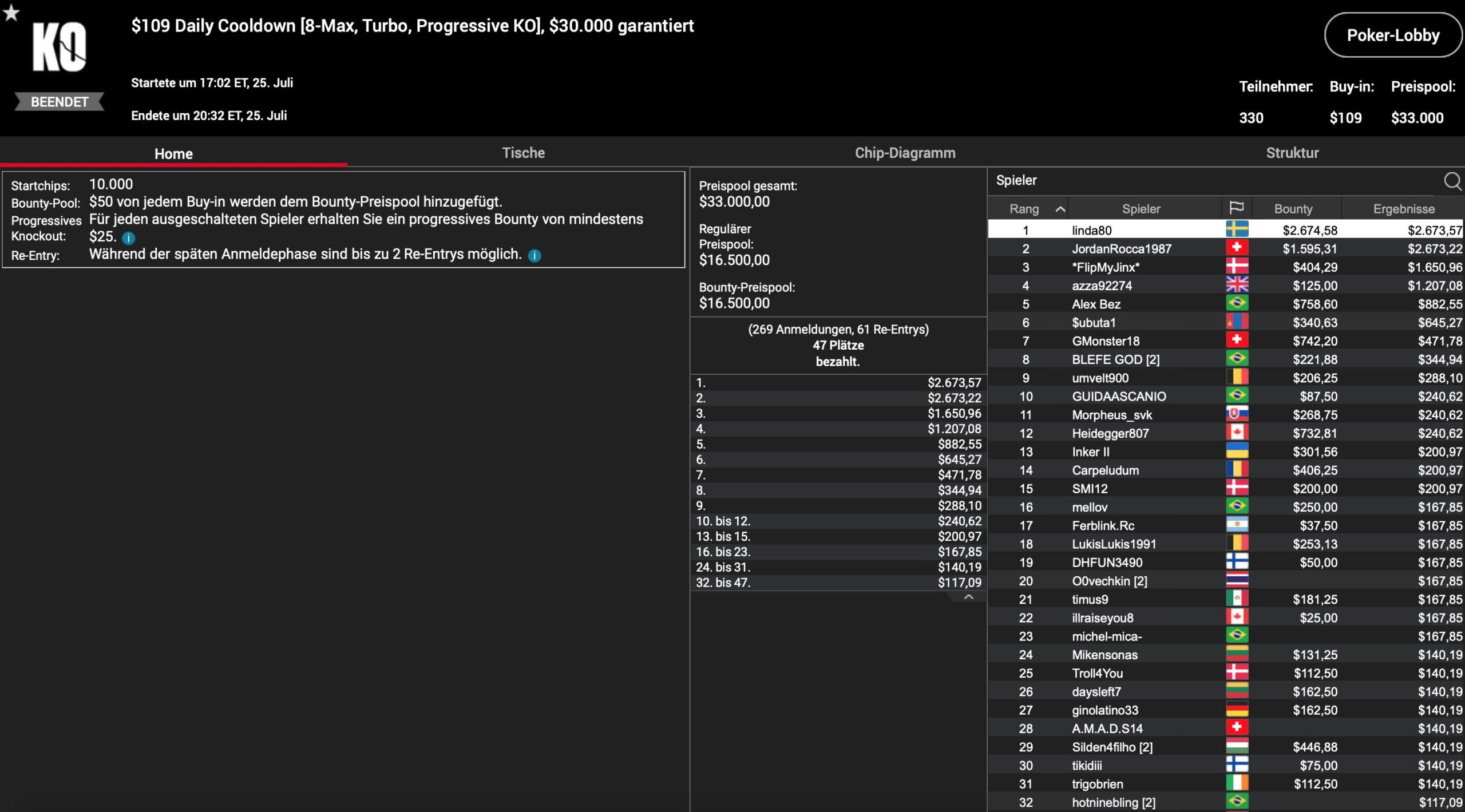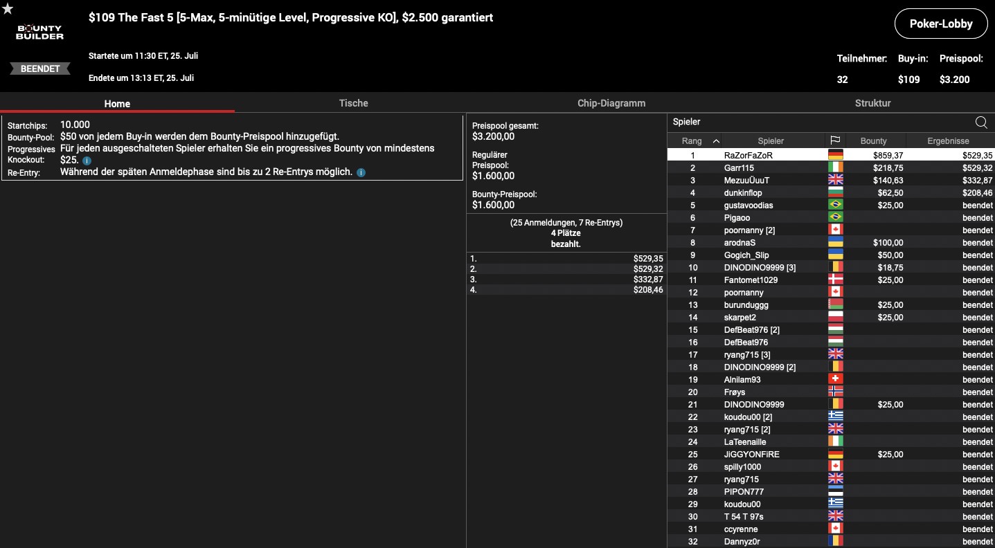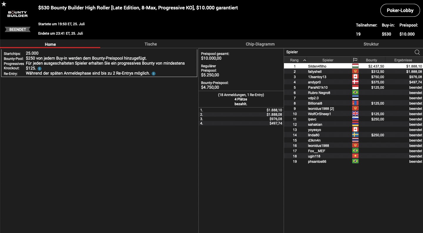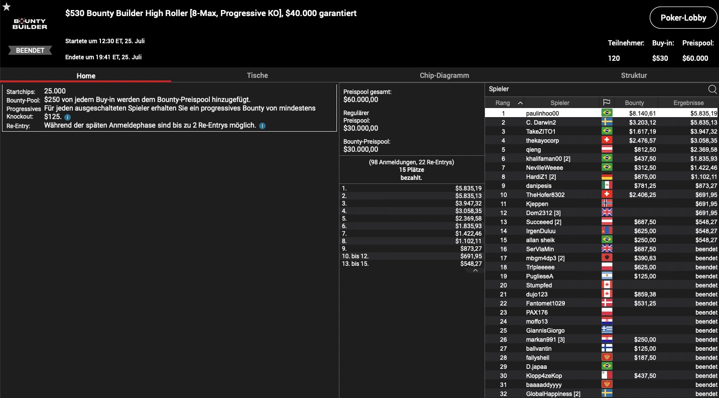 Der Dienstag stand ganz im Zeichen von „C. Darwin2“, für den es super lief: Im Super Tuesday, dem teuersten Tagesturnier auf PokerStars erreichte der WSOP Online Main Event Sieger unter 53 Total Entries Platz 1, was weitere $16.468 zu seinen über 30 Millionen Dollar an Turniergewinnen bedeutete. Hier schaffte es „Lordof0512“ aus Österreich als 6. für $3.200 ins Preisgeld, während „HardiZ1“ als 8. bubblete. Im $530 Bounty Builder High Roller, reichte es für den deutschen High Roller MTT Regular dann allerdings unter 120 Teilnehmern ebenfalls mit Platz 8 zum Sprung ins Preisgeld ($1.977). Im gleichen Turnier landete „qieng“ aus Österreich auf Rang 5 ($3.182), während „thekayacorp“ aus der Schweiz Platz 4 und insgesamt $5.535 holte. Simon „C. Darwin2“ Mattson musste sich hier nur „paulinhoo00“ aus Brasilien beugen, der dafür $13.975 kassierte, während noch einmal $9.038 an den Schweden gingen. Das $530 Daily Cooldown gewann unter 21 Teilnehmern „Heidegger807“ aus Kanada für $5.789, während der Sieg der Late Edition des $530 Bounty Nuilder High Roller an „Silden4filho“ aus Ungarn ging, was mit $4.325 belohnt wurde.