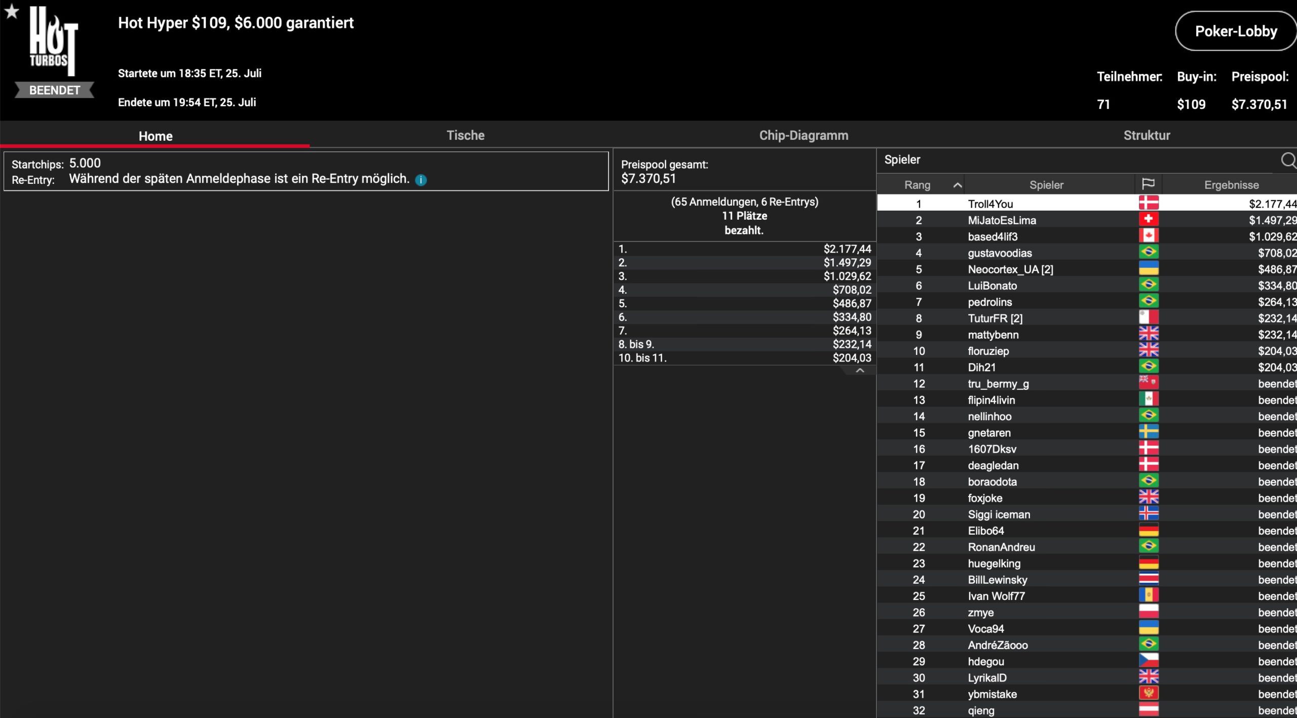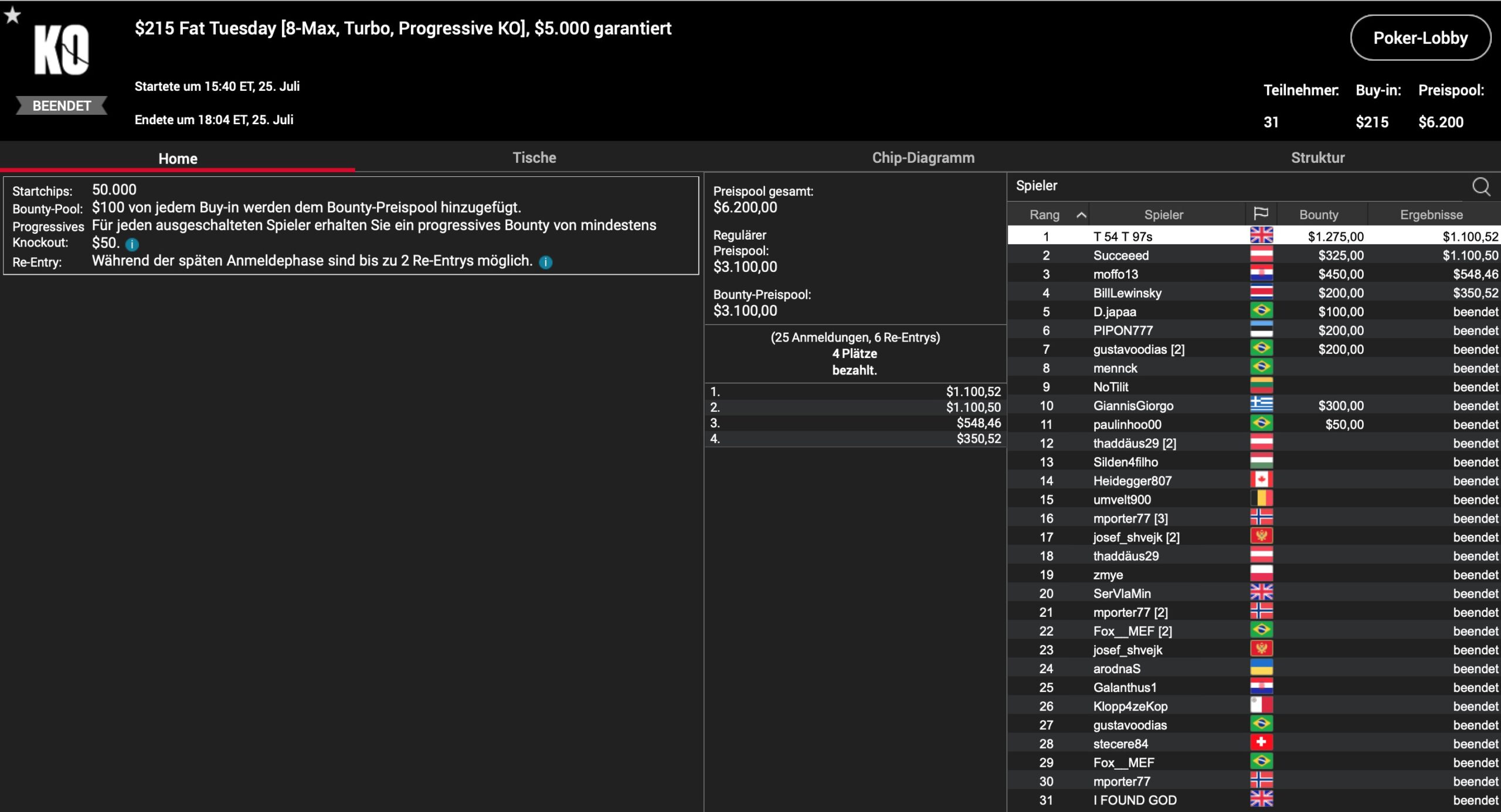 Auch einige Runner-Ups kamne am Dienstag aus Deutschland, Österreich oder der Schweiz. SO einigte sich „KingAssi“ (GER) im Heads-Up des Big $109 mit „Pessagno“ aus Brasilien auf einen 2-Way-Deal, der dem Deutschen Platz 2 und $2.706 bescherte. Weitere zweite Sieger gab es mit „birmi“ (SUI) im Hiot $109 ($1.172), „JordanRocca1987″ (SUI) unter 330 Teilnahmen im $109 Daily Cooldown ($4.268) und „MiJatoEsLima“ (SUI) im Hot Hyper $109 ($1.497). Gleich zweimal gelang dieses Kunststück Jakob „Succeeed“ Miegel, der sowohl im $320 Daily Supersonic ($2.608), als auch im $215 Fat Tuesday ($1.425) Runner-Up wurde.