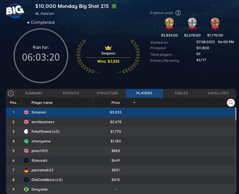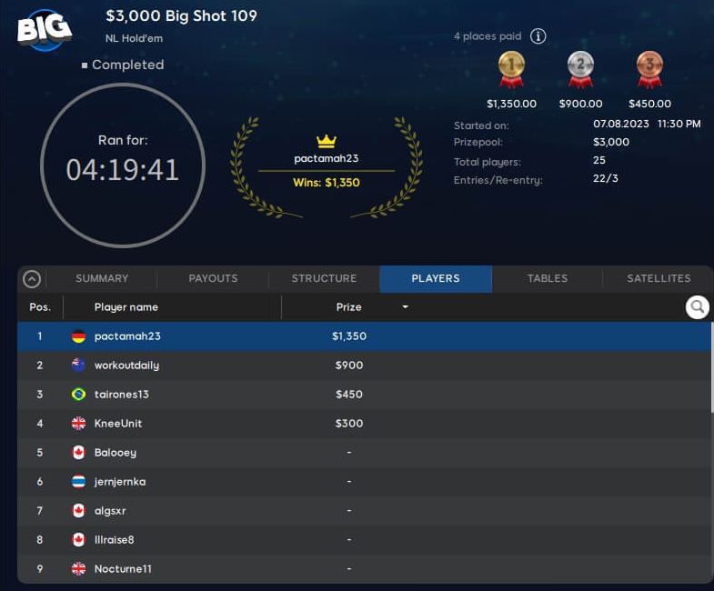 Sogar ganz nach oben auf das Siegertreppchen schaffte es „pactamah23“ beim $109 Big Shot. Dafür kassierte er ein Preisgeld von $1.350!