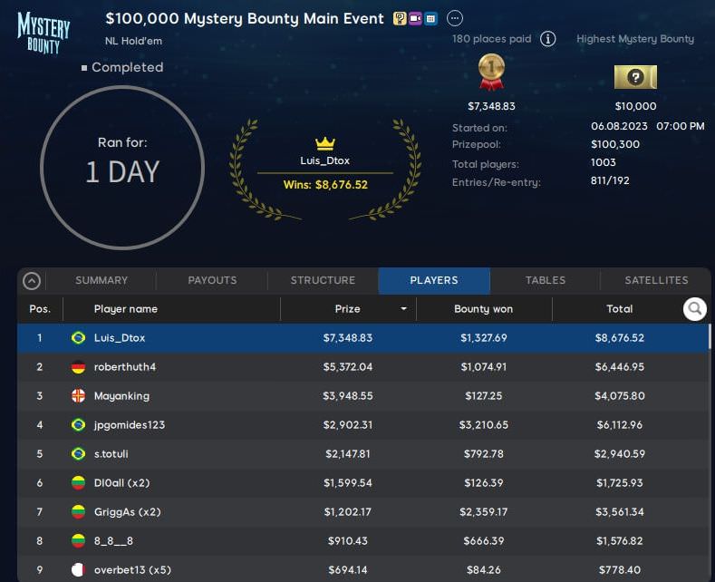 Mit 1.003 Entrys war die Garantie beim Mystery Bounty hauchdünn geknackt worden, es ging somit um $100.300 Preisgeld.