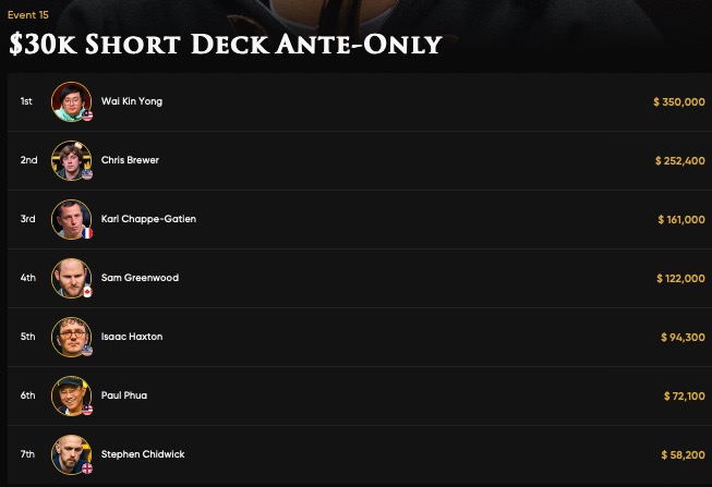 Best of the Rest wurde Chris Brewer aus den USA, der bis zum Heads-Up den Rückstand zwar deutlich verkleinern konnte, hier aber gegen den Chipleader am Ende den Kürzeren zog. Lohn für Brewers Kampf waren $252.400, während Wai Kin Yong $350.000 mitnehmen konnte.