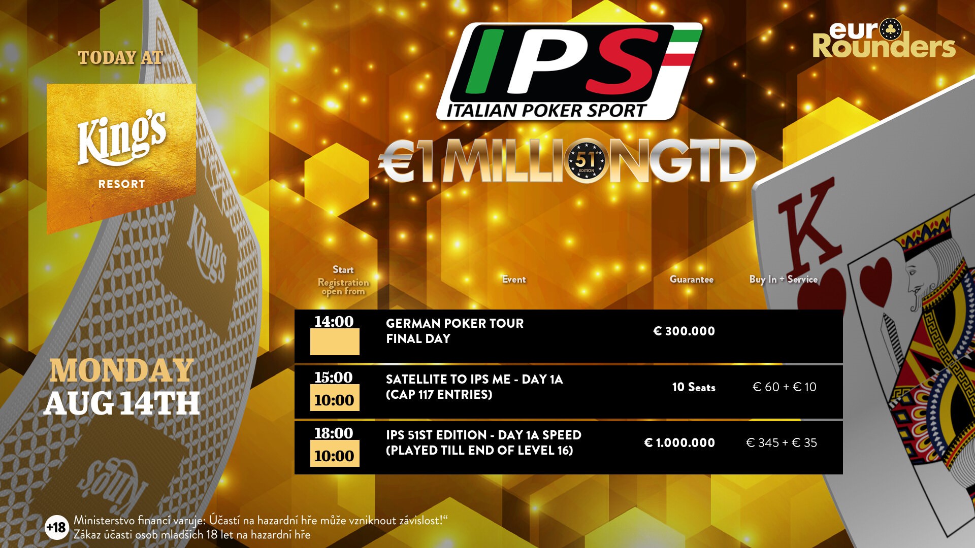 Heute steht im King’s Rozvadov neben dem Finale des GPT Main Event auch noch der Auftakt des IPS (Italian Poker Sport) an. Nach dem €60+10 Satellite um 15 Uhr, bei dem zehn Tickets garantiert werden, steht um 18 Uhr der erste Starttag im Speedformat an. Das Startgeld beträgt €345+35.