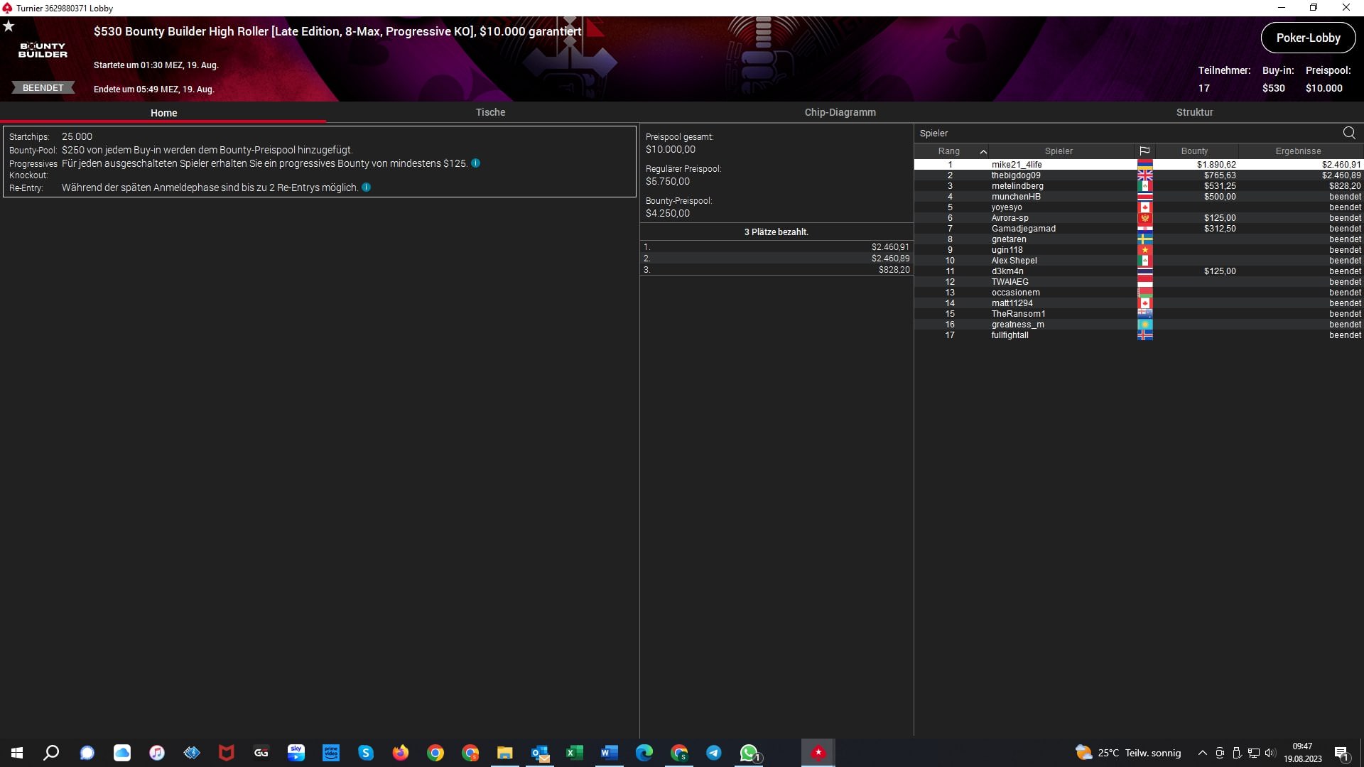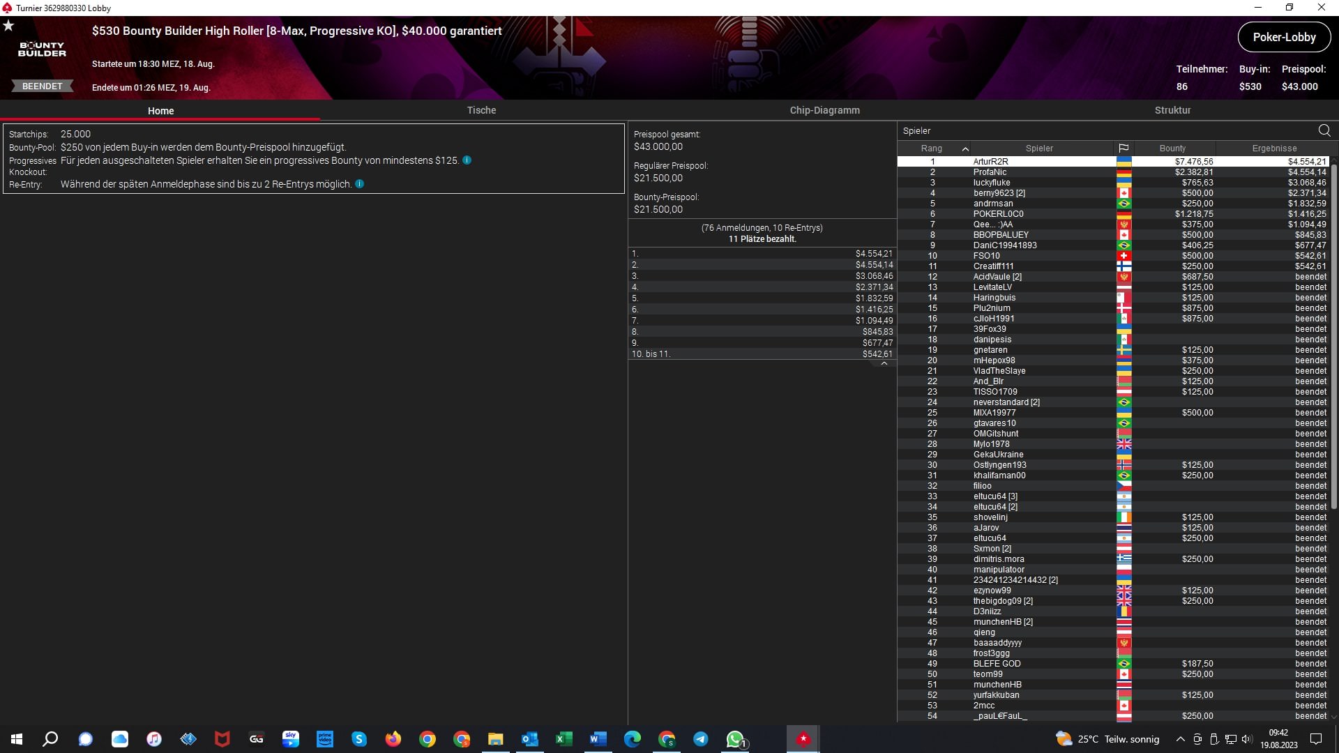 Beim größten High Roller Event am Freitag, dem $530 Bounty Builder High Roller bauten 86 Spieler einen Preispool von $43.000 auf. Der Deutsche „ProfaNic“ musste sich hier erst im Heasds-Up dem Ukrainer „ArturR2R“ geschlagen geben und kassierte $4.554 + $2.382 Bounties. Platz 6 ging noch an „POKERLOCO“ aus Deutschland für $1.416 + $1.218 Bounties.