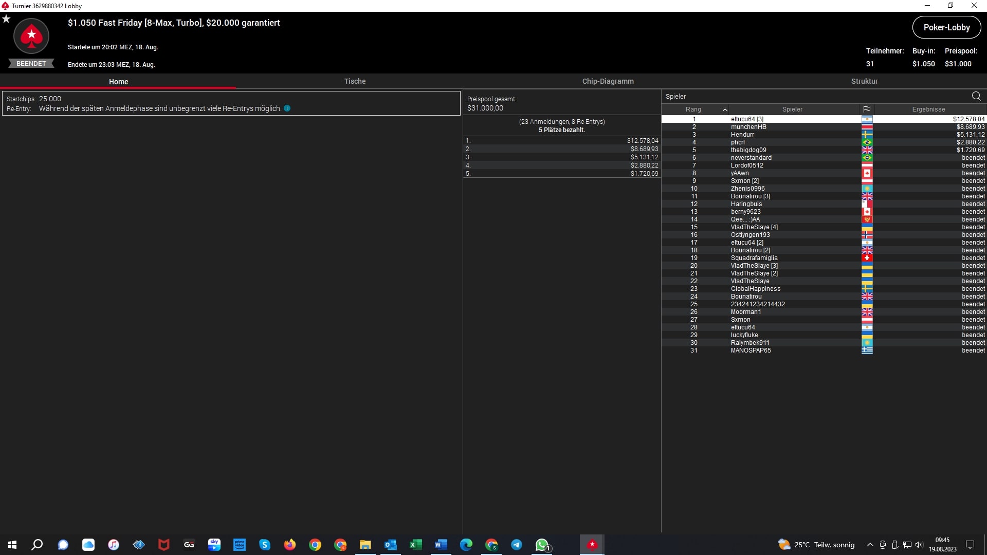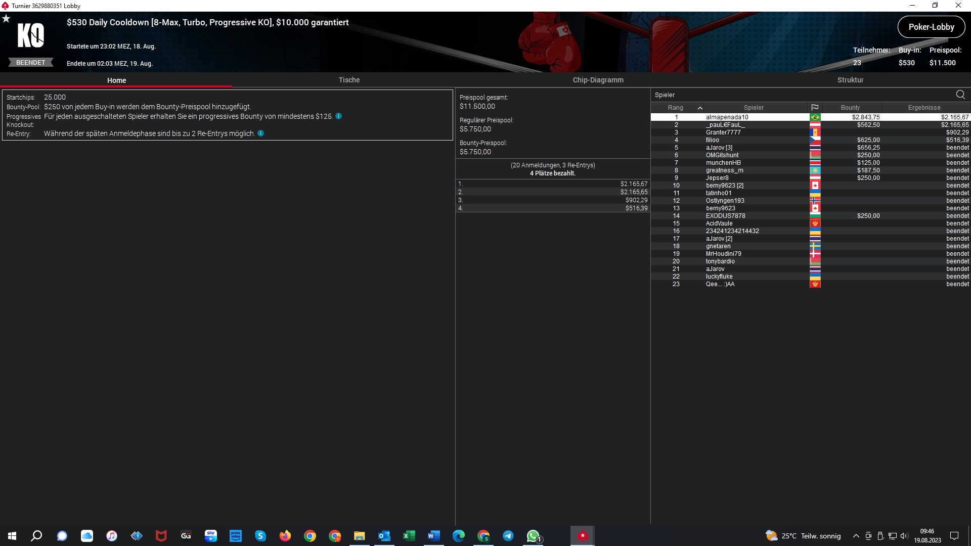 Ebenfalls Runner-Up wurde der in Österreich lebende Deutsche Paul „_paul€Fauf_“ Höfer beim $530 Daily Cooldown High Roller. Hier musste er sich nur dem Brasilianer „almapenada10“ geschlagen geben und wurde mit $2.165 + $562 Bounties belohnt.