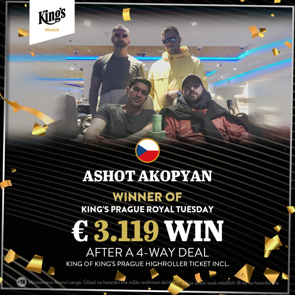 Die Top 17 sollten es ins Geld schaffen, bei einem Mincash von €243 und einer Siegprämie von €4.399. Mit Engin Altin aus der Schweiz landete auch ein D-A-CH-Spieler in der tschechischen Hauptstadt auf Platz 12 (€279) ITM. Die meisten Preisgeldplätze blieben wie gewohnt in tscheschischer Hand, aber wie so häufig ging der Sieg nicht an die Gastgebernation: Die Top 4 einigten sich nach fast 11 Stunden Spielzeit um 03:35 Uhr auf einen Deal. Dieser bescherte „NikiN“ aus Tschechien Platz 4 und €2.590, seinem Landsmann Lukas Fiala Rang 3 und €2.896 und Alberti Sanaia aus Georgien bekam als Runner-Up €3.060. Der Sieg und €3.119 gingen nach Russland an Ashot Akopyan.