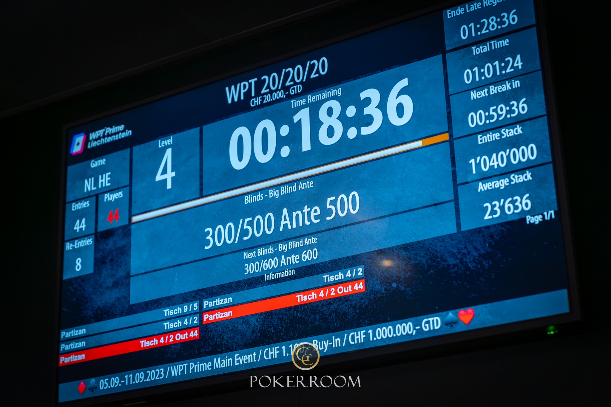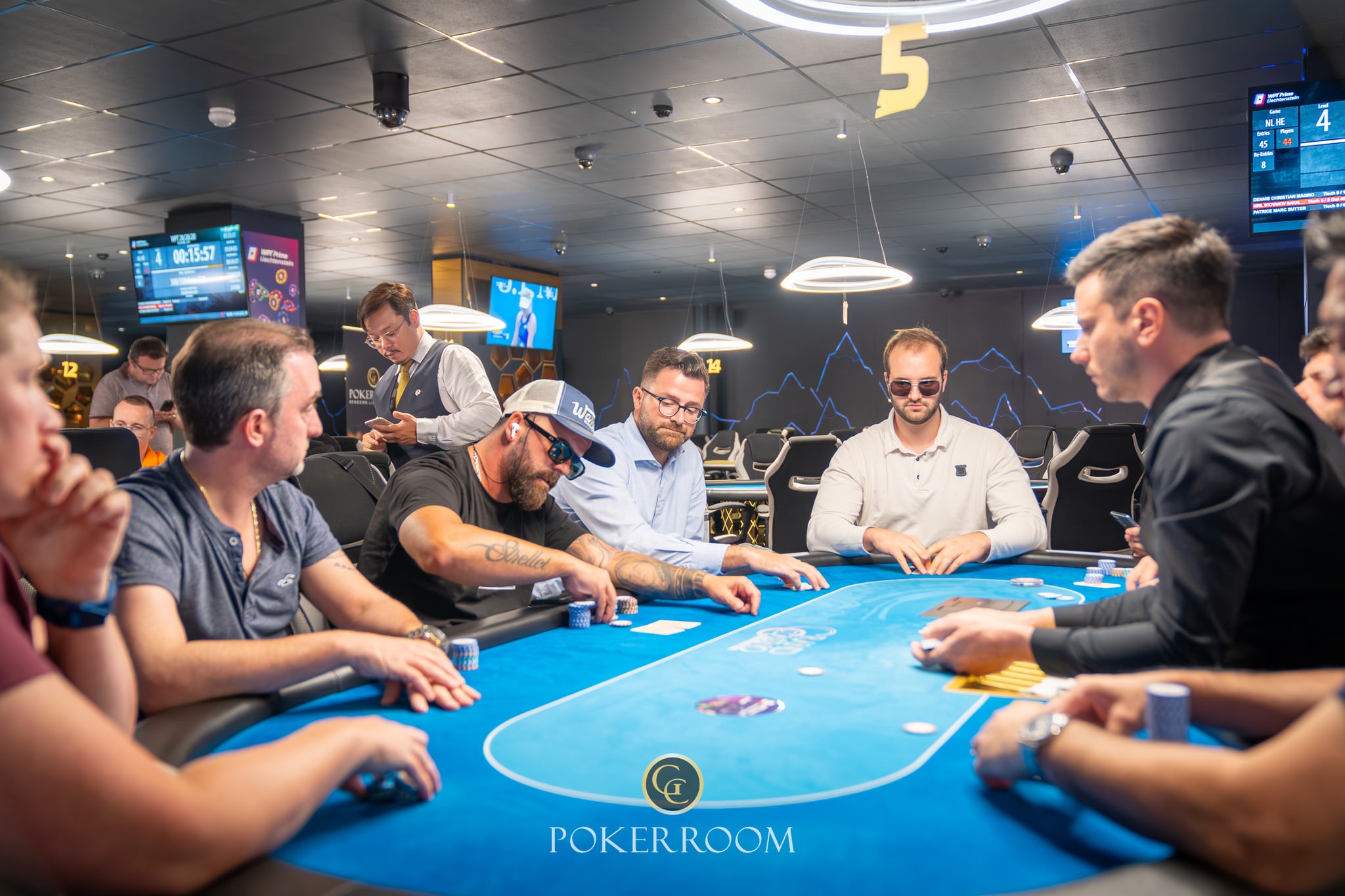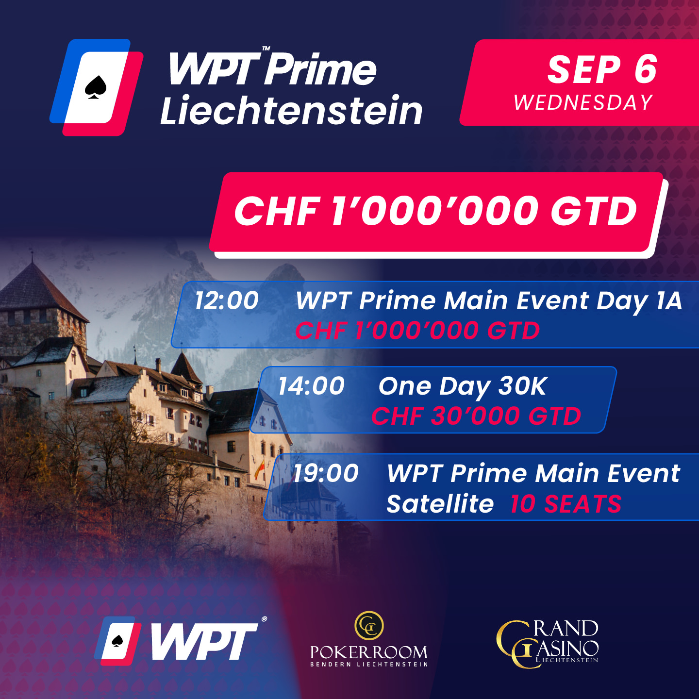 Um 12:00 Uhr ist es endlich soweit im GC Pokerroom Bendern: Dann werden die Karten am ersten von 6 Starttagen im WPT Prime Liechtenstein Main Event in der Luft sein. Für ein Startgeld von 1.100 CHF können Teilnehmer*innen auf die Jagd nach mindestens 1 Million Schweizer Franken an garantiertem Preisgeld gehen. Dafür erhalten sie 30.000 Chips zum Start und haben 6 Level lang die Möglichkeit auf einen Spätstart während der Late Registration. Die Blind Level sind zunächst 40 Minuten lang und verlängern sich im Laufe des Turniertages auf 60.
