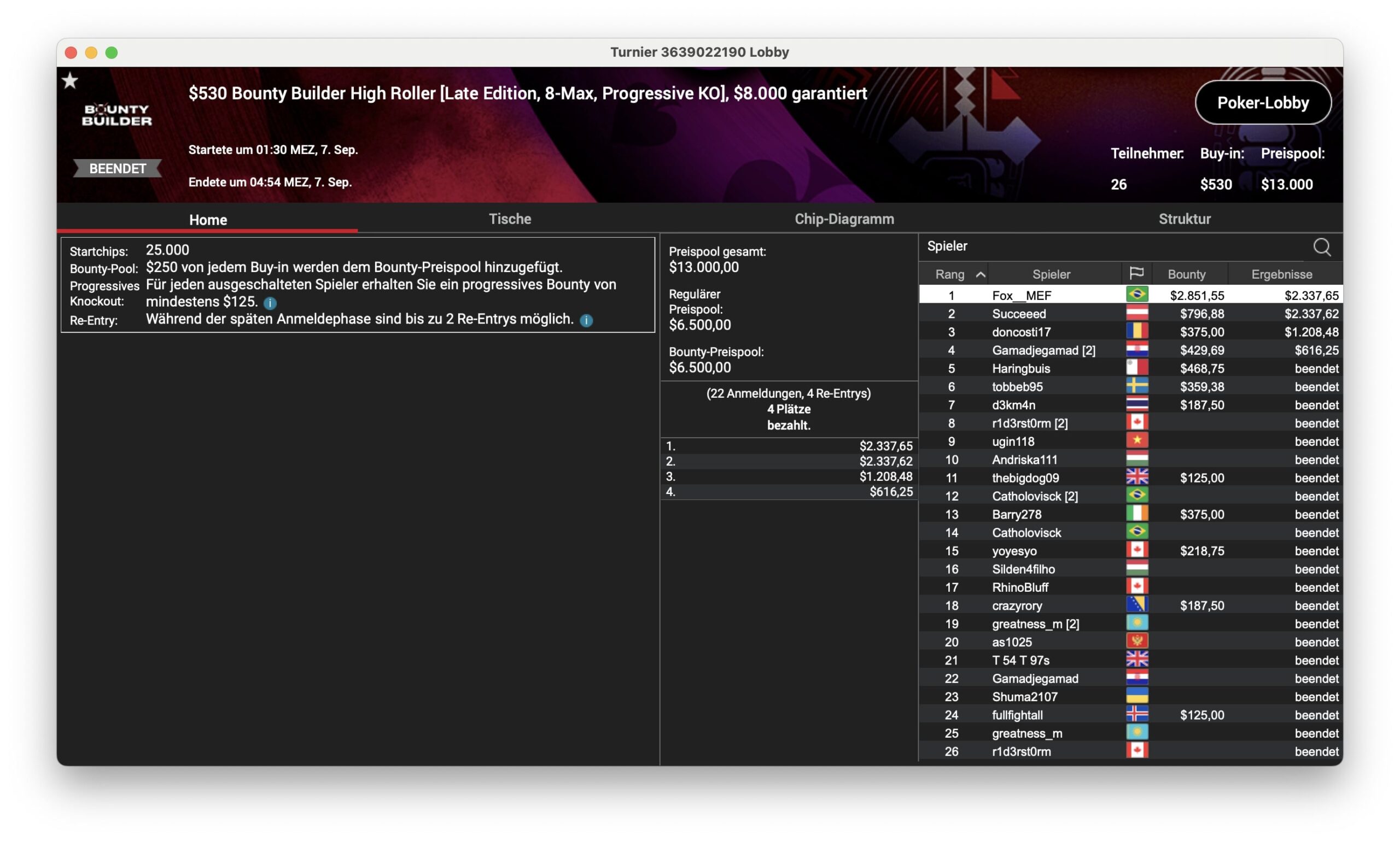 Jakob Miegel konnte zudem noch einen Runner-Up beim $530 Bounty Builder HR Late Edition machen. $796 + $2.337 gab es hier on top. Der Sieg ging hier an den Brasilianer „Fox__MEF“ für $2.851 + $2.337.