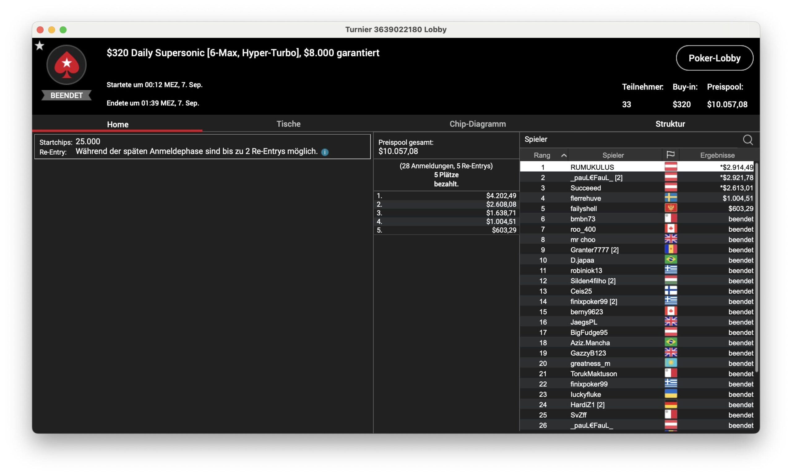 Leon „RUMUKULUS“ Sturm dealte mit Paul „_pauL€FauL_“ Höfer und Jakob „Succeeed“ Miegel beim $320 Daily Supersonic. Das brachte den Spielern auf den Plätzen 1, 2 und 3 jeweils $2.914, $2.921 und $2.613 ein.