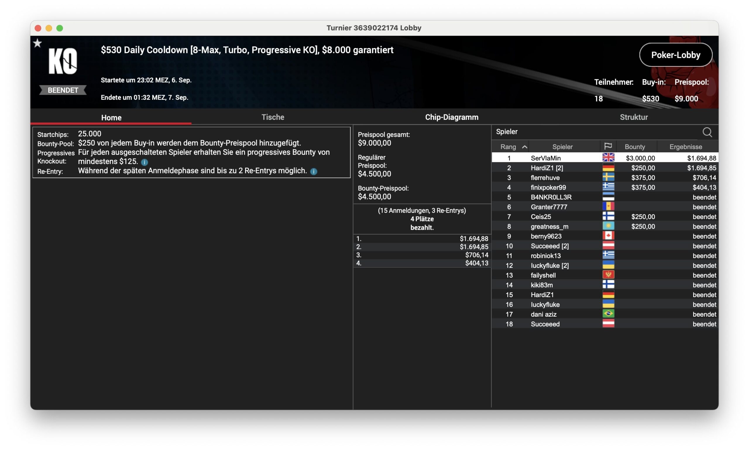 Das $530 Daily Cooldown ging an den Briten „SerVlaMin“, PokerStars High Roller Dauergast, für $3.000 + $1.694. Runner-Up wurde hier mit „HardiZ1“ ebenfalls ein DACH-Spieler – $250 + $1.694 gab es dafür als Belohnung.