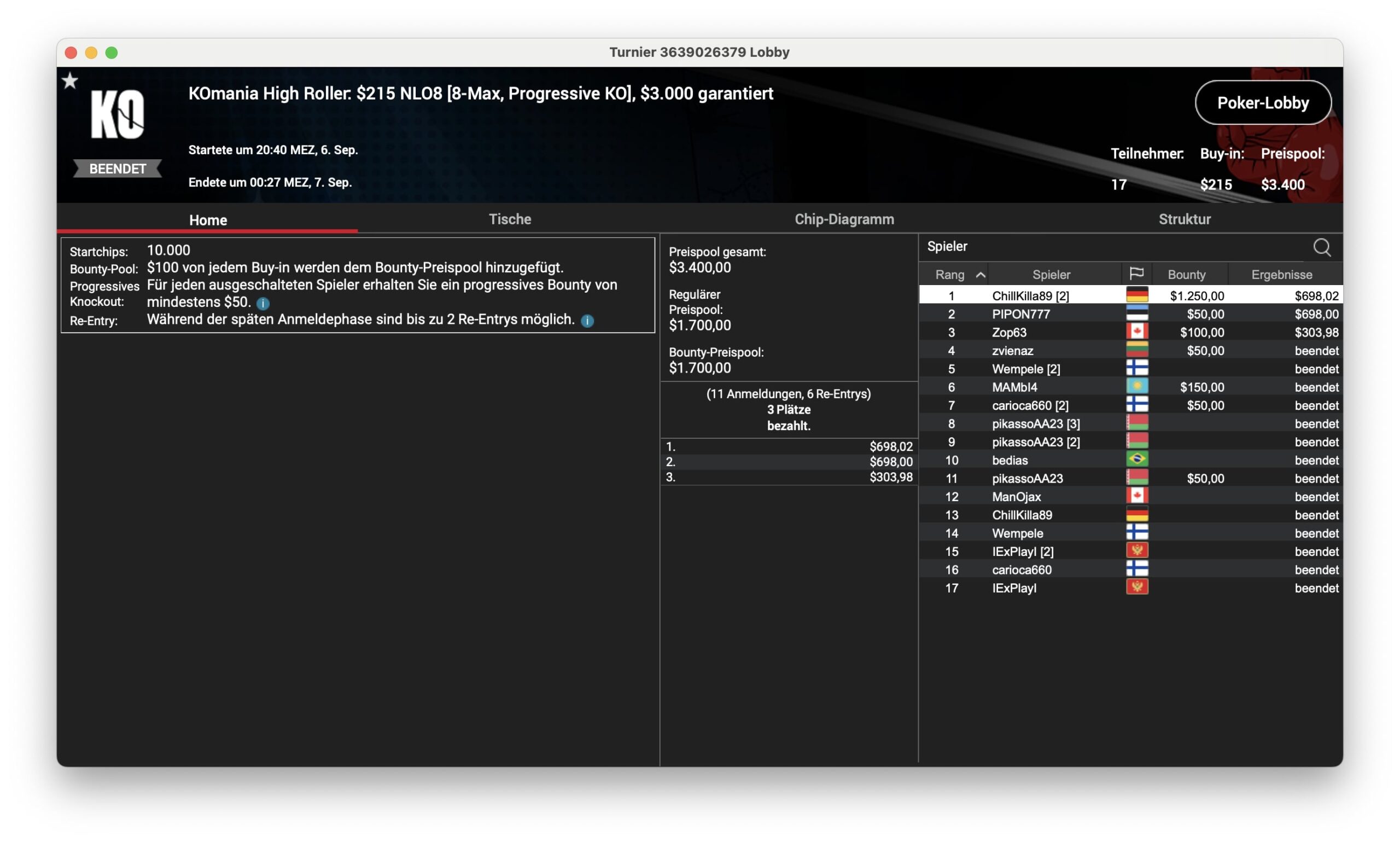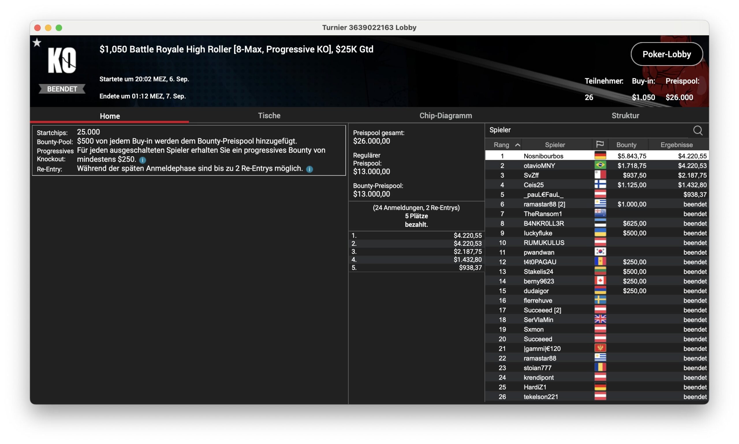 Das $1.050 Battle Royal High Roller hatte 26 Runner – „Nosnibourbos“ aus Deutschland holte sich den Sieg und $5.843 + $4.220. Das KOmania High Roller sicherte sich „ChillKilla89“, ebenfalls aus Deutschland, für $1.250 + $698.