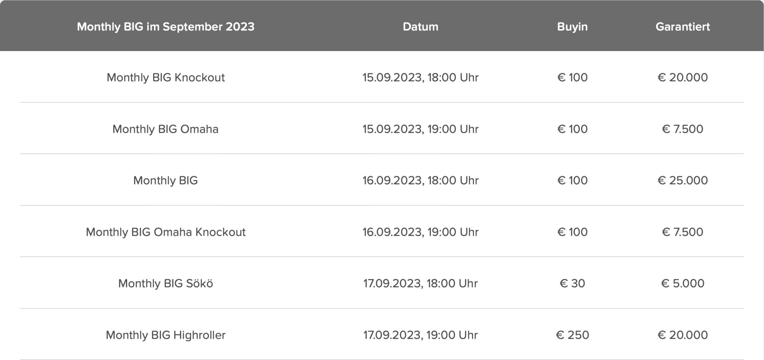 Zu den beiden beiden €20k gtd. MTTs kommen mit dem Monthly BIG Omaha (FR, 19:00 Uhr) und dem Monthly BIG Omaha Knockout (SA, 19:00 Uhr) noch zwei PLO Turniere, die bei einem Buy-In von jeweils €100 je €7.500 Garantie besitzen. Hinzu kommt mit dem Monthly BIG Sökö (SO, 18:00 Uhr) ein MTT in der beliebten finnischen Pokervariante. Hier ist das Startgeld mit €30 ein echtes Schnäppchen, trotzdem sind €5.000 garantiert. Den BIG-Abschluss der Woche macht dann das Monthly BIG Highroller (SO, 19:00 Uhr), bei dem das Startgeld bei €250 und der die Preispool-Garantie bei €20.000 liegt. – Das folgende Monthly BIG Wochenende findet dann vom 22.-24. Spetember statt.