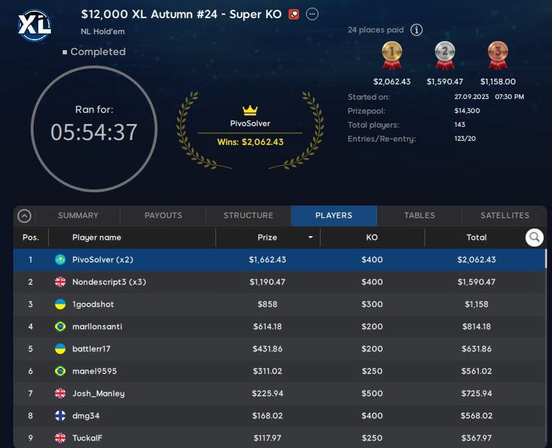 Bei den Side Events holte sich „Boene3000“ aus Deutschland Event 23, das Super KO Mini, und kassierte gut $1.450 Preisgeld.