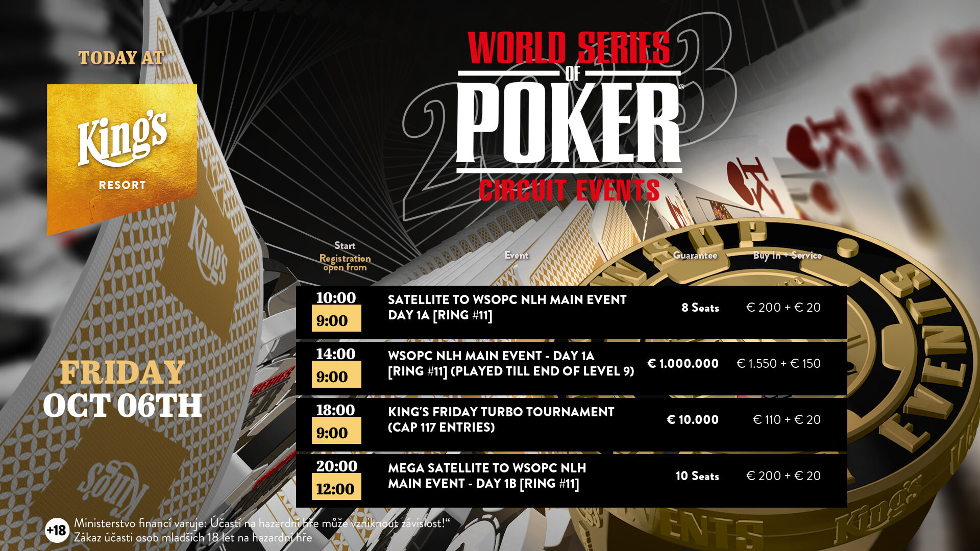 Im King’s Resort Rozvadov geht es am Freitag um 10:00 Uhr mit dem €200+€20 Satellite für den Tag 1a des €1.700 WSOPC NLH Main Events los. Hier sind acht Tickets garantiert.