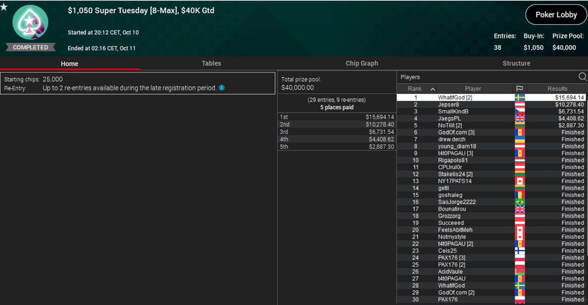 Der zweimalige EPT-Online-Sieger „WhatIfGod“ zeigte dabei wieder einmal seine Klasse und holte sich mit Platz 1 und einem Gewinn von knapp $16.000 beim $1.050 Super Tuesday den lukrativsten Turniersieg.
