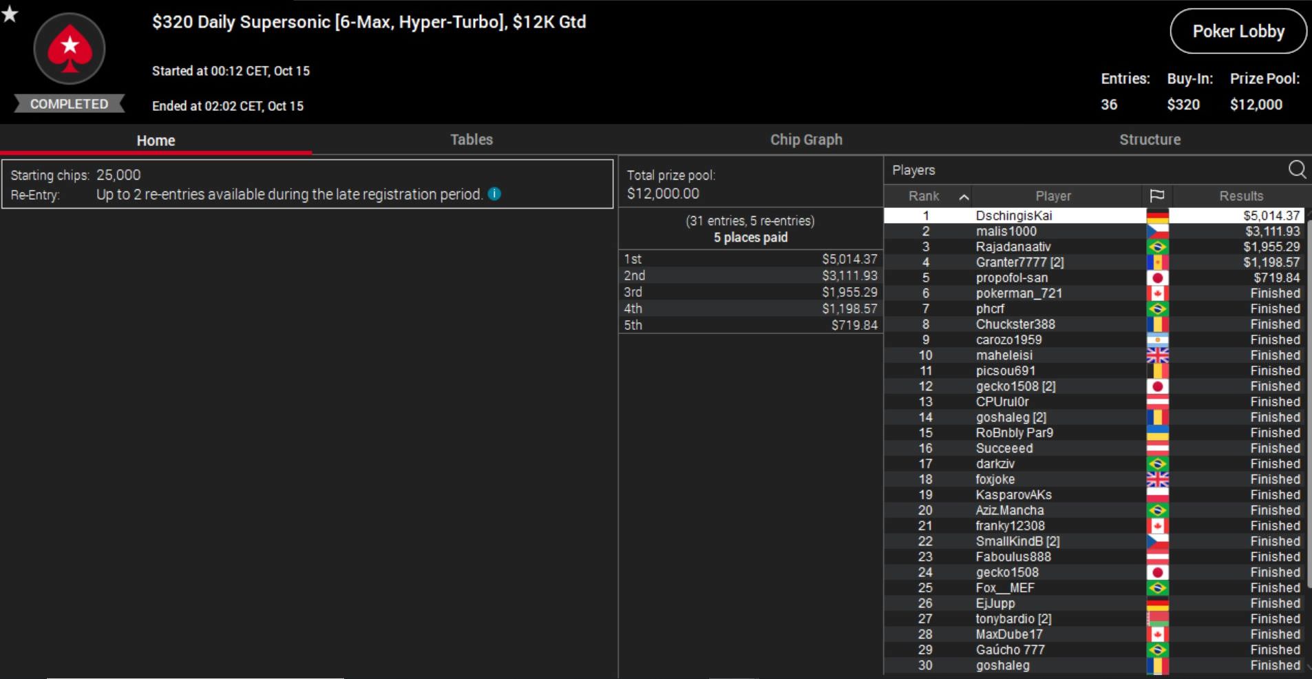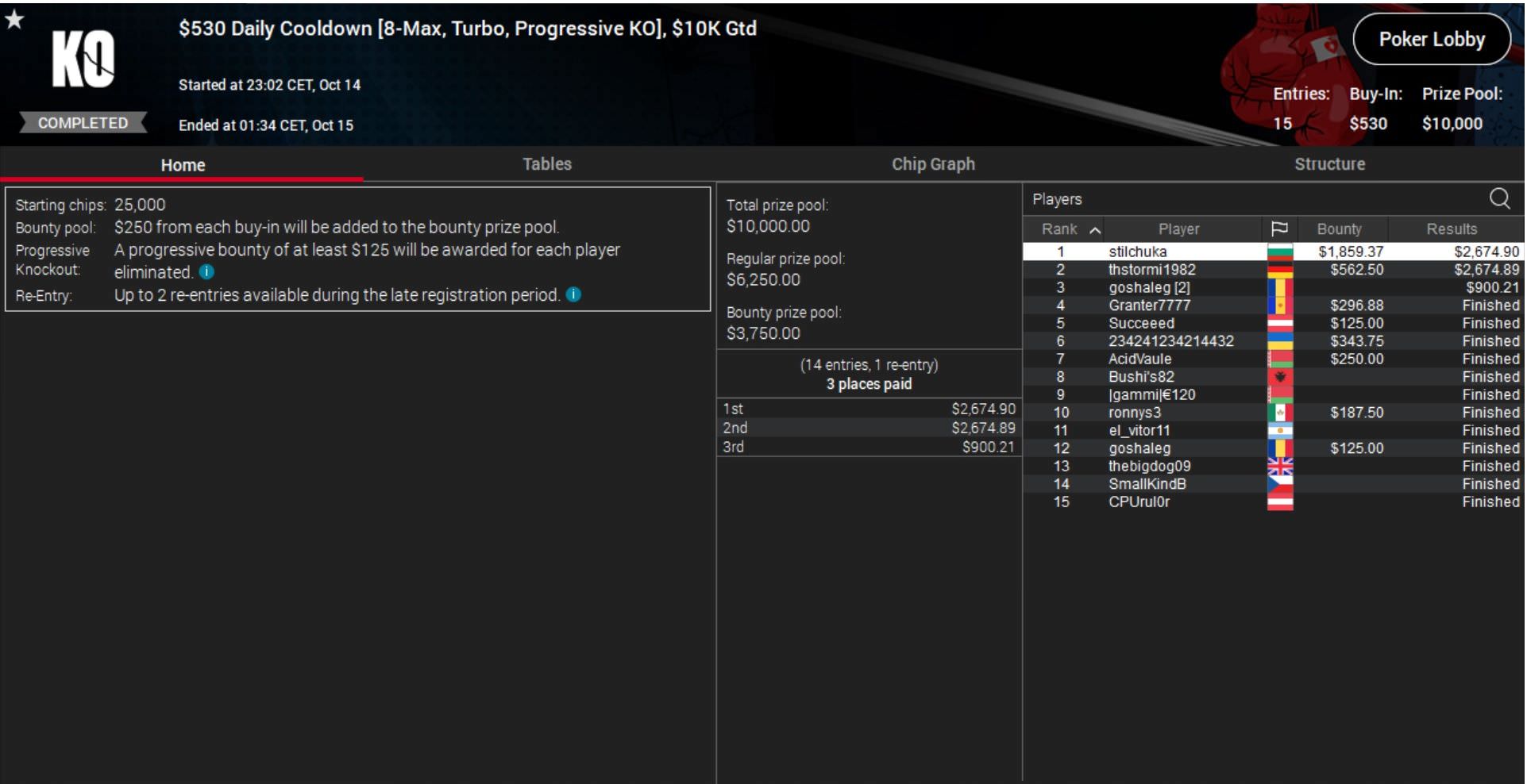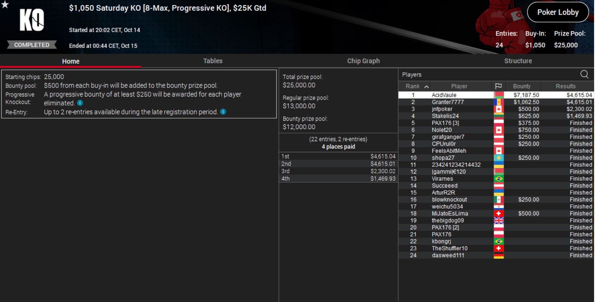 Das teuerste Turnier des Samstags ging an den Belarussen „AcidVaule“. Er siegte beim $1.050 Saturday KO und erhielt rund $11.800.