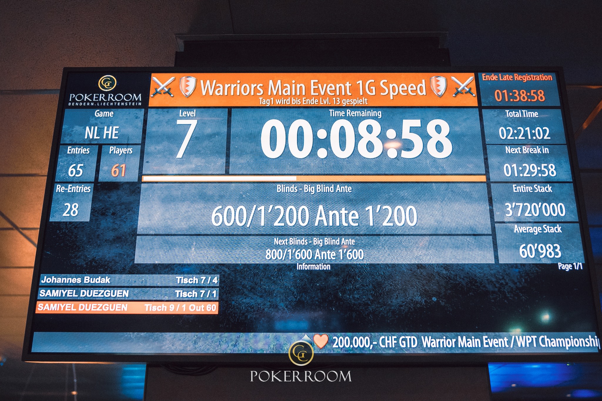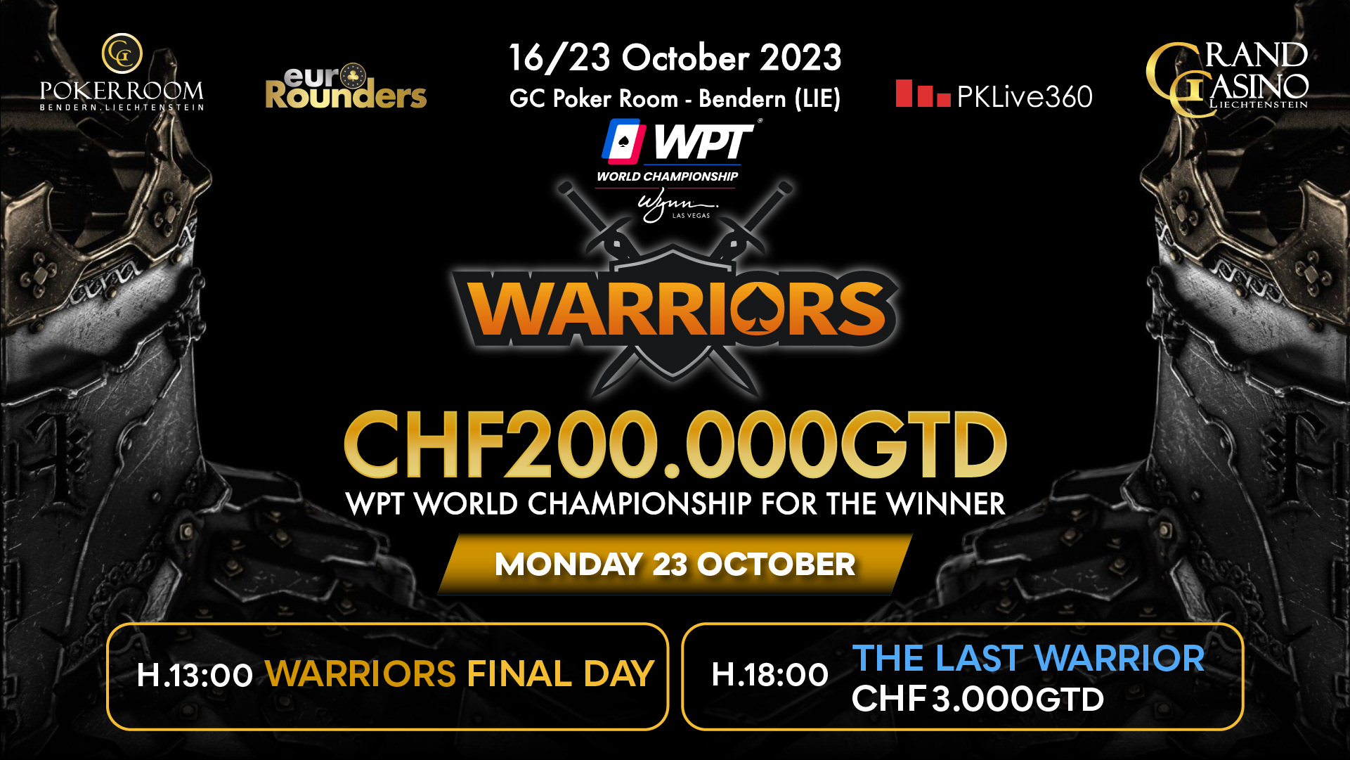Heute findet um 13 Uhr das Finale des Warrior Main Event statt, um 18 Uhr wird zudem das CHF 100+20 Last Warrior mit einer Garantie von CHF 3.000 angeboten. Jeder Spieler erhält für sein Startgeld 40.000 Chips und kann sich einen Re-Entry genehmigen.