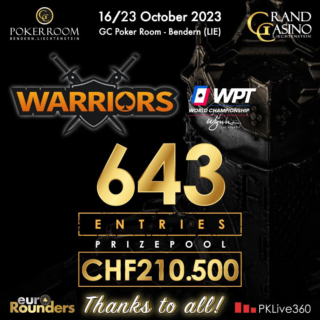 Außerdem wurden am Sonntag das CHF 220+220+60 Warriors High Roller und das CHF 170+30 Baby Warrior ausgetragen.