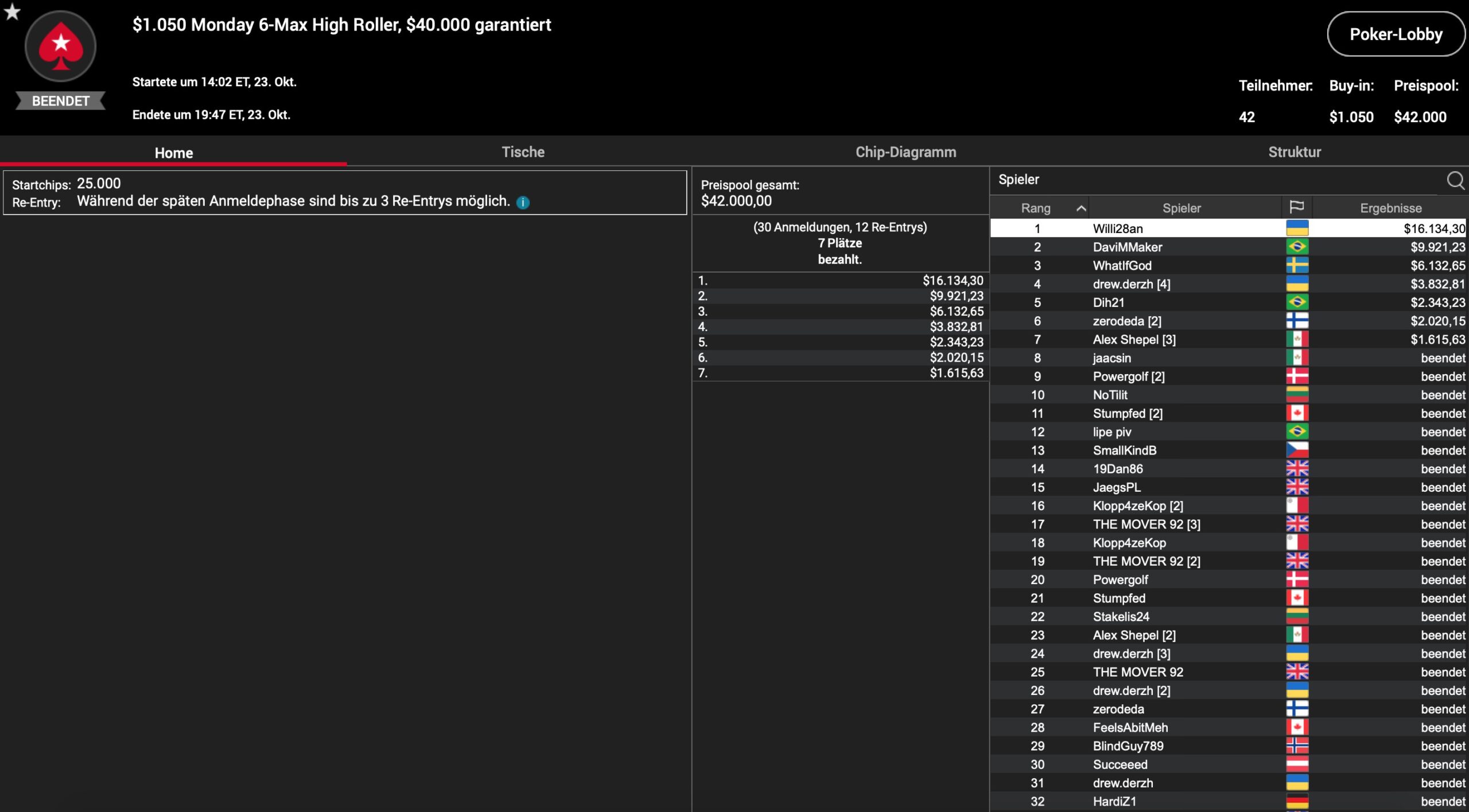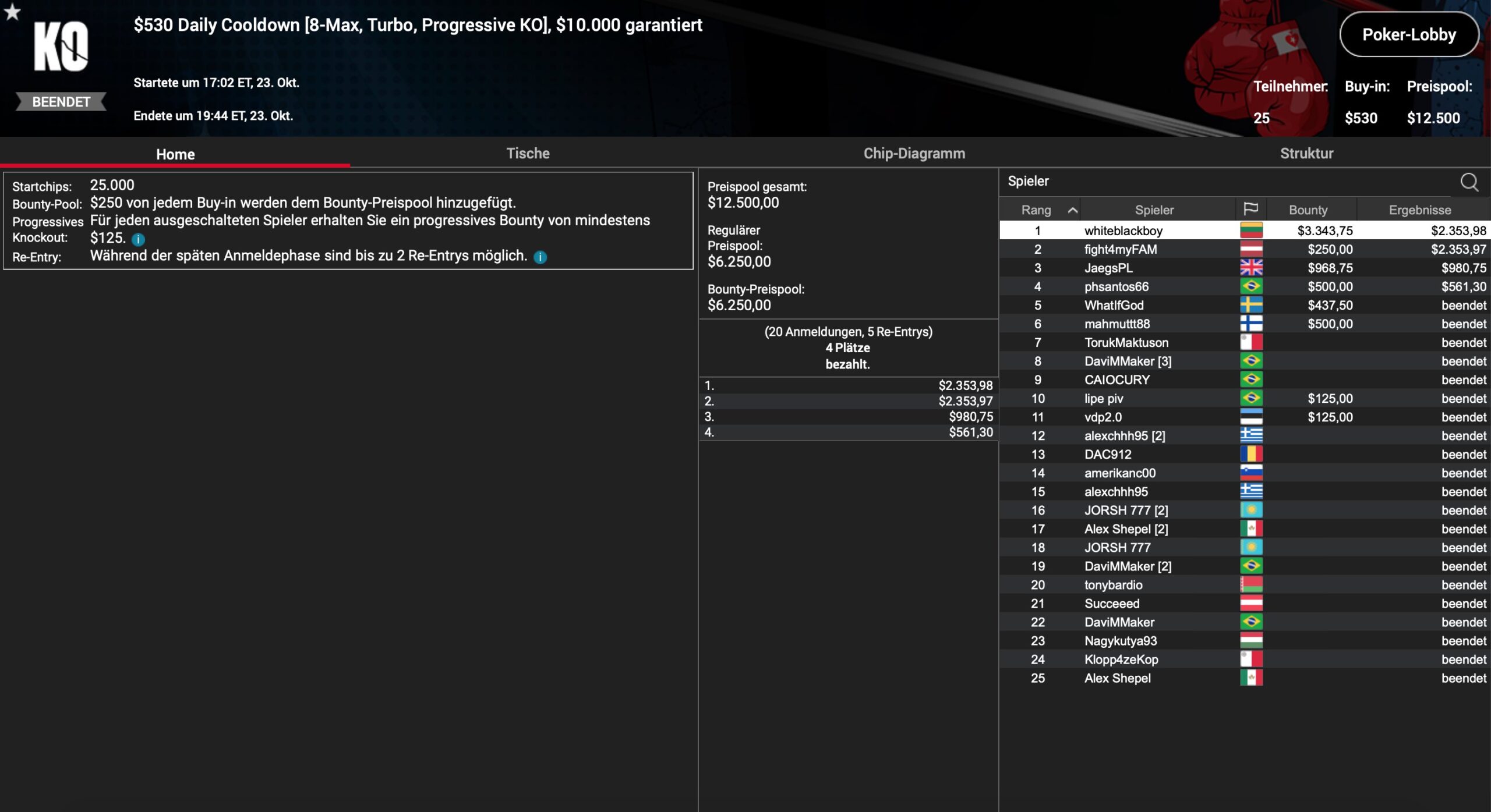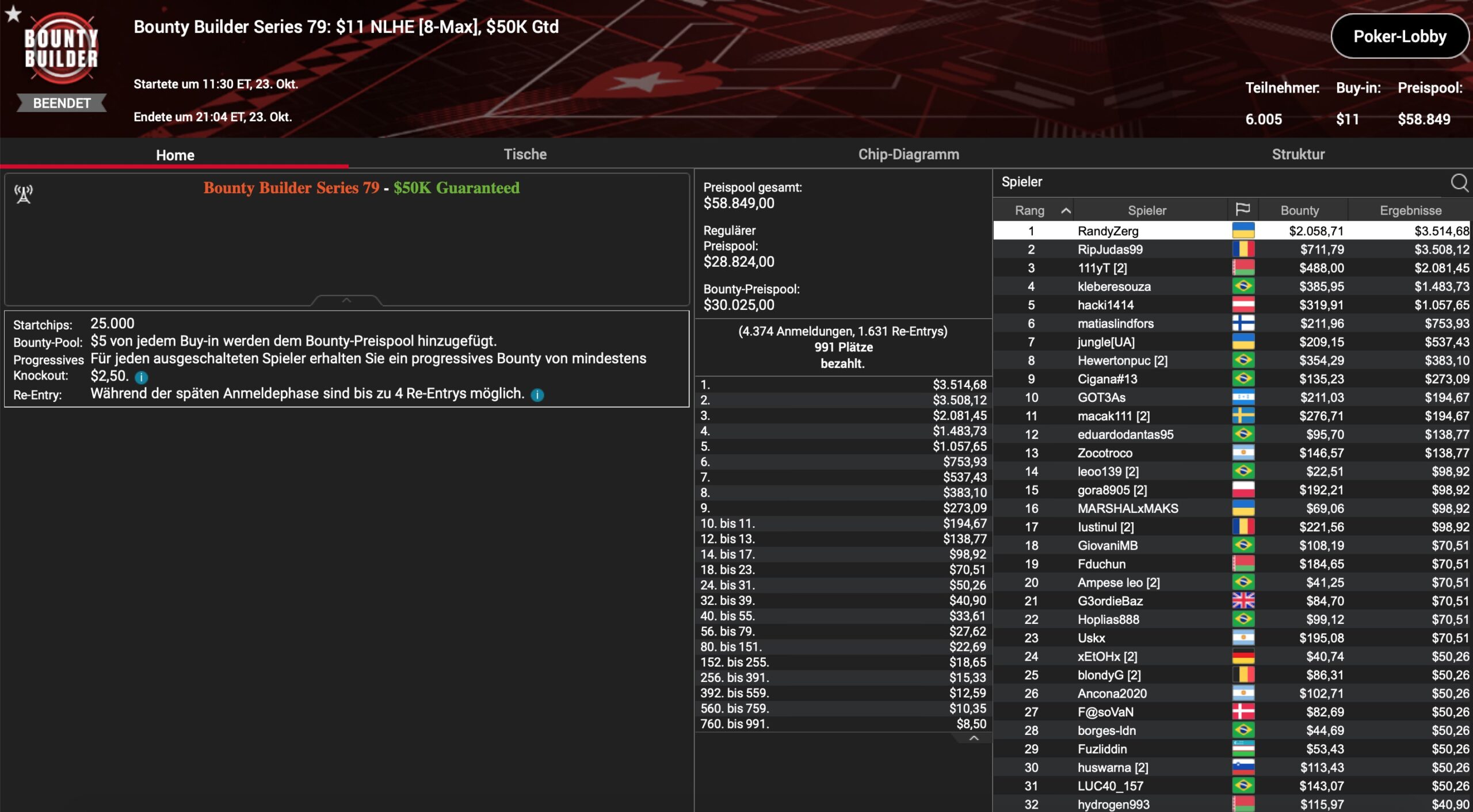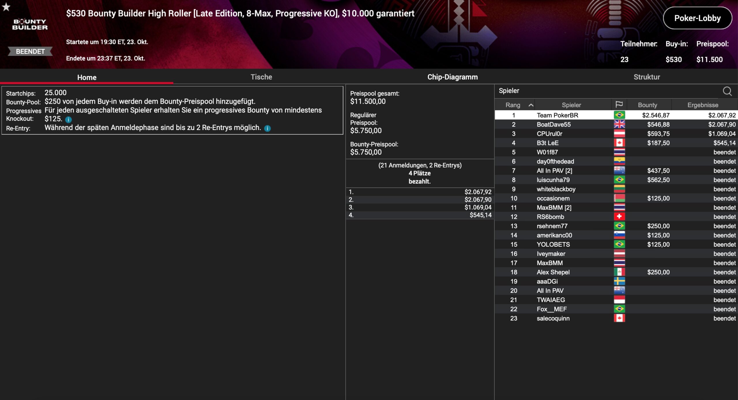 In den 3 High Roller MTTs, die nicht in die Bounty Builder Series eingegliedert sind, gab es 2 D-A-CH-Cashes an den Finaltischen. Im $530 Daily Cooldown war es Patrick „JaegsPL“ Lauber, der als Dritter unter 25 Teilnehmern cashen konnte ($1.949). In der $530 Late Edition des Bounty Builders HR, landete Christopher „CPUrur“ Pütz unter 23 Kontrahenten für $1.662 auf Rang 3.