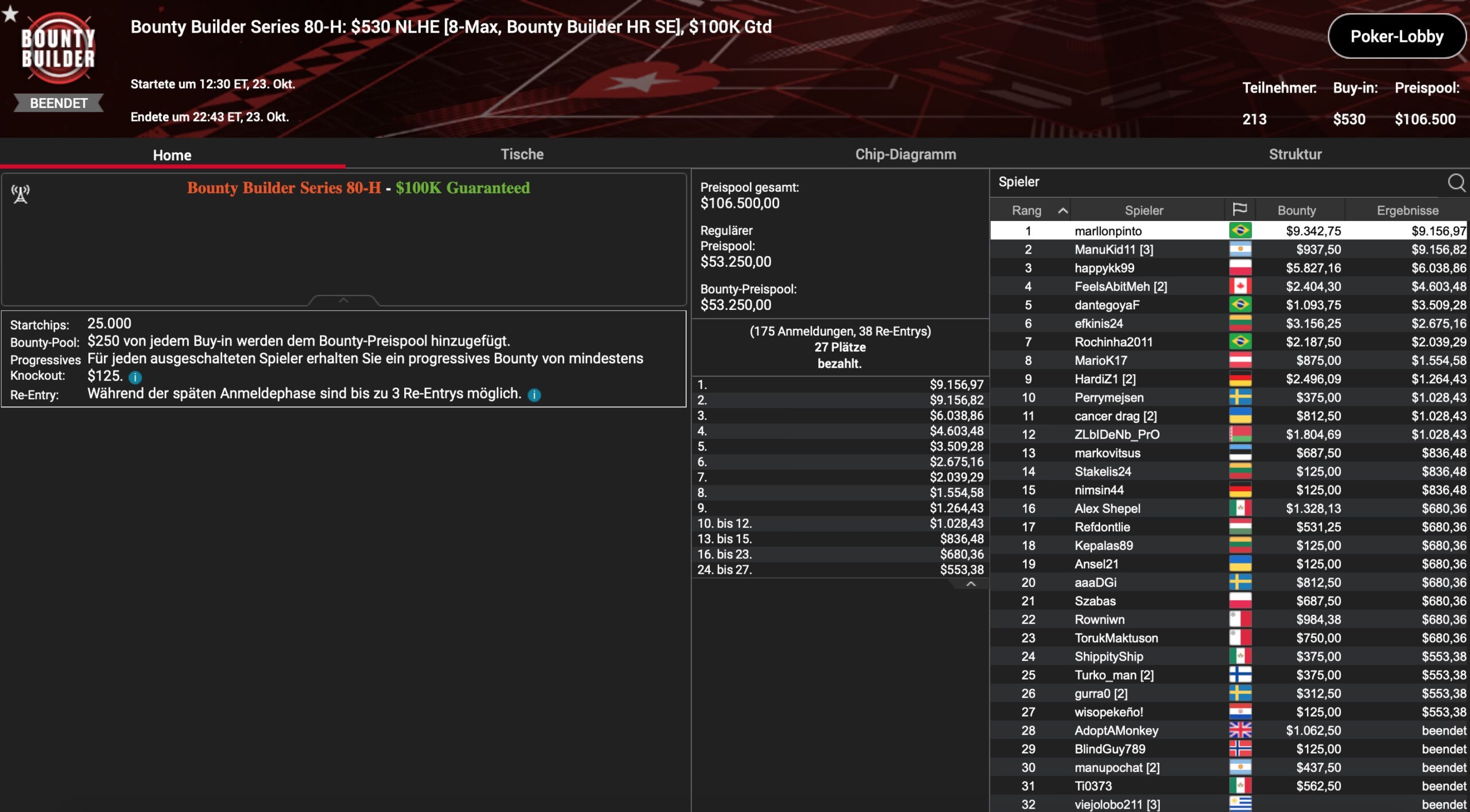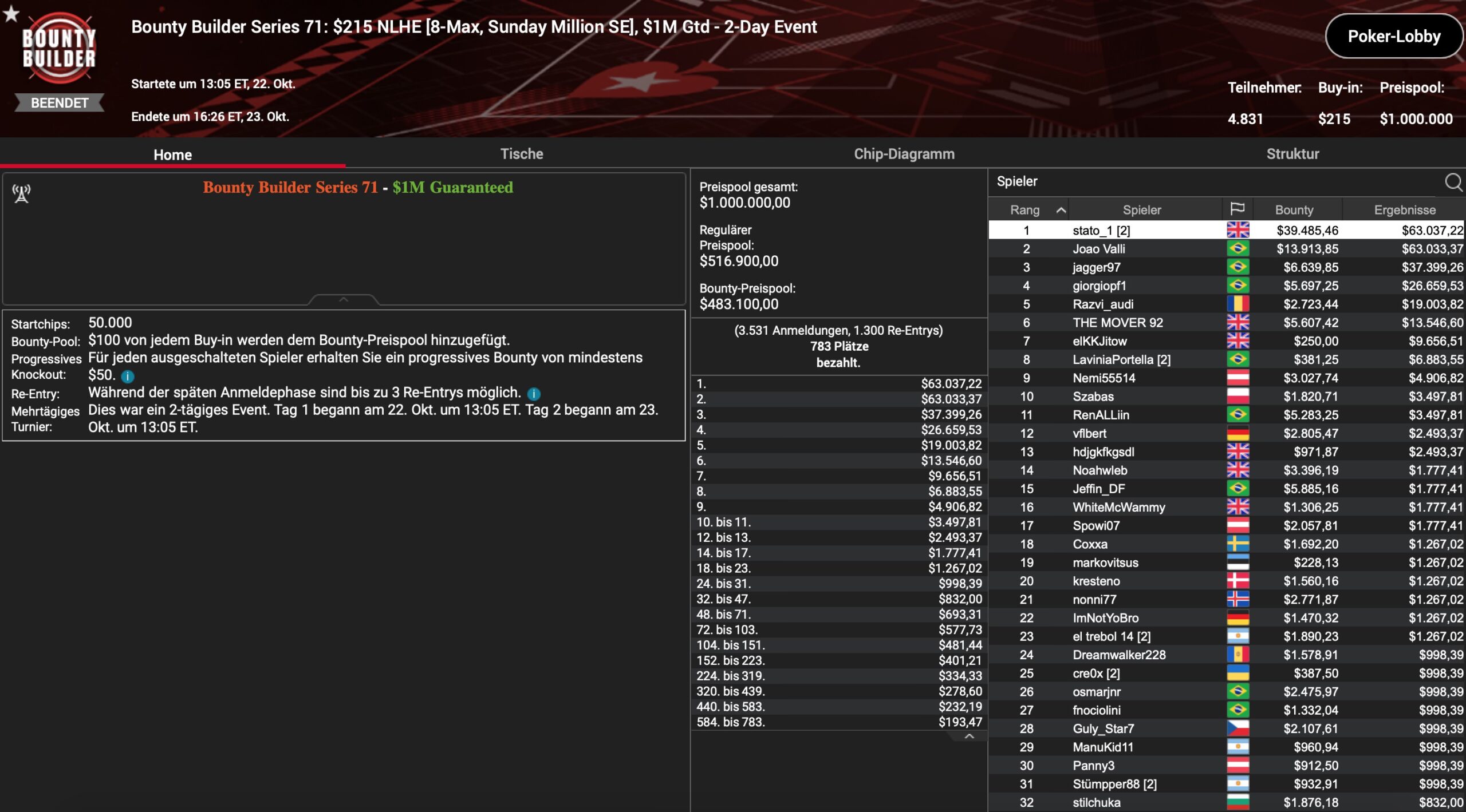 36 von ursprünglich 4.831 Total Entries (3.531+1.300) gingen am Montag in den zweiten und letzten Tag der Special Edition der Sunday Million mit einem Buy-In von $215. Über ein Overlay von $33.800 konnten sich die Spieler bei dieser Bounty Builder Edition der Million freuen. Besonders freuen konnten sich die Top-9, die nicht nur $4.906 am Final Table plus die eingesammelten Kopfgelder sicher hatten, sondern sich auch über die Pokerfans an den Rails auf Twitch und Youtube freuen konnten.