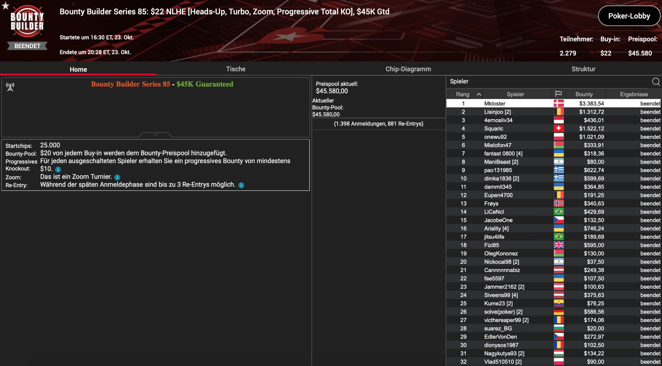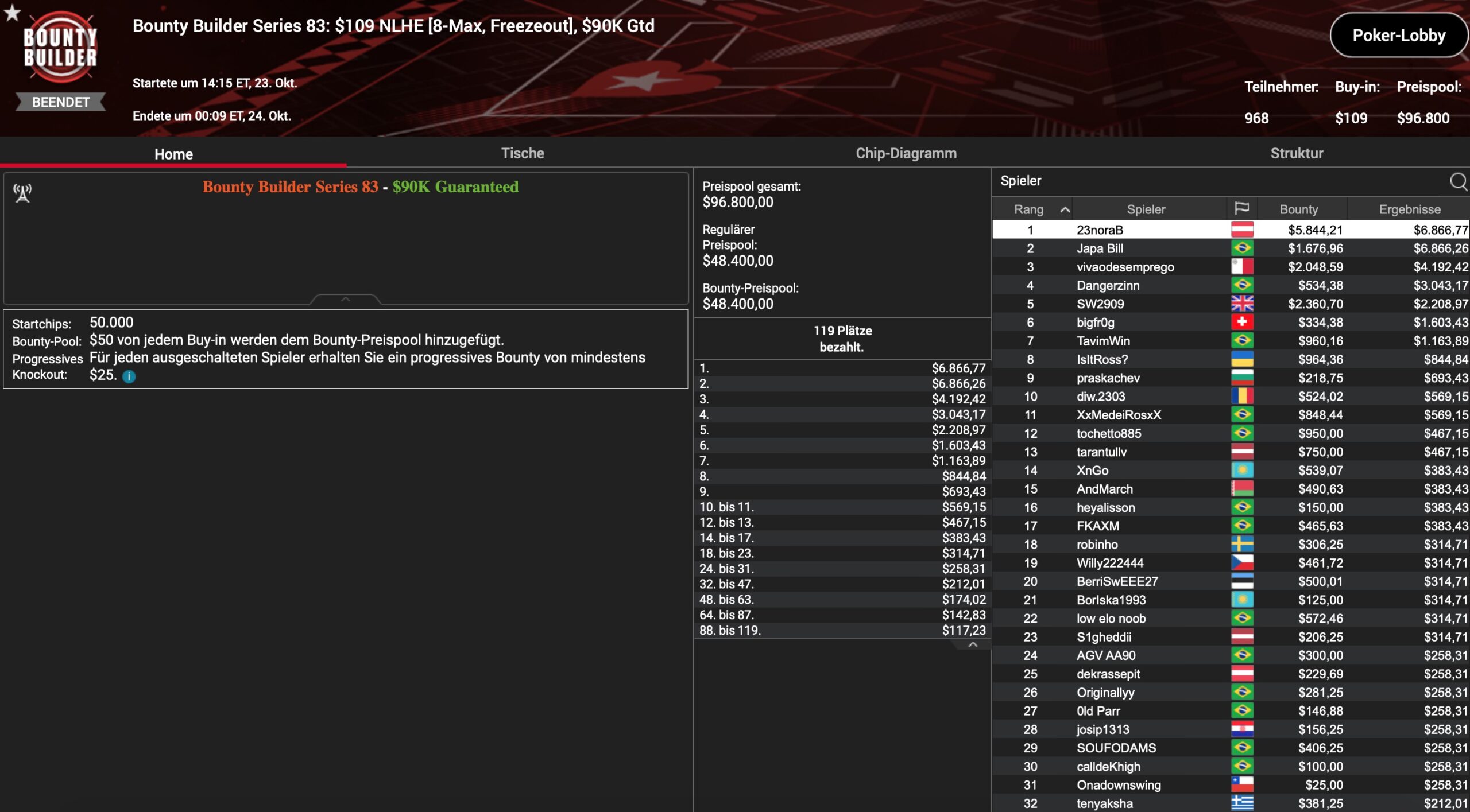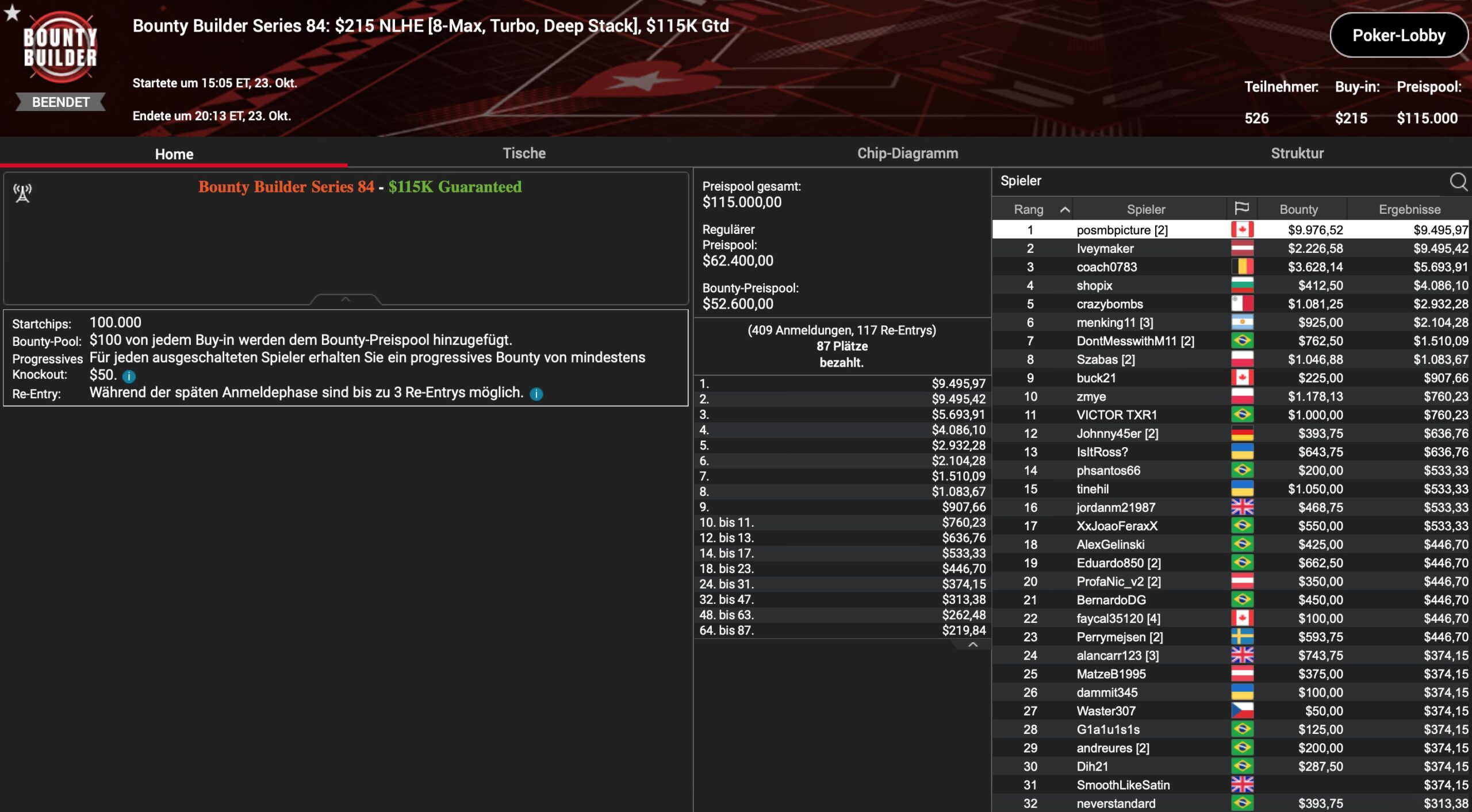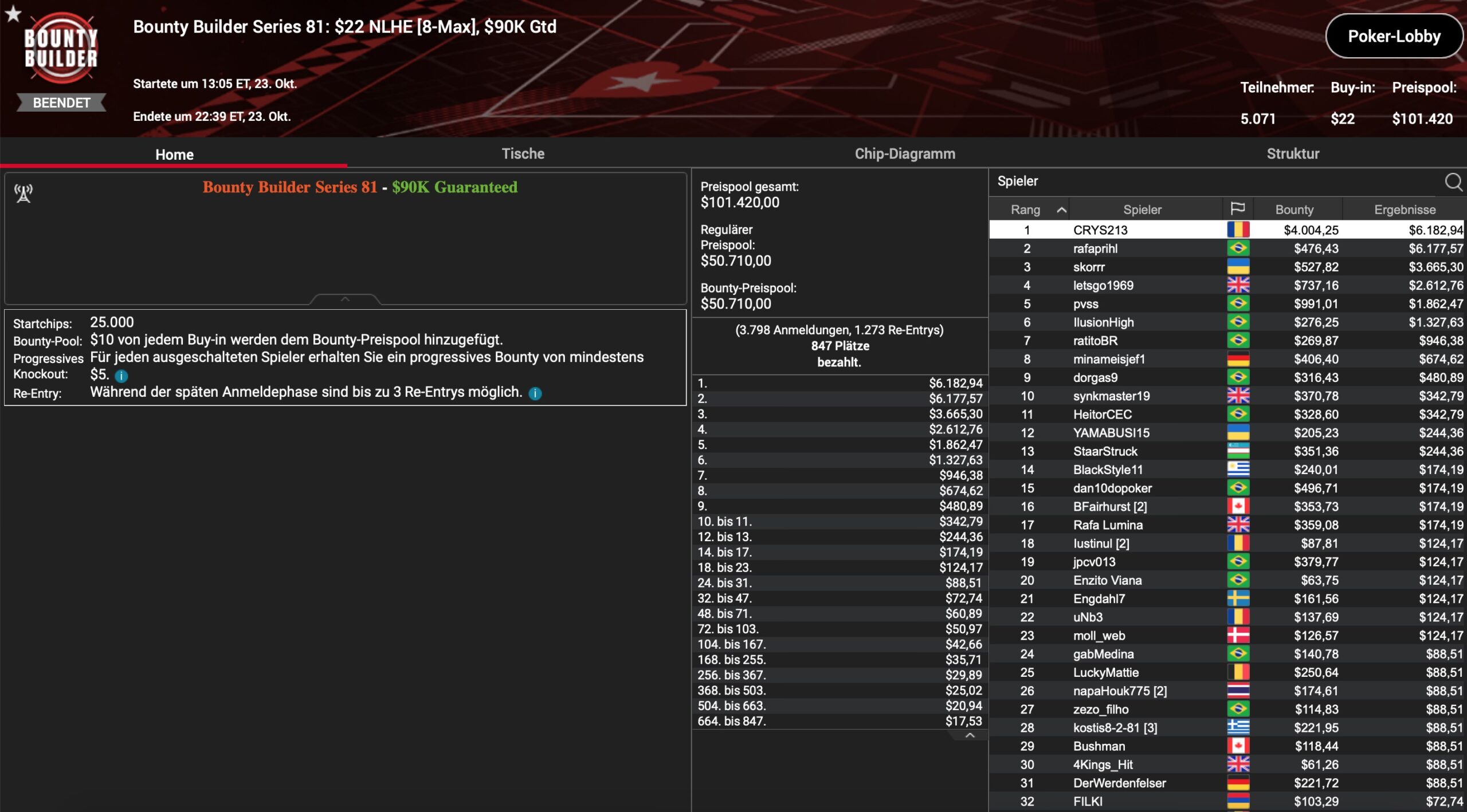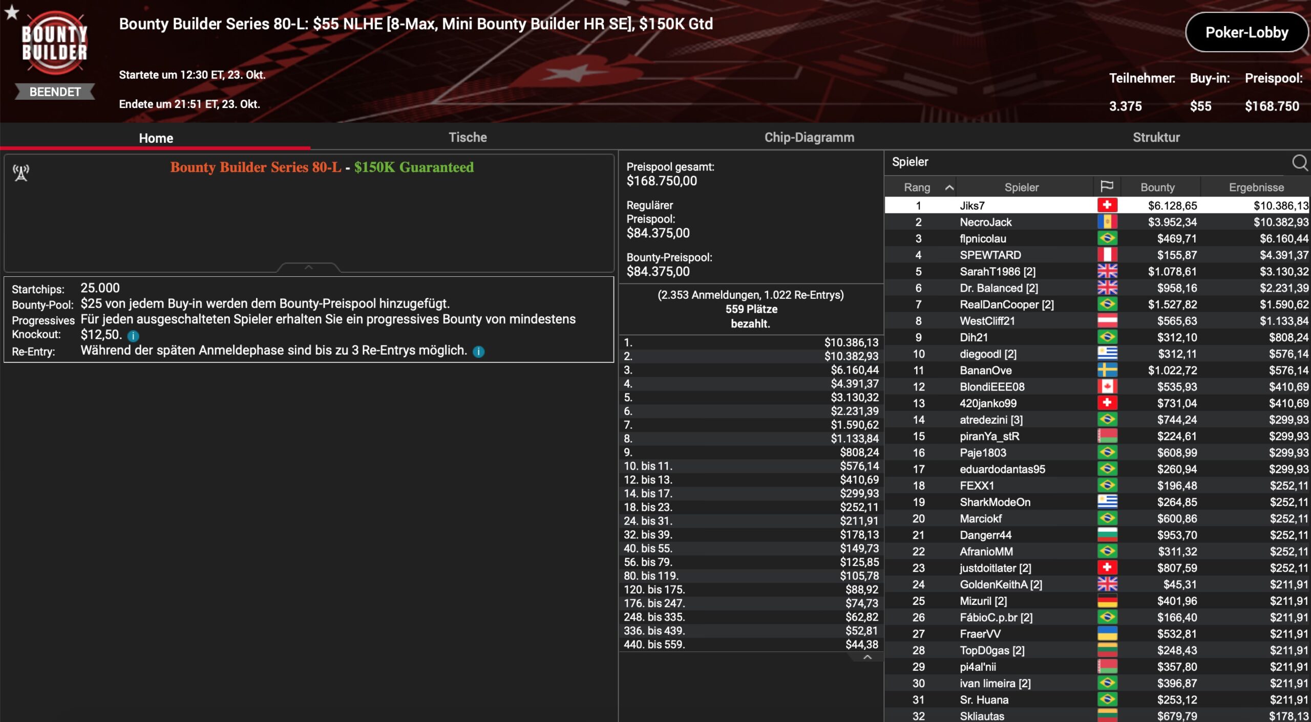 In den Bounty Builder Series Events vom Montag gab es zwei deutschsprachige Siege zu vermelden: „Jiks7“ gewann gegen 3.374 Kontrahenten das $55 NLHE (Event #80-L), was mit $16.514 belohnt wurde. „23noraB“ vollbrachte unter 968 Total Entries im $109 NLHE (Event #83) das gleiche Kunststück und wurde dafür mit $12.710 belohnt.