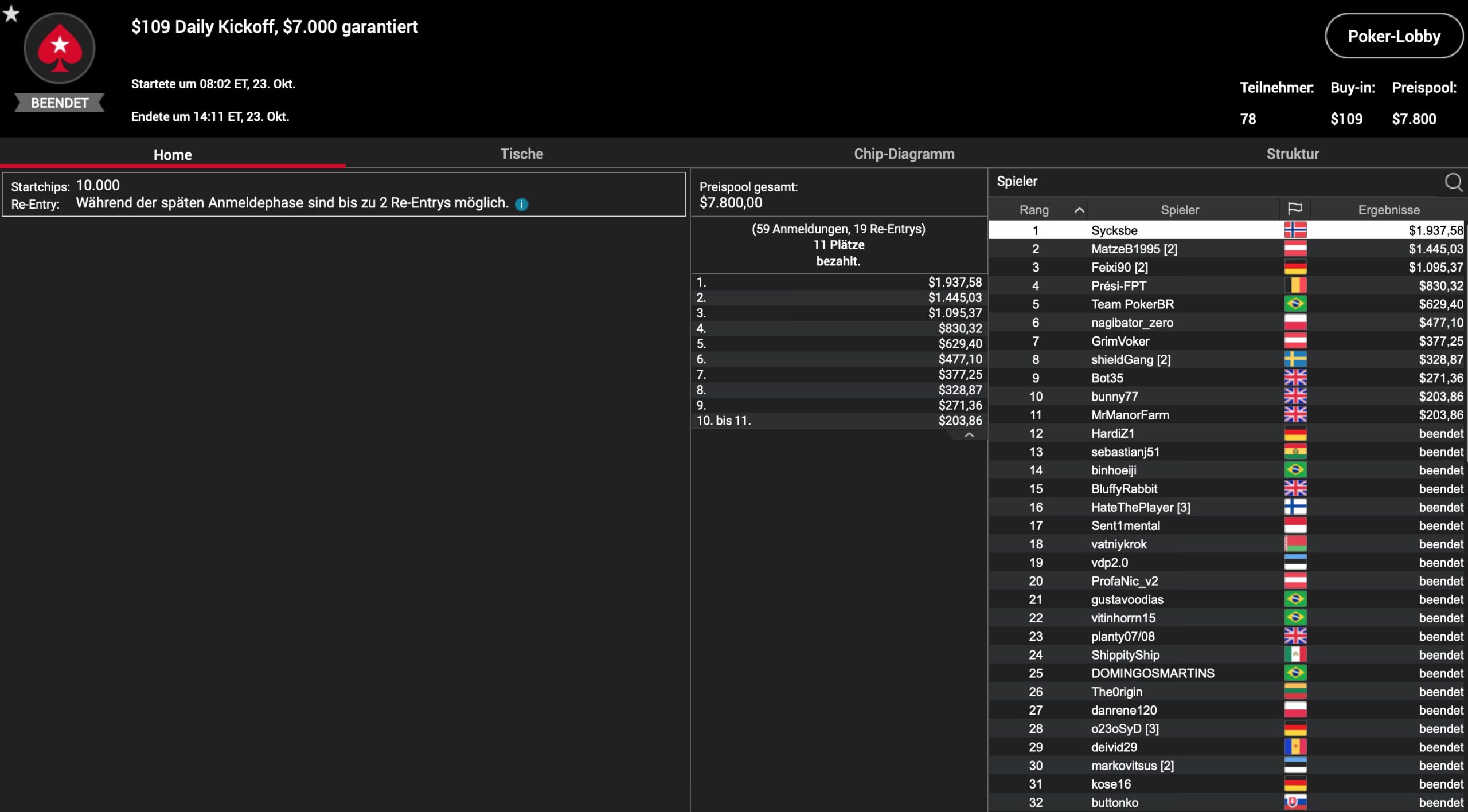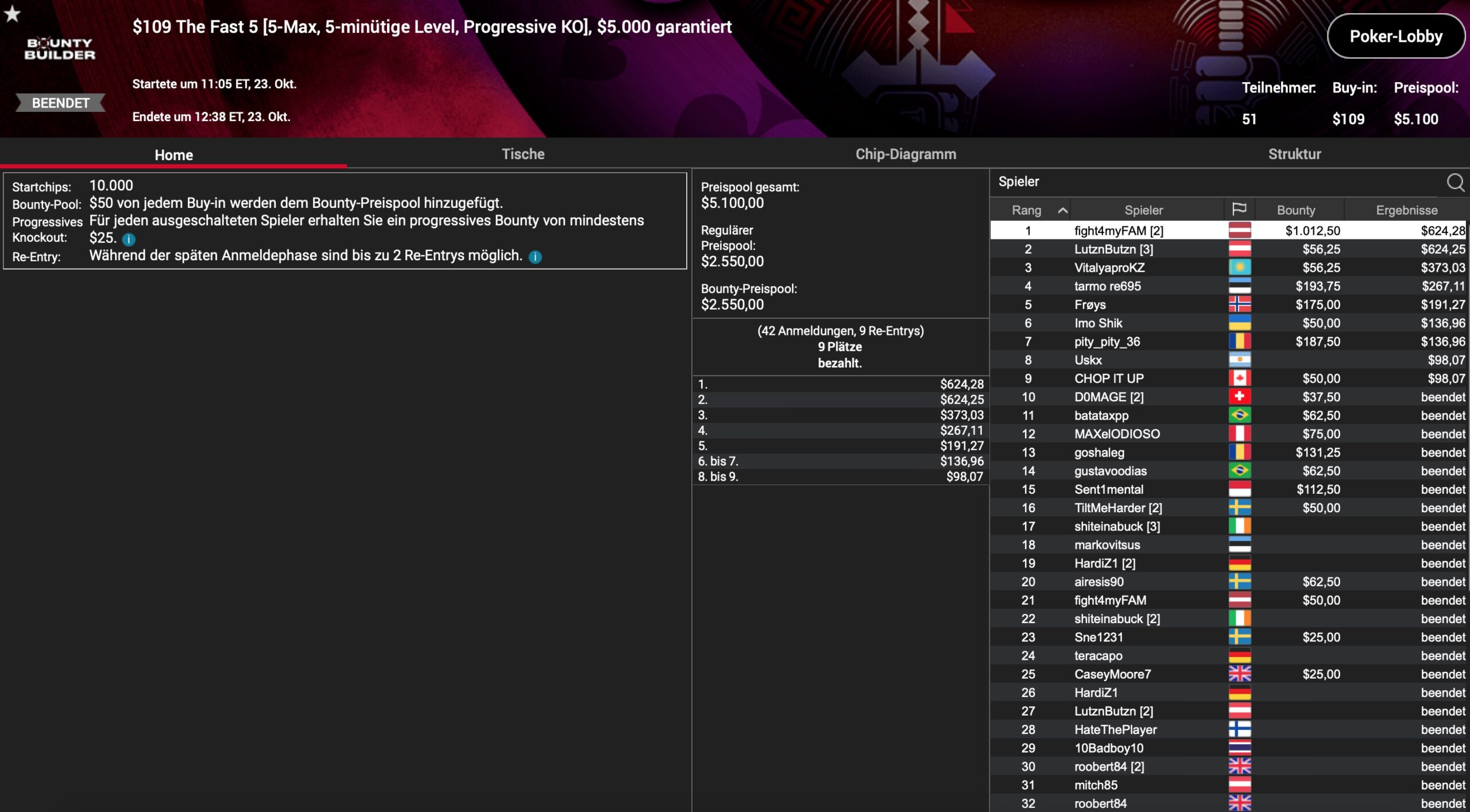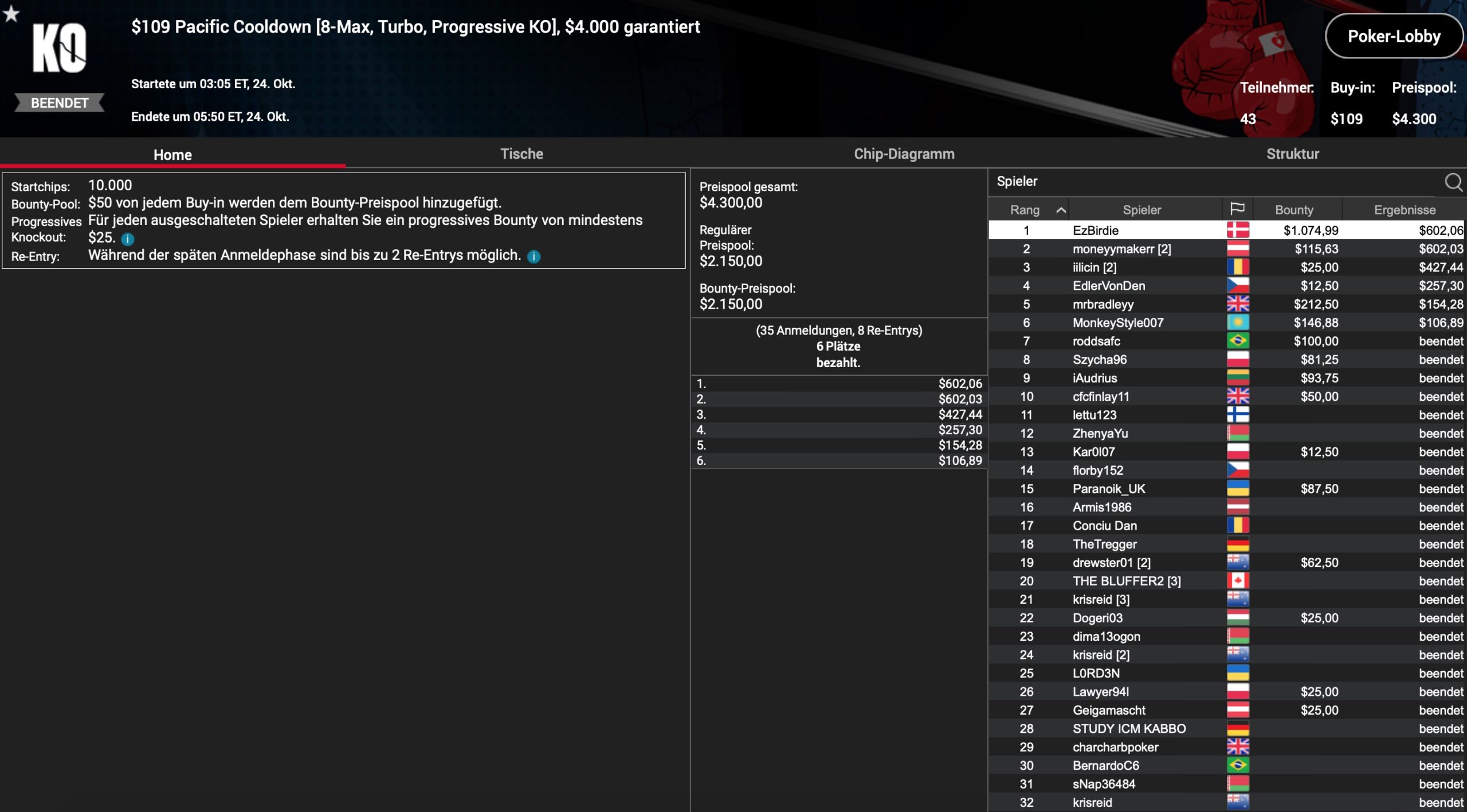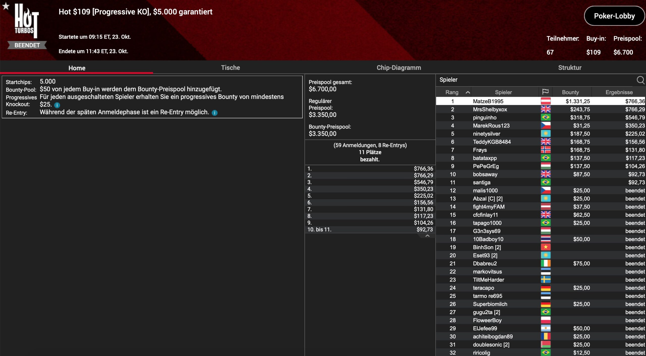 Im Buy-In Tier von Turnieren zwischen $100 und $500 gab es einige erwähnenswerte Ergebnisse. Turniersiege gab es für „GuiLeMarch“ im Bounty Builder $109 für $1.706 und „RaZorFaZor“ im Hot Hyper $109 für $2.330. Top-Platzierungen holten außerdem „Feixi90“ (3. im $109 Daily Kickoff, $1.095), „LutznButzn“ (2. im $109 The Fast 5, $680), „ProfaNic_v2“ (5. im Bounty Builder $109, $1.629), „mitch85“ (3. im $215 Monday 6-Max, $2.285), „ac3play“ (3. im $109 Fenomeno, $3.167), „babyface841“ (2. im $109 Daily Cooldwon, $3.321), „poker7starz“ (2. im $162 Pacific Rim Special, $759) und „moneyymakerr“ (2. im $109 Pacific Cooldown, $717).