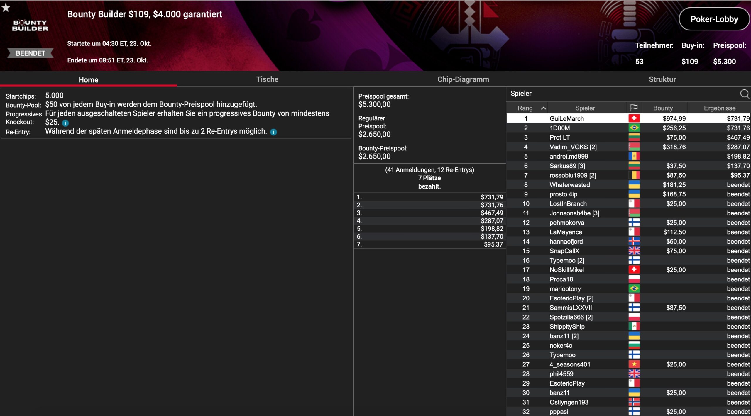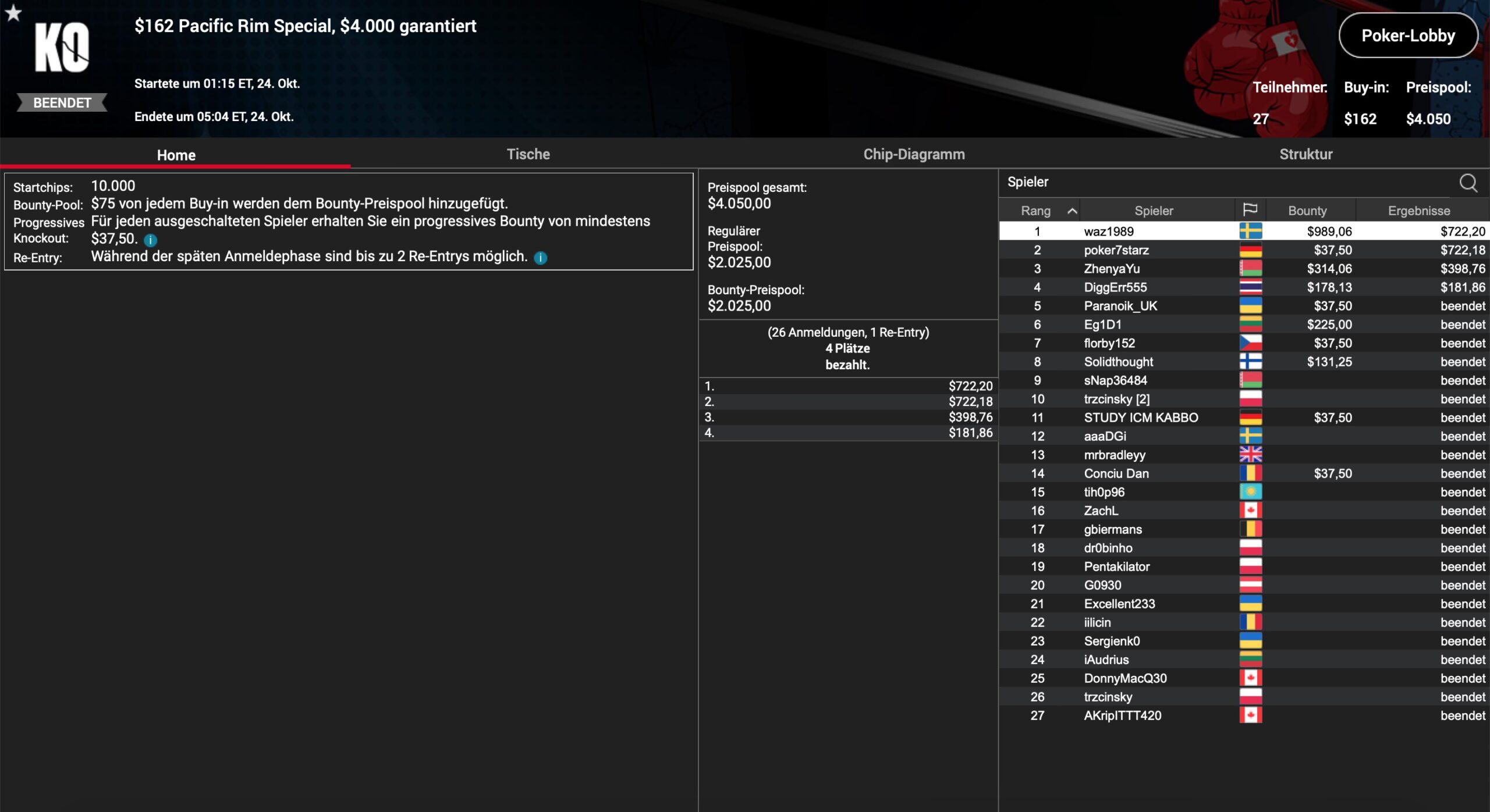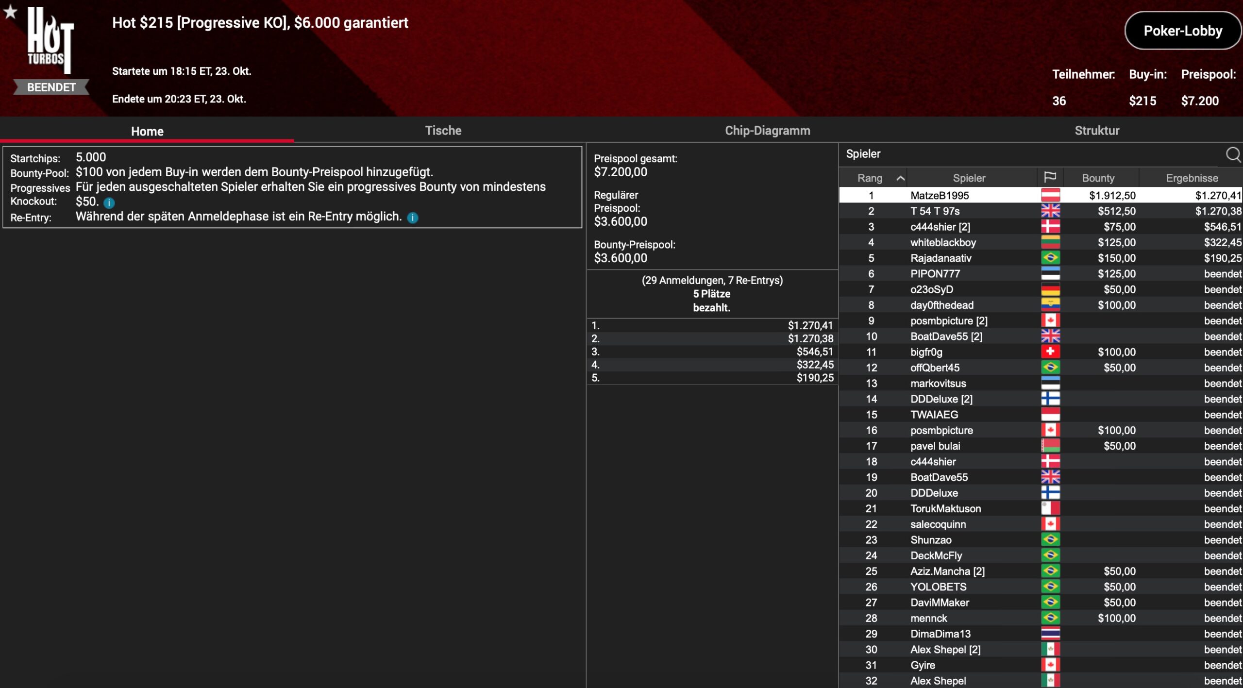 Im Buy-In Tier von Turnieren zwischen $100 und $500 gab es einige erwähnenswerte Ergebnisse. Turniersiege gab es für „GuiLeMarch“ im Bounty Builder $109 für $1.706 und „RaZorFaZor“ im Hot Hyper $109 für $2.330. Top-Platzierungen holten außerdem „Feixi90“ (3. im $109 Daily Kickoff, $1.095), „LutznButzn“ (2. im $109 The Fast 5, $680), „ProfaNic_v2“ (5. im Bounty Builder $109, $1.629), „mitch85“ (3. im $215 Monday 6-Max, $2.285), „ac3play“ (3. im $109 Fenomeno, $3.167), „babyface841“ (2. im $109 Daily Cooldwon, $3.321), „poker7starz“ (2. im $162 Pacific Rim Special, $759) und „moneyymakerr“ (2. im $109 Pacific Cooldown, $717).