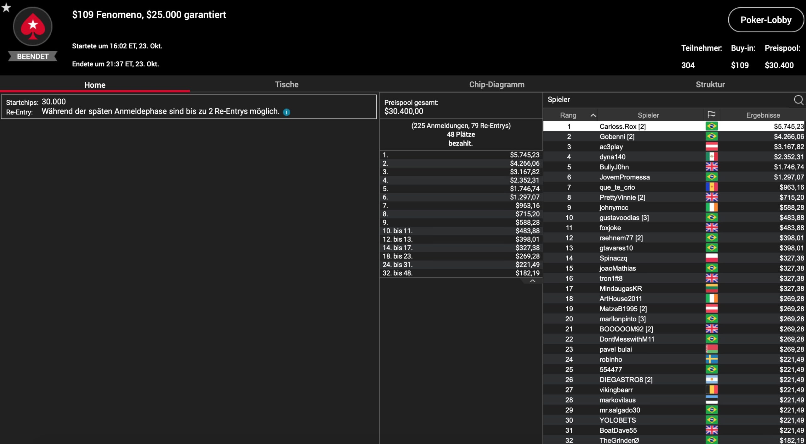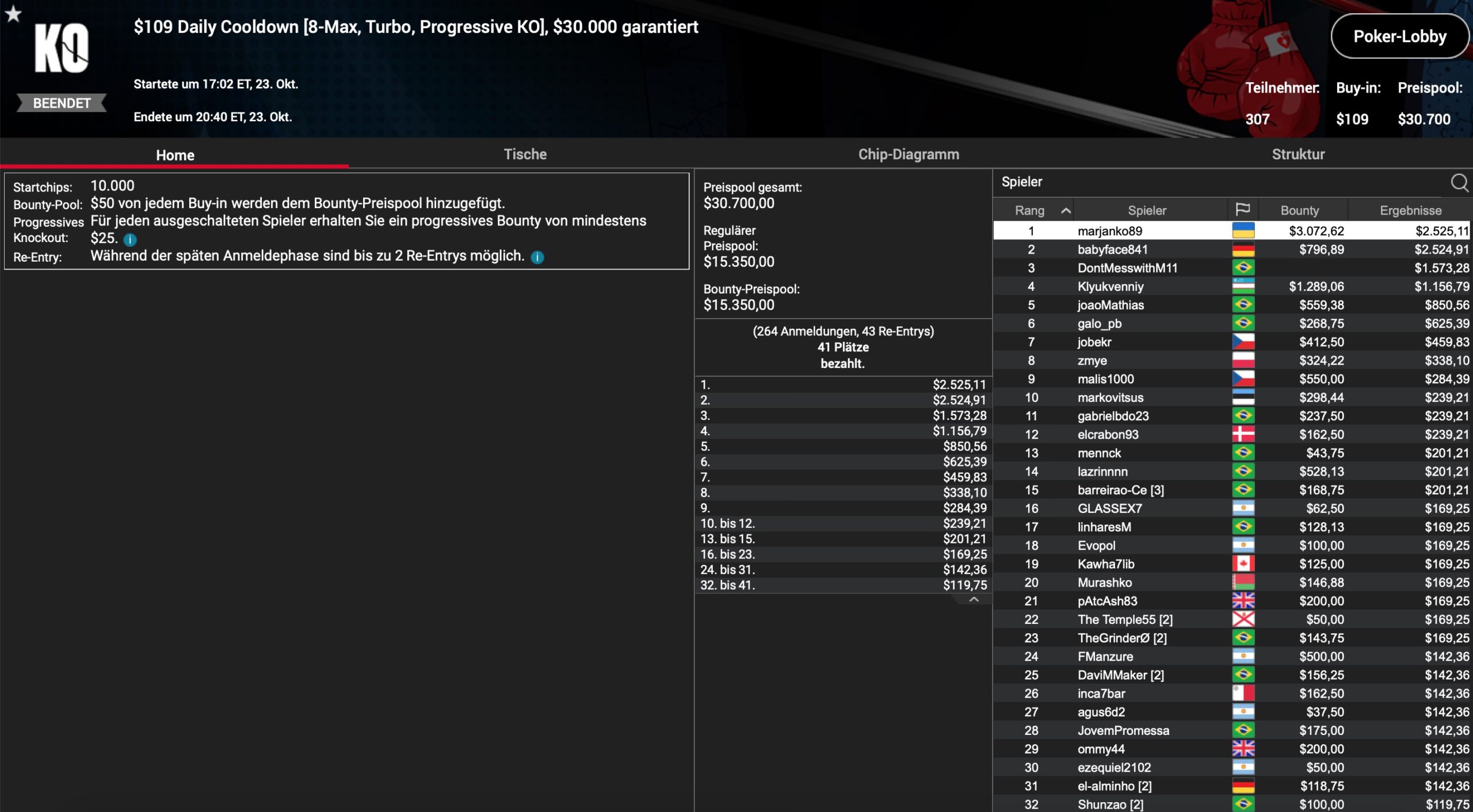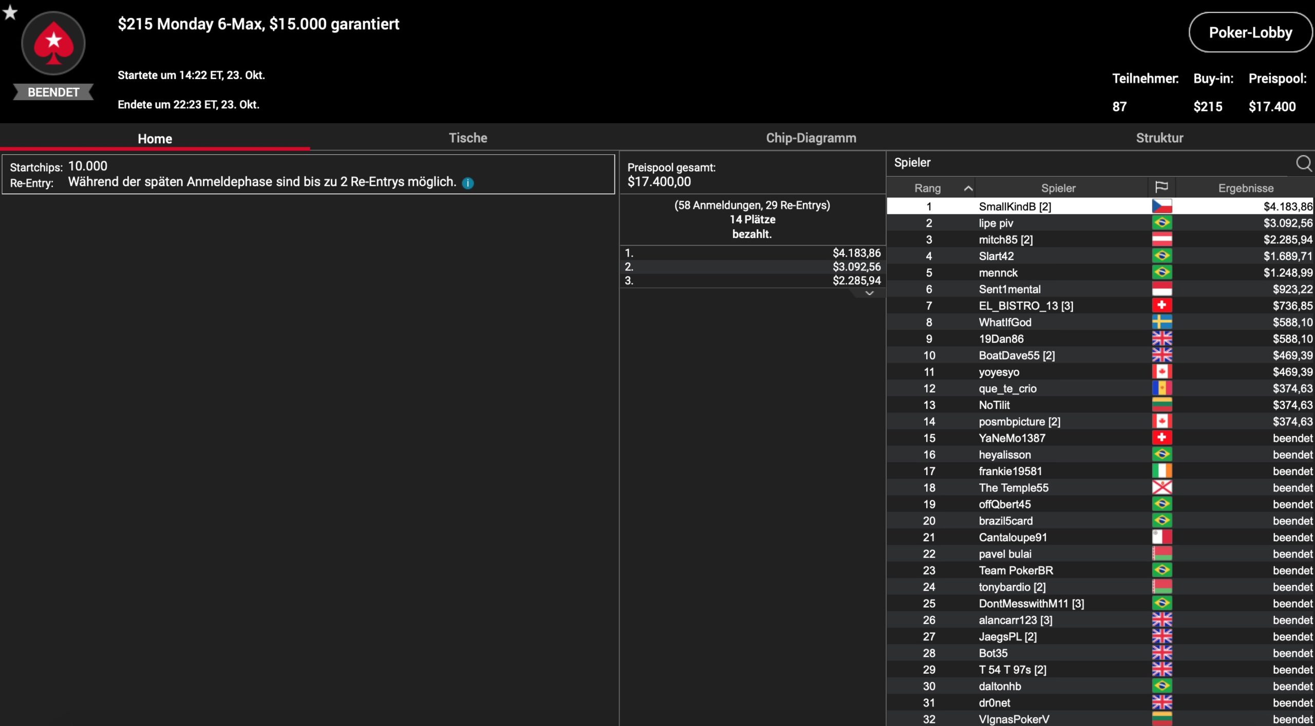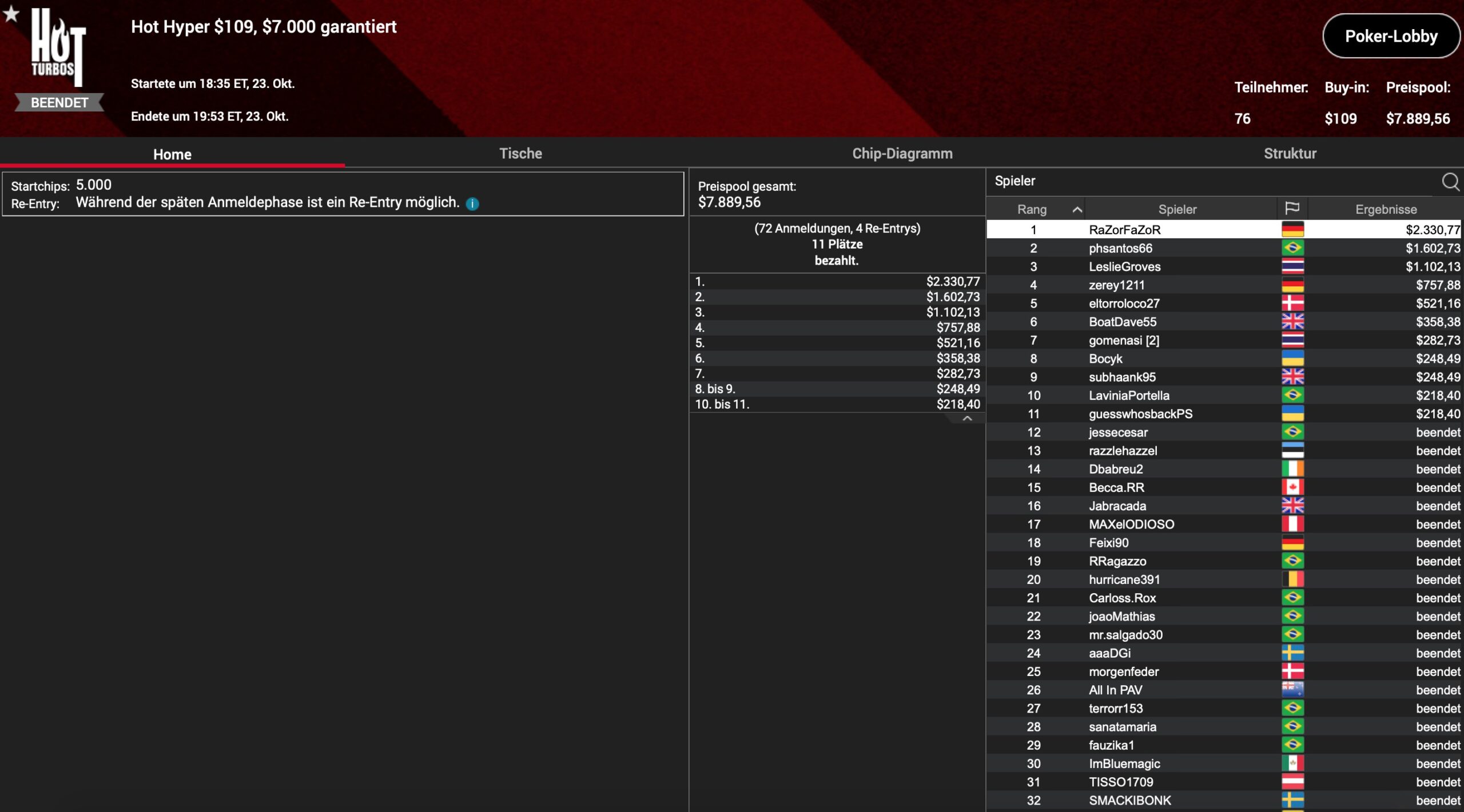 Im Buy-In Tier von Turnieren zwischen $100 und $500 gab es einige erwähnenswerte Ergebnisse. Turniersiege gab es für „GuiLeMarch“ im Bounty Builder $109 für $1.706 und „RaZorFaZor“ im Hot Hyper $109 für $2.330. Top-Platzierungen holten außerdem „Feixi90“ (3. im $109 Daily Kickoff, $1.095), „LutznButzn“ (2. im $109 The Fast 5, $680), „ProfaNic_v2“ (5. im Bounty Builder $109, $1.629), „mitch85“ (3. im $215 Monday 6-Max, $2.285), „ac3play“ (3. im $109 Fenomeno, $3.167), „babyface841“ (2. im $109 Daily Cooldwon, $3.321), „poker7starz“ (2. im $162 Pacific Rim Special, $759) und „moneyymakerr“ (2. im $109 Pacific Cooldown, $717).