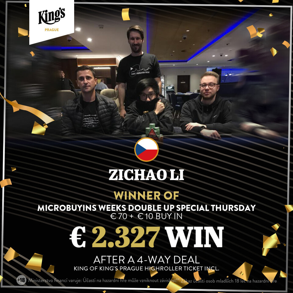 Unter den 15 ITM Finishern waren gleich 13 aus Tschechien. Am Final Table, sah es dann ähnlich aus: 8 von 9 Plätze gingen an die Gastgebernation, allein Roy Gal konnte als Deutscher den Tschechischen Final Table Shutout verhindern. Six-handed wurde es sehr spannend am Finaltisch, da für die Top-5 jeweils ein €500 High Roller Ticket für das nächste King of King’s im Preispool lag. Leider war es ausgerechnet Roy Gal, der auf der Ticket Bubble bustete. Trotzdem konnte er immerhin €637 Payout mitnehmen. Nachdem auch der tschechische Regular „Martin Reza“ auf Rang 5 (€1.315) gebustet war, einigte sich das verbleibende tschechische Quartett auf einen Deal. Die 4er-Teilung brachte Kirill Panyushin €2.079, Mikita Andreichykau €2.230, Timothy Friese €2.324 und Zichao Li €2.327 sowie den offiziellen Turniersieg ein.