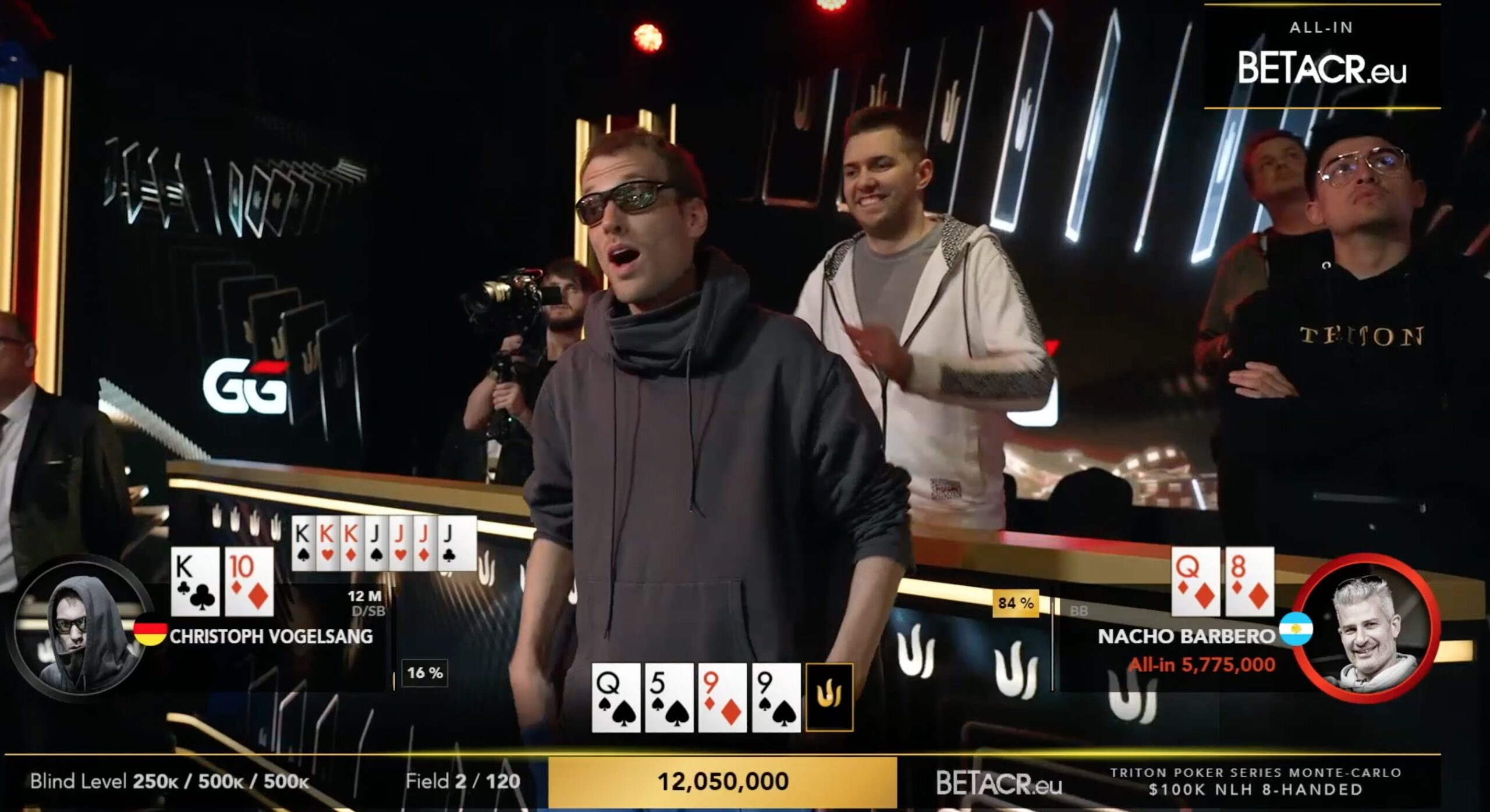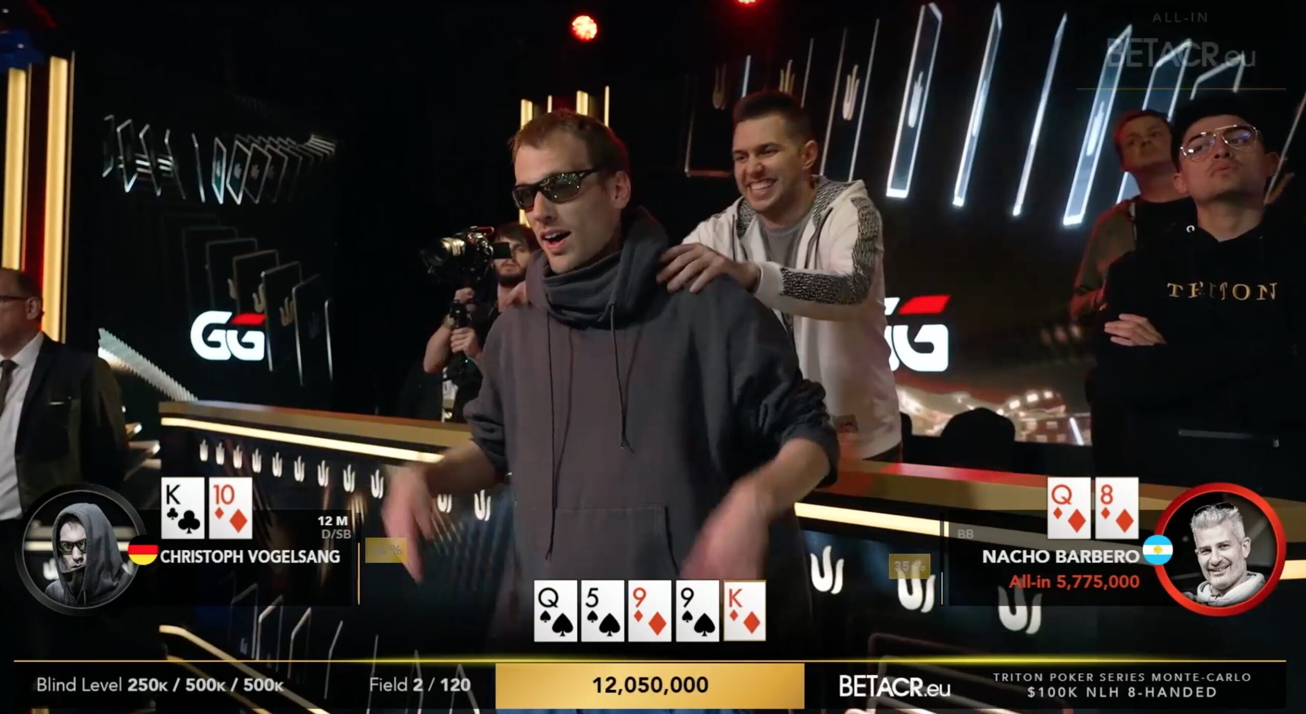 Dann kam es zu wahrscheinlich vorentscheidenden Hand: Aus dem BB füllte der Deutsche mit 77 nur auf und Barbero checkte mit 65s. Die Donkbet des Südamerikaners mit Midpair aud dem Flop J-6-3 callte Vogelsang. Der Turn, brachte mit der Pik-5 das dritte Spade, und damit Vogelsang einen Inside Straight Flush Draw und auf der anderen Seite Barbero Two-Pair. Der Turn endete ckeck-check. Die River war eine 7. Nach dem Check von Vogelsang setzte Barbero auf dem River, worauf der All-In-Shove des Deutschen kam. Nach einiger Bedenkzeit callte der Chipleader, und war sichtlich und wörtlich darüber erbost, dass der River nicht geblankt hat. Von nun an war der D-A-CH-Spieler wieder Chipleader, während der Argentinier nicht über die soeben verlorene Hand hinweg kam und weiter haderte. Nur wenige Hände später kam es dann zum finalen All-In von Barbero mit Q8s, was von Vogelsang mit KTo gecallte wurde. Der Wahl-Londoner begab sich zu seiner moralischen und taktischen Stütze, Matthias Eibinger, an die Rails und gemeinsam sweateten sie an den Rails, wo sich Vogelsang vor der entscheidenden Kartenfolge bekreuzigte. Der Flop meinte es mit einer Q im Board gut mit Barbero, der neben 4 zweiten Plätzen schon einen Triton Titel in der Vergangenheit gewinnen konnte. Die 9 auf dem Turn änderte nichts, doch auf dem River materialisierte sich auf einmal der König, der Vogelsang die Checkmark, den Turniersieg und unglaubliche $2.644.000 sicherte. Die Freude darüber war nicht nur bei Eibinger zu sehen, auch Vogelsang feierte den lang ersehnten Turniererfolg mit Fist Pump und Luftsprung.
