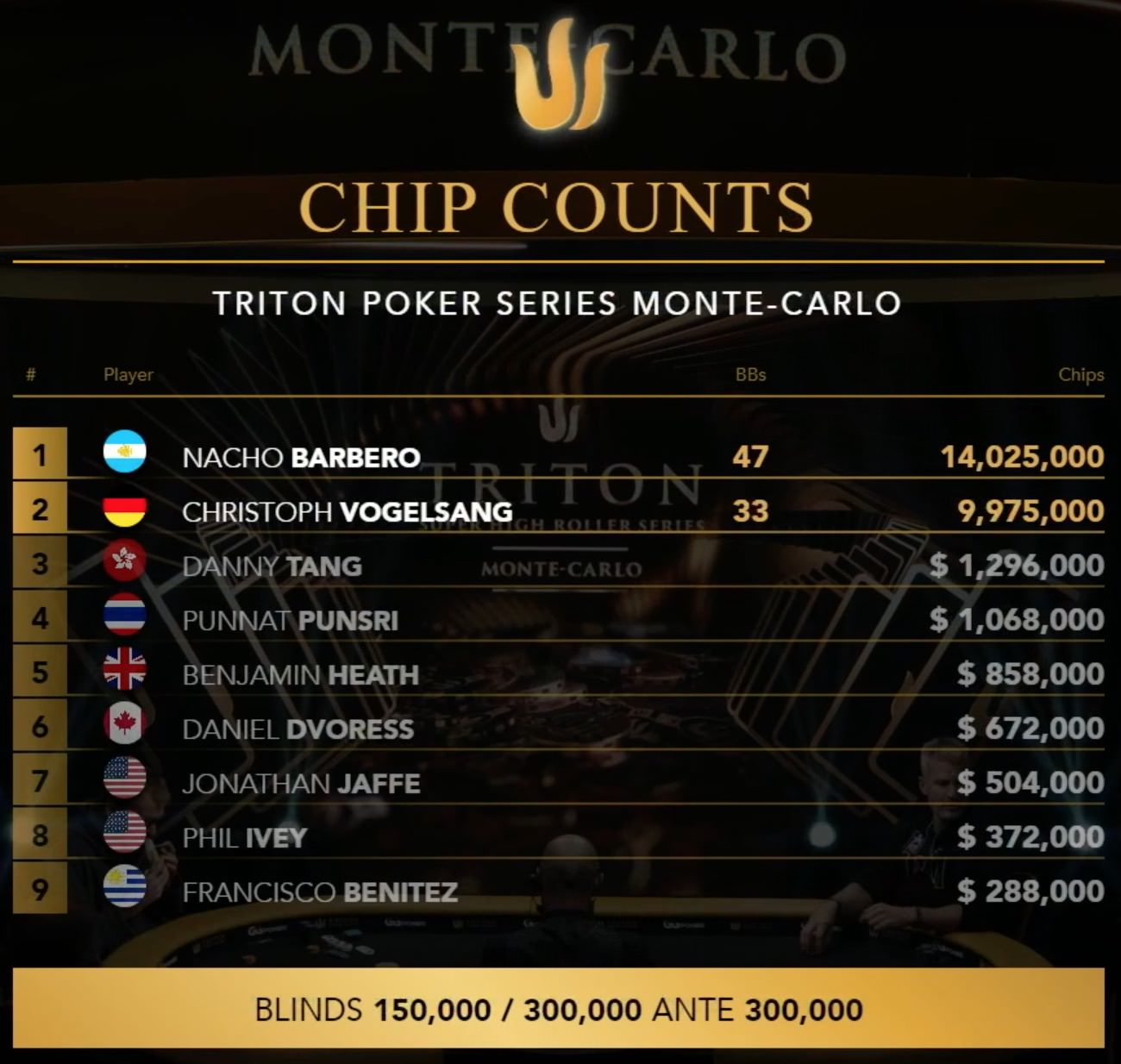 Die Tipps des Pokercode-Gründers schienen gefruchtet zu haben, denn der 38-jährige spielte jetzt im Heads-Up um die Triton Trophäe und mehrere Millionen Preisgeld. Das wurde vor dem Heads-Up jedoch noch einmal umverteilt, da sich der Argentinier (47 BBs) und der Deutsche (33 BBs) auf einen Deal einigten, der Vogelsang $2.144.000 und Barbero mit $2.198.000 lediglich $53.000 mehr sicherte. Dafür ließen sie $500.000 zum Ausspielen im Topf – deutlich mehr als normalerweise bei Triton Turnieren beim Kampf um die Trophäe im Preispool belassen wird. Anscheinend fühlte einer der beiden oder beide sich sehr sicher an diesem Sonntag den Kontrahenten und die Varianz zu schlagen.