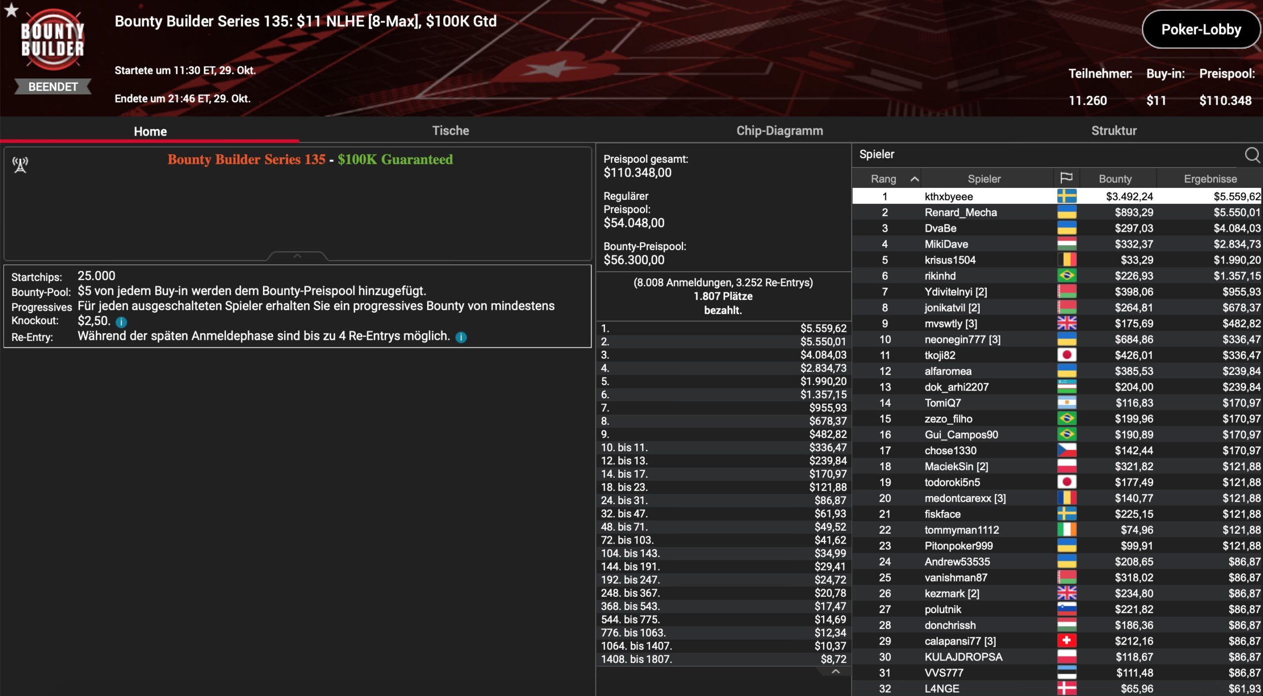 In den High Roller Turnieren konnten „HardiZ1„, Paul „_paul€FauL_“ Höfer, Roman „Gogac sniper“ Hrabec an Finaltischen cashen. Die besten Platzierungen fuhren „GHOSTFACE9.8“ als Runner-Up im PLO Sunday und Jakob „Succeed“ Miegel als Sieger im $530 Bounty Builder High Roller ein.