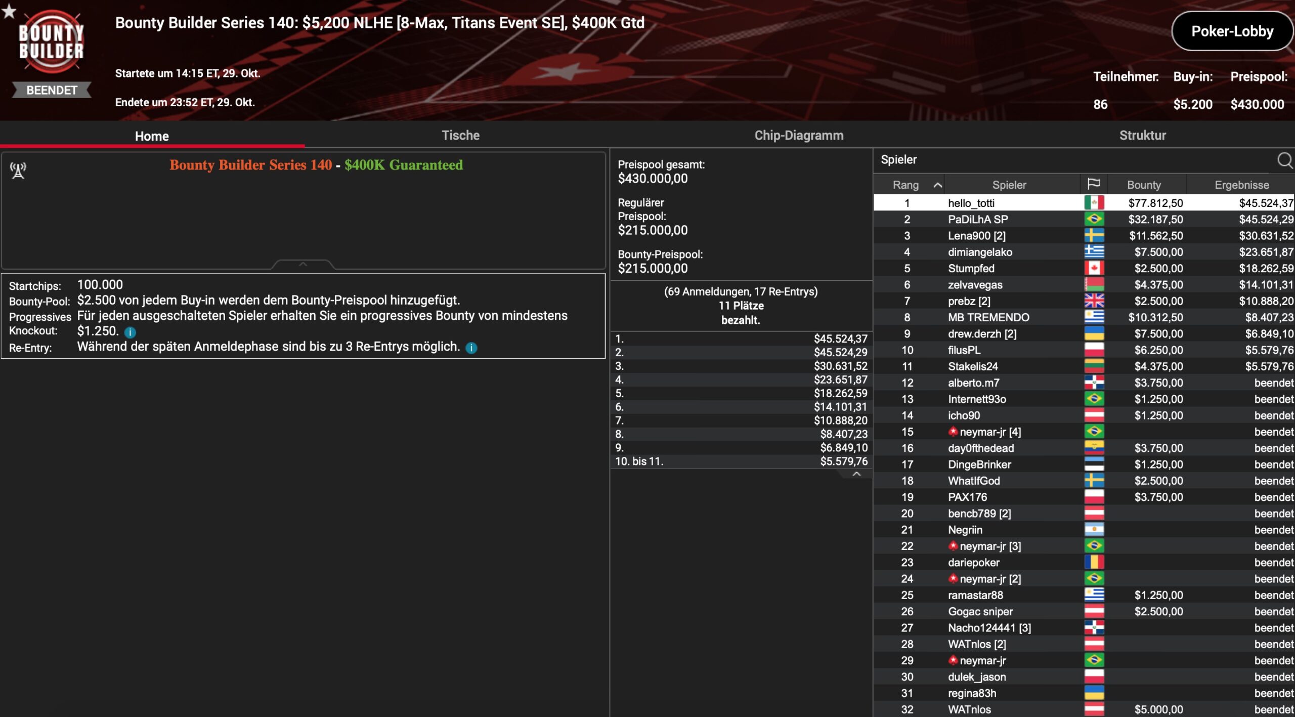 Im $5.200 Titans Event (Event #140) war es „hello_totti“ (MEX) mit über $120k Payout, der das teuerste Turnier der Woche vor „PaDiLhA SP“ (BRA) und der Online-Legende „Lena900“ (SWE) gewinnen konnte. Auch gestern war „neywar-jr“ wieder in prominenter Rolle in den High Roller Turnieren vertreten – diesmal allerdings als Wal unter den Haien. 4 Bullets ohne einen Cash im Titan’s Event kosteten die brasilianische Fußballegende allein hier $20.800.